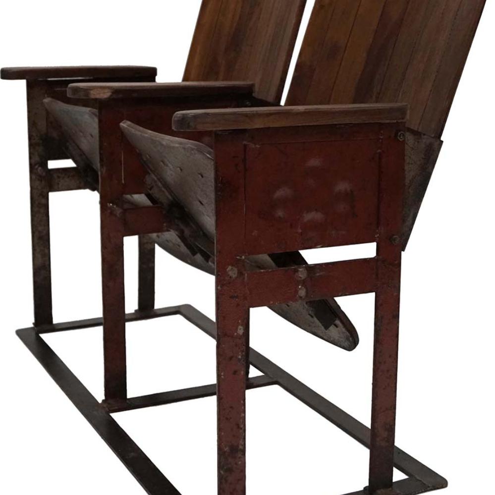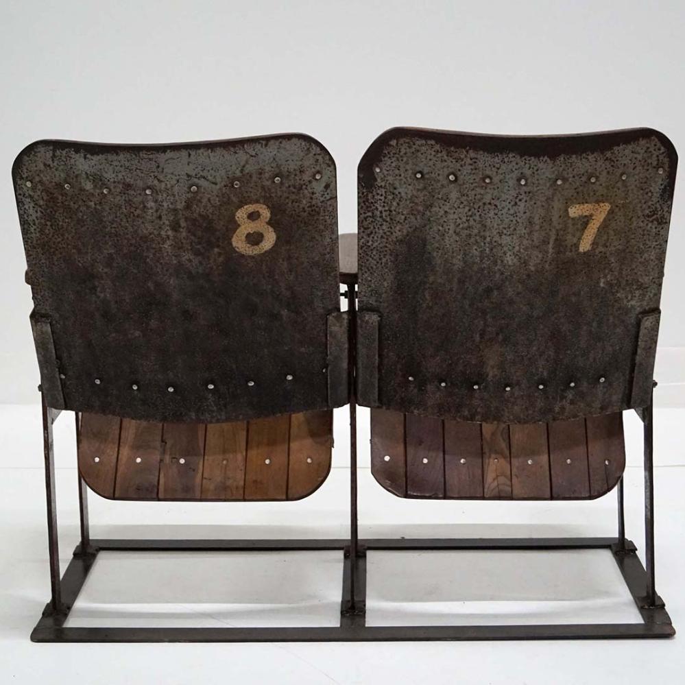 Eine authentische und charmante Kinobank mit 2 Sitzen, die vom Lauf der Zeit geprägt und voller Geschichte ist. Die Sitze bestehen aus massiven Holzlamellen mit einer wunderschönen Patina, während der Rahmen aus Metall gefertigt ist und ein industrielles, rustikales Flair verleiht. Diese Bank ist eine perfekte Kombination aus Funktionalität und Nostalgie – ideal für alle, die ein Möbelstück mit Persönlichkeit suchen. Die Armlehnen und das klassische Design machen die Bank komfortabel, während ihr abgenutzter Look Charakter und Wärme in den Raum bringt. Verwenden Sie sie als auffälliges Detail im Eingangsbereich, als Sitzgelegenheit in einem Geschäft oder Café oder als einzigartiges Element in einer gemütlichen Ecke Ihres Zuhauses. Ein Möbelstück, das Geschichte in jede Einrichtung bringt Bitte nehmen Sie zur Kennstnis: Dass die Kinobänke, die wir bekommen, nummeriert sind, ist keine Selbstverständlichkeit.