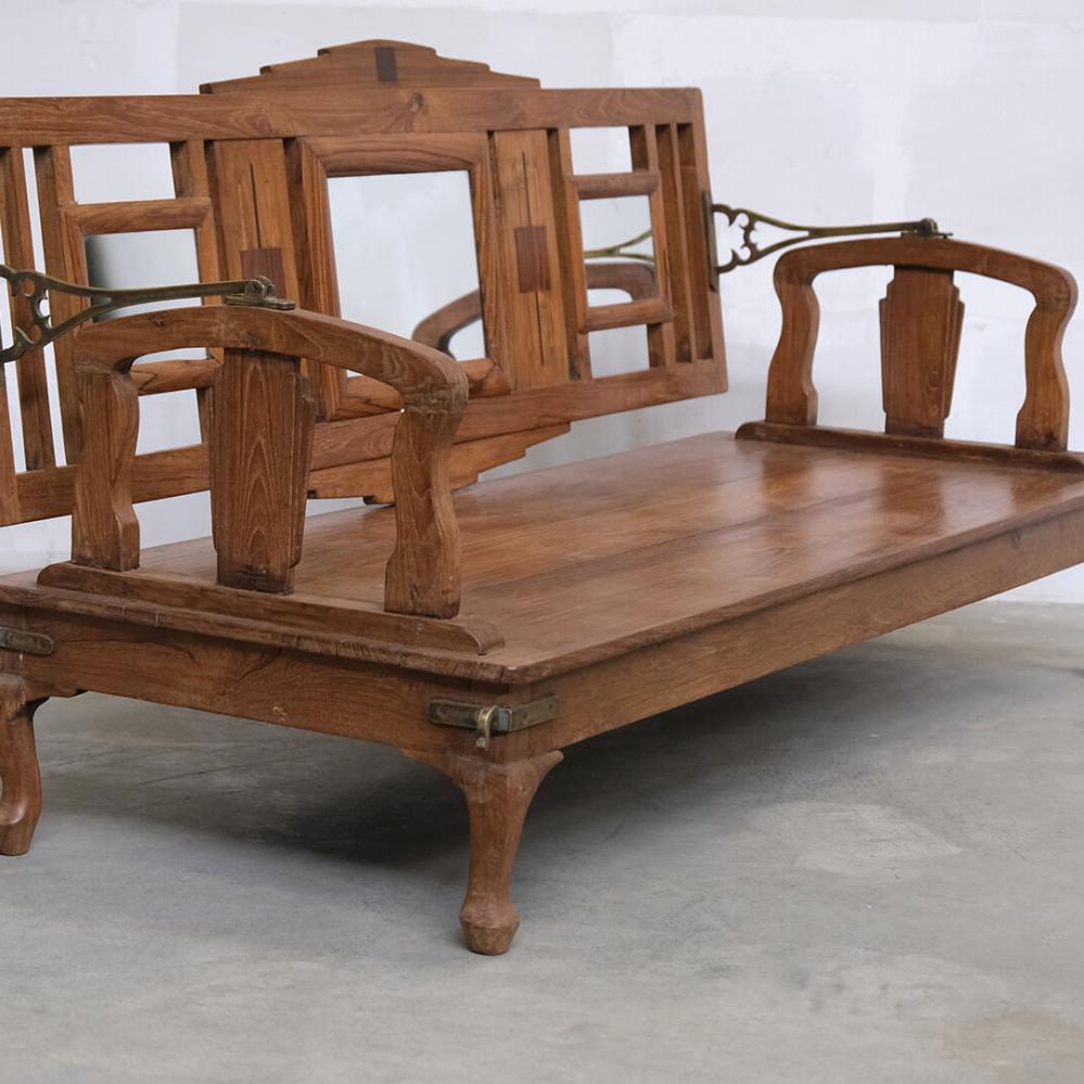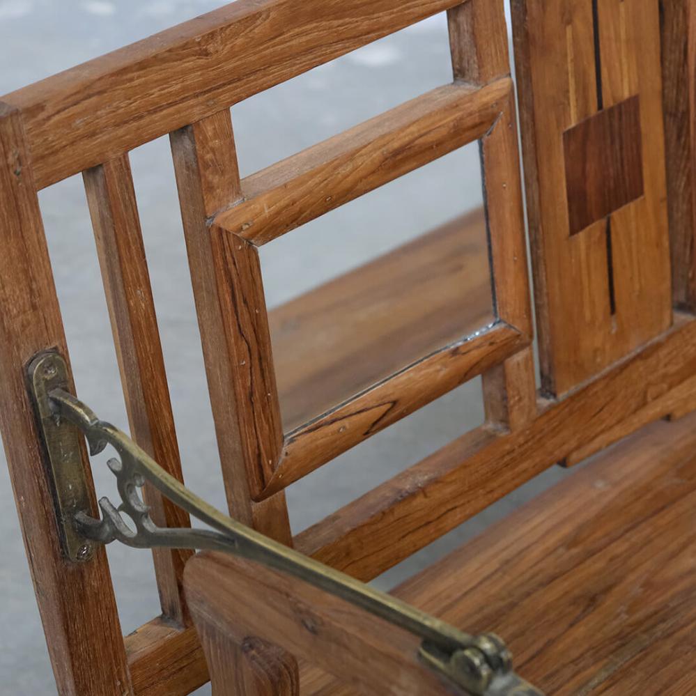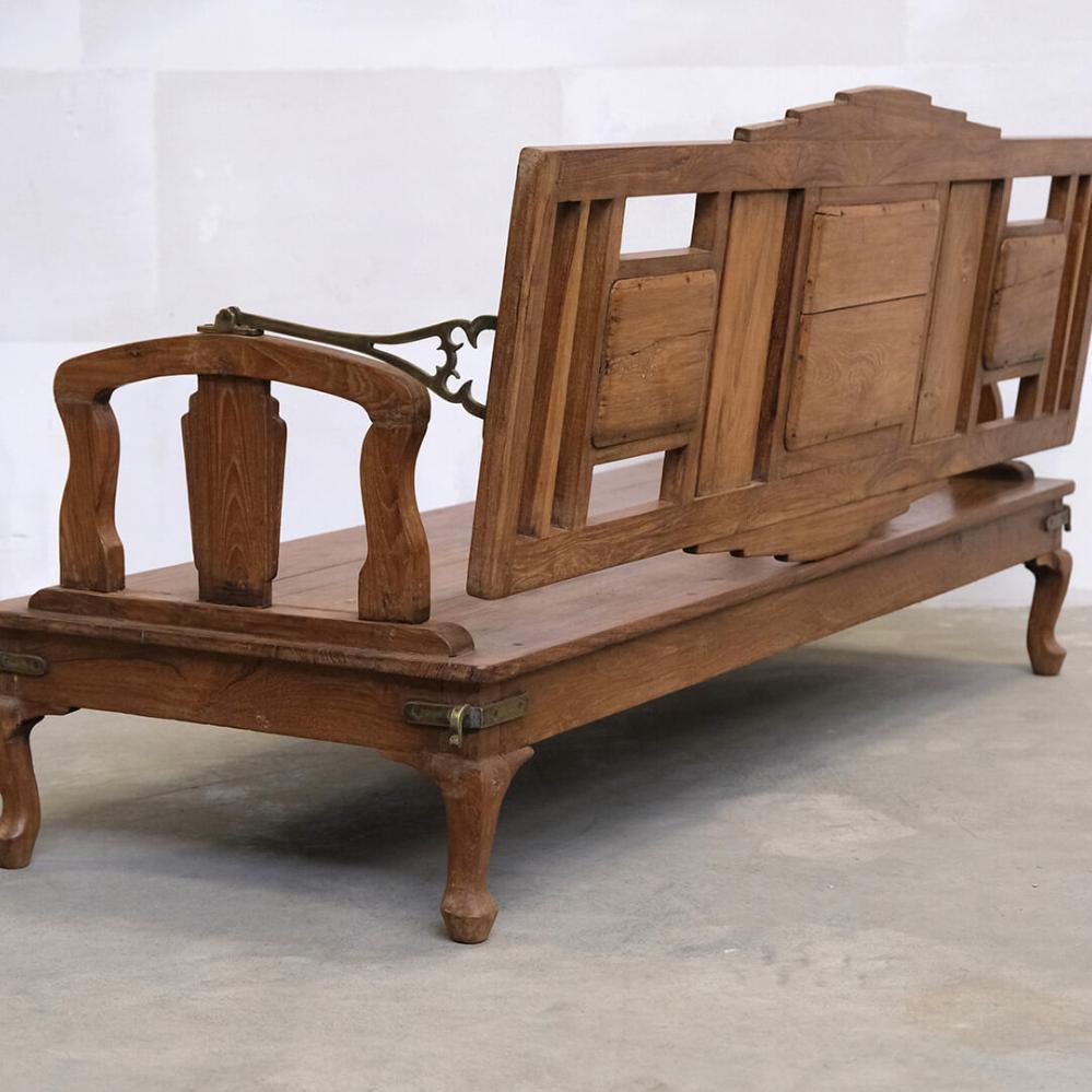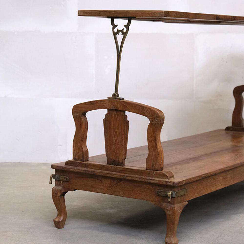 Tolle alte Holzbank, die die schönsten und lustigsten Details hat. Sie können nämlich die Rückenlehne über die Sitzbank hochschwenken und so von beiden Seiten nutzen. Außerdem hat die Bank 3 Spiegel in der Rückenlehne und fein geschwungene Beine.