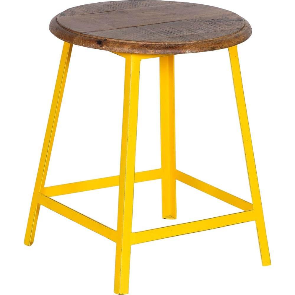 Dieser Hocker ist eine frische und auffällige Kombination aus modernem Design und natürlichen Materialien. Das gelbe Gestell verleiht einen Hauch von Farbe und Energie, während der dunkle, runde Holzsitz einen schönen Kontrast schafft und dem Hocker eine warme, rustikale Note verleiht. Das robuste Metallgestell sorgt für Stabilität und Langlebigkeit, während die natürliche Patina des Holzes Charme und Persönlichkeit hinzufügt. Dieser Hocker ist perfekt, um ein farbenfrohes und tolles Element in jeden Raum zu bringen, sei es in einem Café, einer Küche oder einer Bar.
