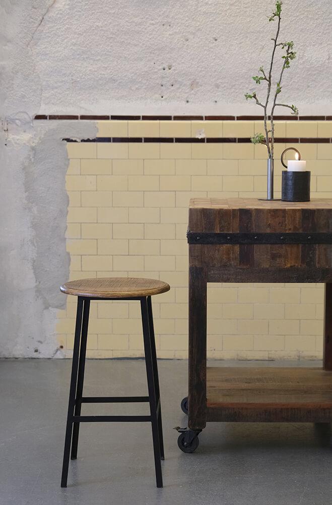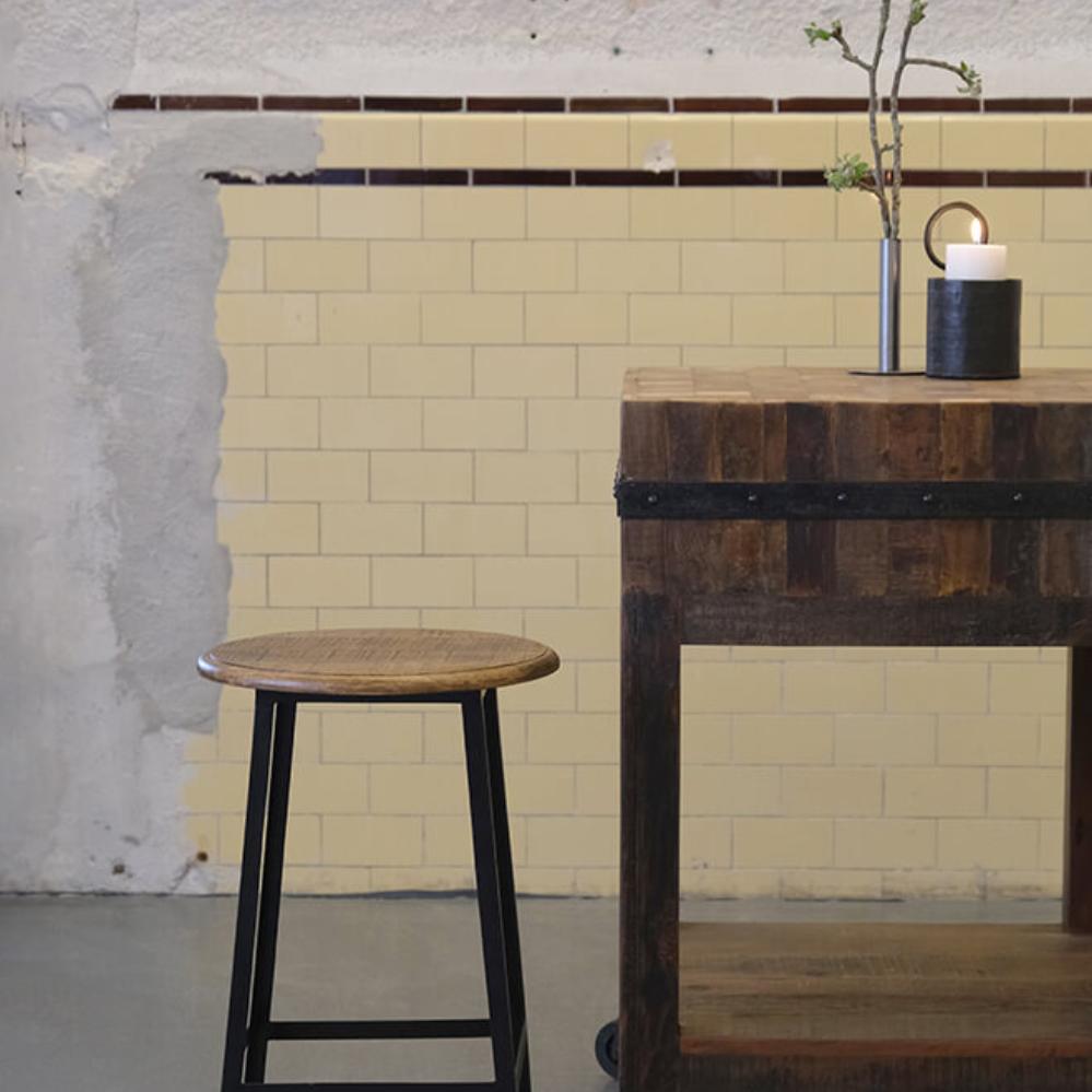 Dieser hohe Hocker hat einen schicken und rohen Look mit seinem schwarzen Gestell und dem dunklen Holzsitz. Der minimalistische schwarze Metallrahmen in Kombination mit dem warmen Holzsitz verleiht ein stilvolles Design, das perfekt sowohl zu industriellen als auch modernen Inneneinrichtungen passt. Die schlichte, aber robuste Konstruktion des Hockers macht ihn ideal als Barhocker oder für hohe Tische in privaten und kommerziellen Umgebungen wie Cafés oder Restaurants. Das dunkle Holz fügt ein organisches und natürliches Element hinzu, das den industriellen Look auflockert.