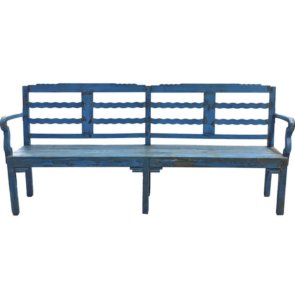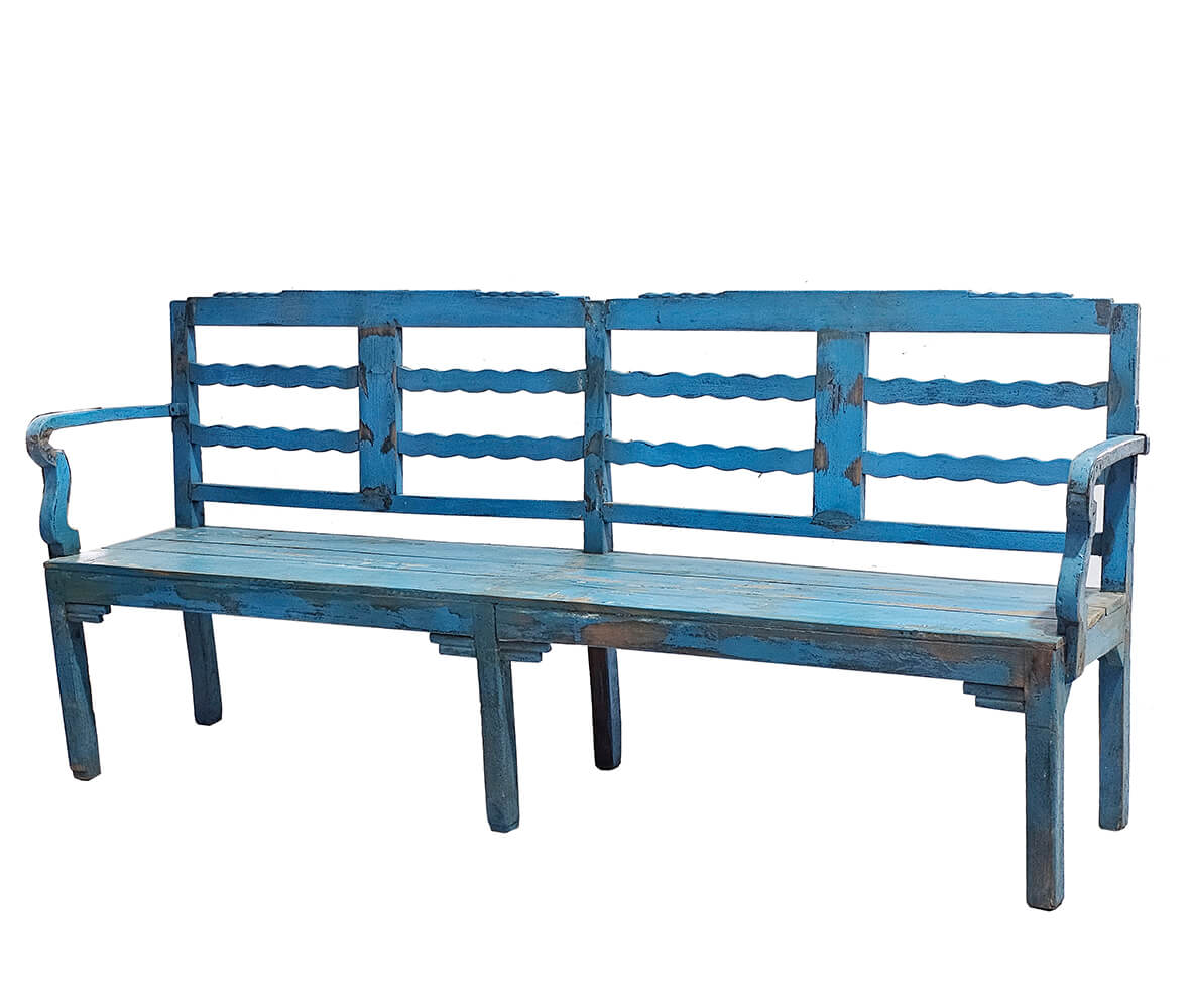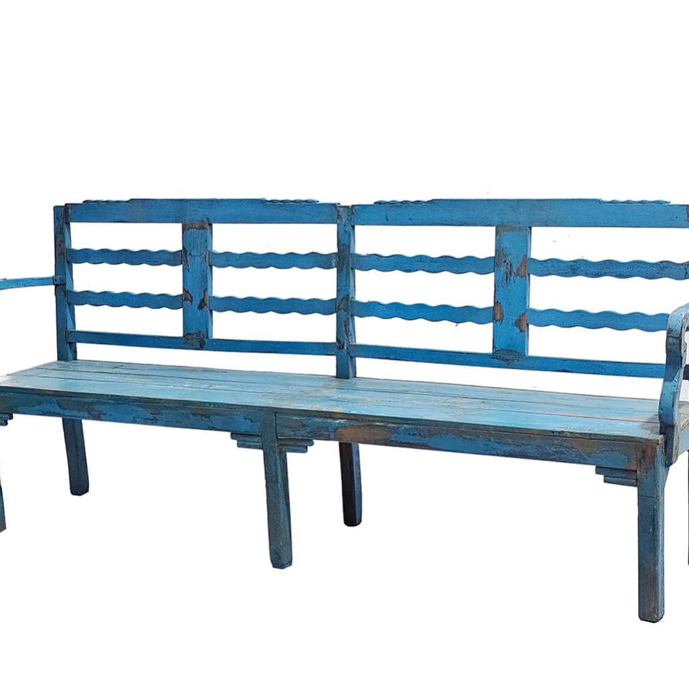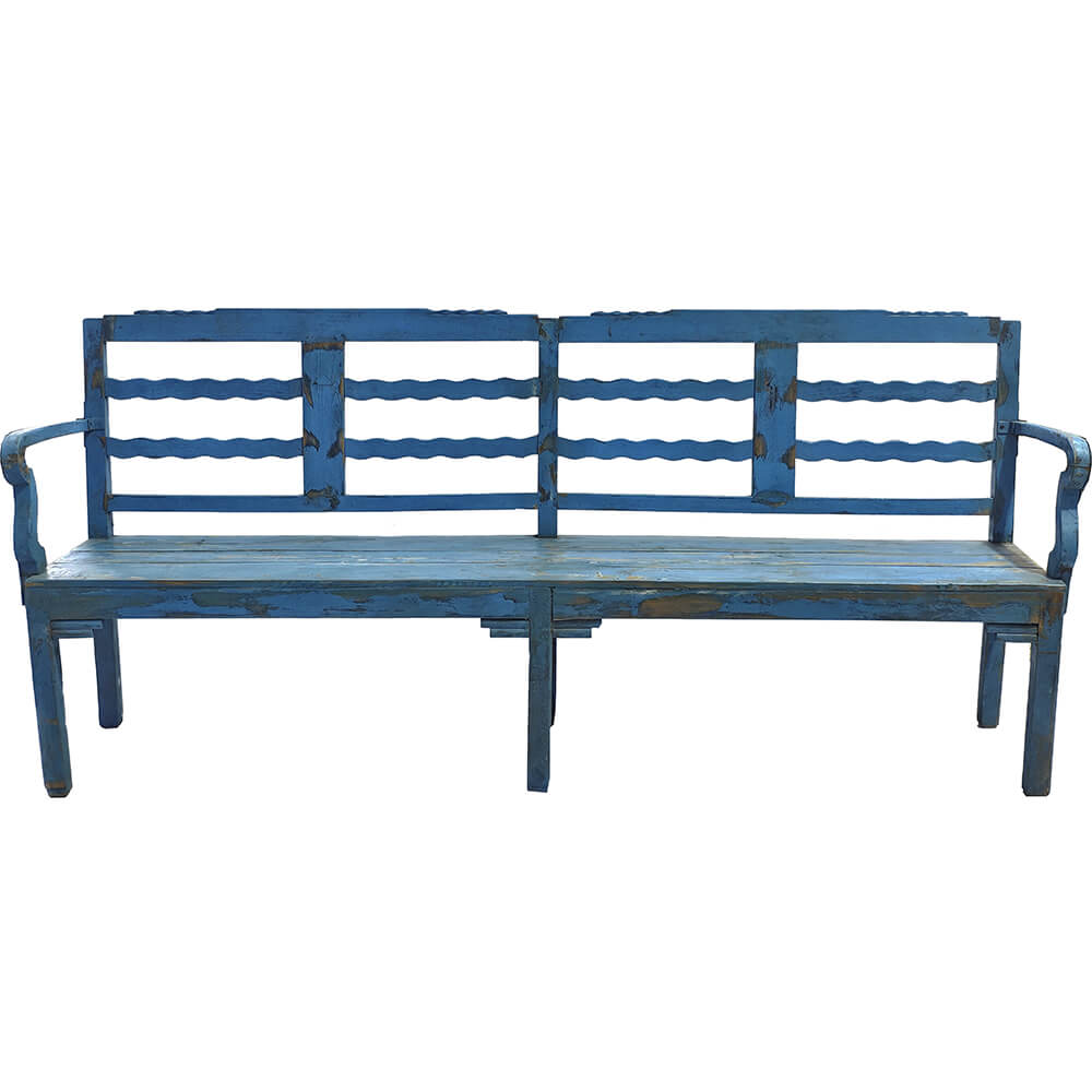 Diese Bank weigert sich, sich im Hintergrund zu halten. Die lebhafte blaue Farbe und die geschwungenen Sprossen in der Rückenlehne verleihen ihr einen fast verspielten Ausdruck, während die abgenutzte Farbe und Patina von einem langen und erfüllten Leben erzählen. Mit ihrer großzügigen Länge bietet sie reichlich Platz für Kaffeepausen und gute Gespräche. Die stabile Holzkonstruktion und die abgerundeten Armlehnen machen sie sowohl bequem als auch praktisch, ob im Eingangsbereich, im Wintergarten oder als Blickfang im Laden. Eine Bank mit Haltung und Geschichte.