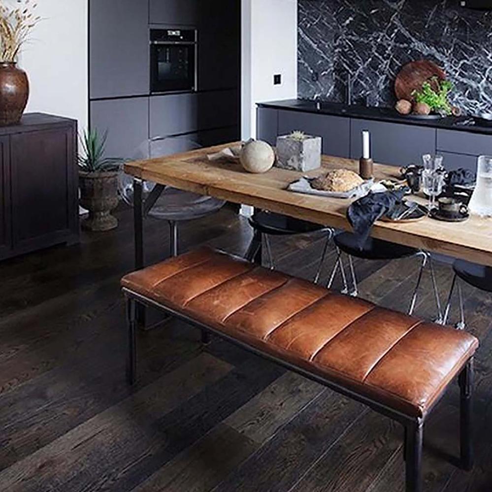 Die Sean Bank verbindet stilvolles Design mit praktischer Nutzbarkeit. Die braune Lederpolsterung trägt zu einem komfortablen Sitzerlebnis bei, während die dunklen Eisenbeine ein industrielles Flair hinzufügen. Die Bank fügt sich in viele verschiedene Einrichtungsstile ein und kann schnell ein paar zusätzliche Sitzplätze schaffen oder als Bank im Eingangsbereich verwendet werden.