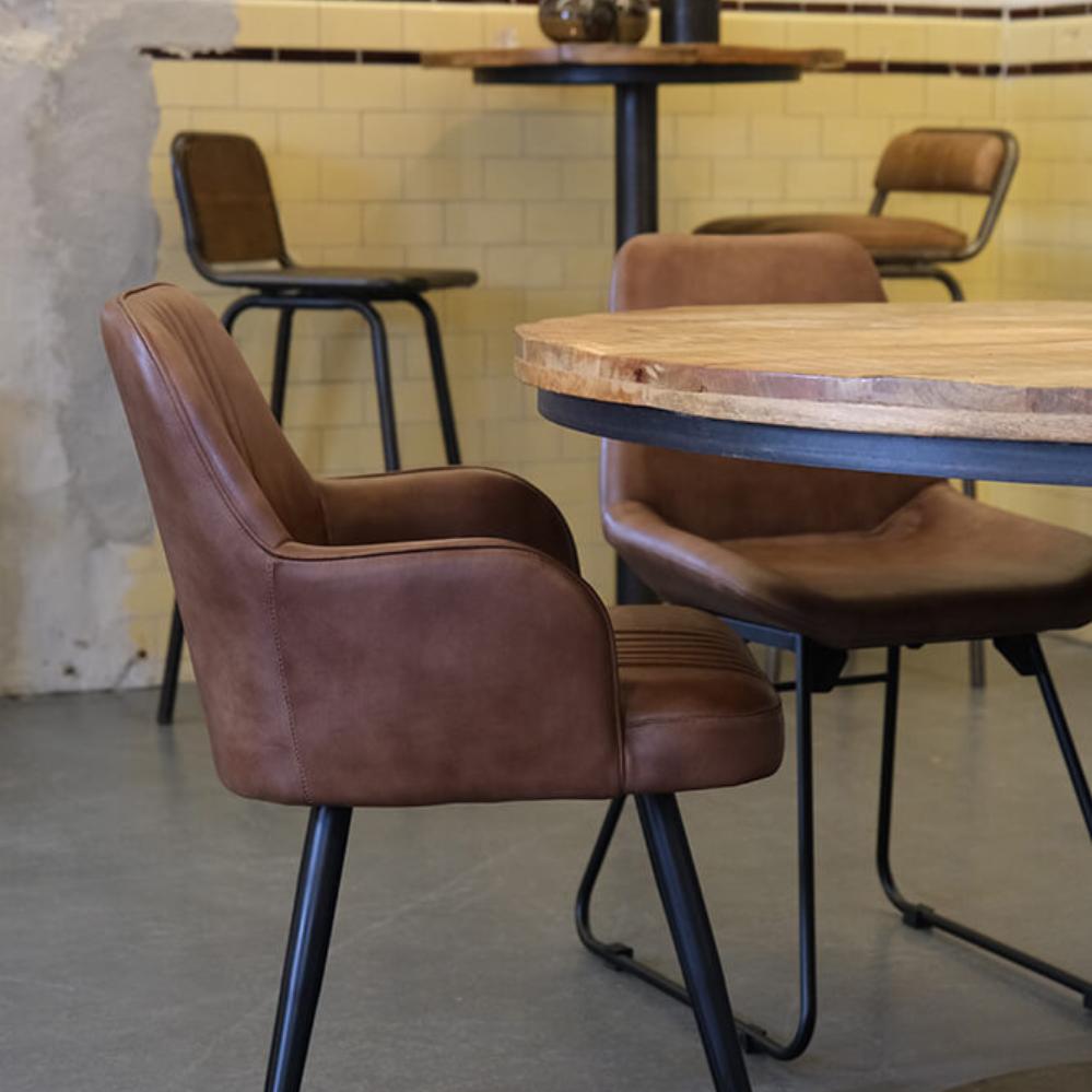 Dieser Esszimmerstuhl aus braunem Büffelleder ist die perfekte Wahl für alle, die eine rustikale und einladende Sitzgelegenheit suchen. Die Polsterung aus authentischem Büffelleder verleiht dem Stuhl einen rustikalen und natürlichen Charme, der ideal in eine maskuline und entspannte Einrichtung passt. Die schlichten schwarzen Metallbeine setzen einen modernen Akzent, während die dekorativen Nähte an Rückenlehne und Sitzfläche einen rauen und detailreichen Look schaffen. Mit seinen Armlehnen und dem komfortablen Design ist der Esszimmerstuhl ideal für den Einsatz in Cafés, Restaurants oder Zuhause im Esszimmer geeignet.