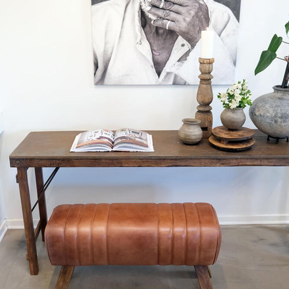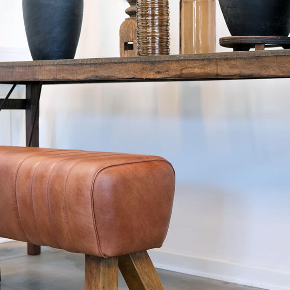 Ein stilvoller und schlichter Bock aus gestepptem Leder. Der Pouf hat einen charmanten Vintage-Look mit wunderschönem cognacfarbenem Leder, das dem Raum eine warme Atmosphäre verleiht. Die robusten Holzbeine sorgen für Stabilität und Langlebigkeit – perfekt für den täglichen Gebrauch. Das gesteppte Design verleiht einen klassischen und zeitlosen Ausdruck, der sowohl in moderne als auch rustikale Einrichtungen passt. Ideal für den Flur als praktische Sitzgelegenheit, am Fußende des Bettes als stilvolle Ergänzung oder als dekoratives und funktionales Detail in Ihrem Restaurant oder Geschäft. Mit diesem schönen und vielseitigen Pouf sind die Möglichkeiten grenzenlos.