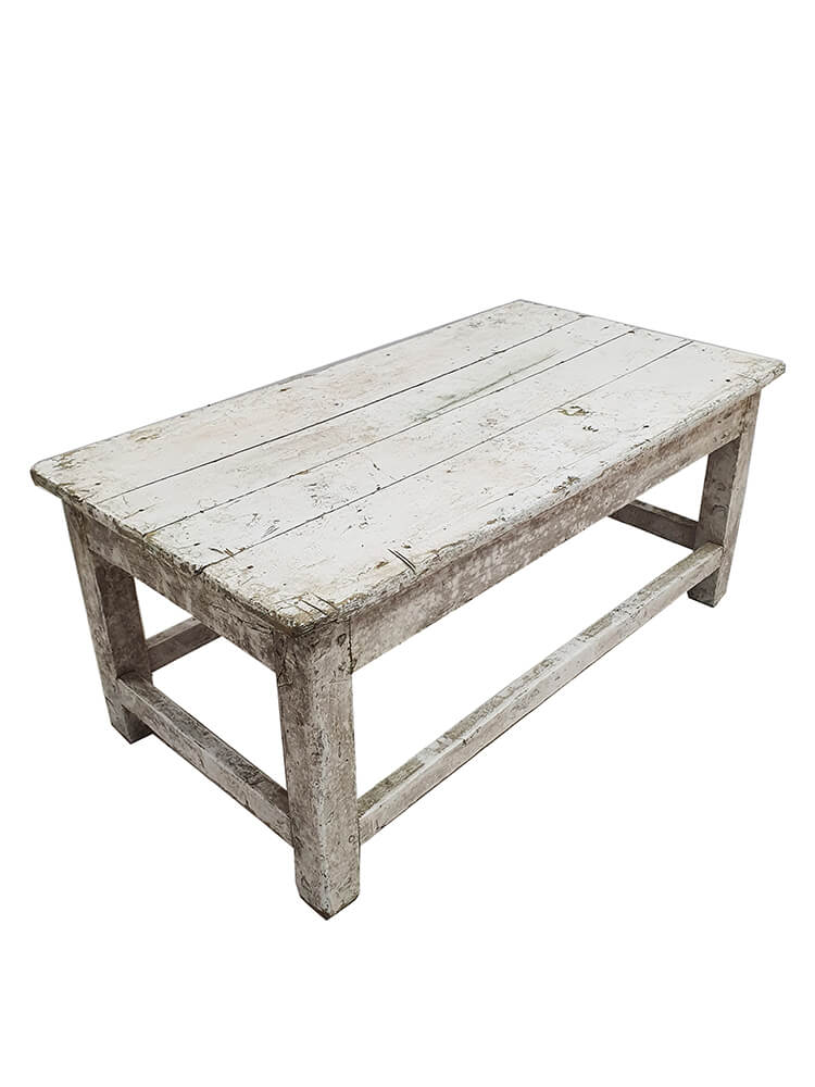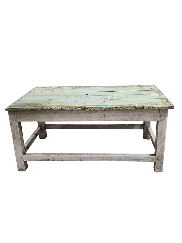 Dieser alte, charmante Couchtisch ist voller Geschichte und Persönlichkeit. Er besteht aus massivem Holz und besitzt eine schön abgenutzte Oberfläche mit abblätternder Farbe, sichtbaren Gebrauchsspuren und einer Patina, die nur viele Jahre des Lebens hervorbringen können. Das verleiht dem Tisch einen authentischen und gemütlichen Ausdruck, der perfekt zu rustikalen, ländlichen und nordischen Wohnstilen passt. Die schlichte und solide Konstruktion macht den Tisch stabil und alltagstauglich, während die breiten Planken der Tischplatte den handwerklichen und ursprünglichen Charakter unterstreichen. Er eignet sich ideal als Couchtisch im Zuhause oder im gewerblichen Umfeld. Mit ein paar Kissen wird er im Handumdrehen zu einer schönen Bank im Wohnzimmer, im Eingangsbereich oder im Ferienhaus. Da jedes Stück ein Unikat ist, sind Abweichungen in Farbe, Patina und Größe ganz natürlich. Kleine Unterschiede, Spuren und Unebenheiten gehören zum Charme und machen jeden Tisch einzigartig.