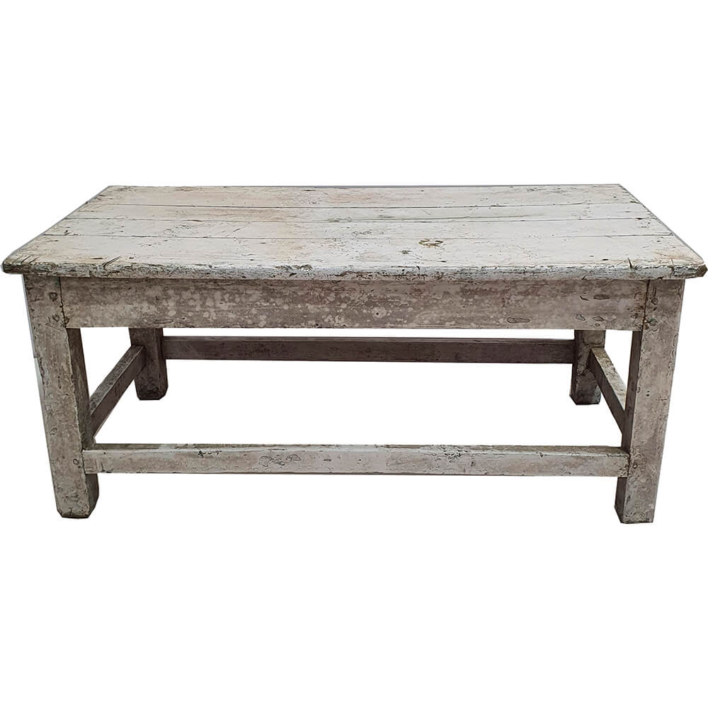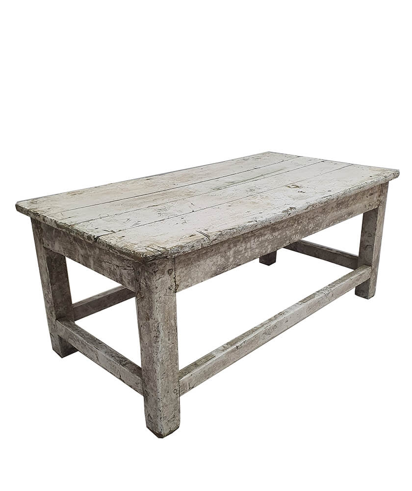 Dieser alte rustikale Couchtisch hat einen schlichten und soliden Ausdruck mit viel Seele und Patina. Der Tisch ist aus massivem Holz gefertigt und zeigt deutliche Spuren früherer Nutzung in Form von Abnutzung, Unebenheiten und einer schönen, stellenweise abgeblätterten Oberfläche, die ihm ein authentisches und lebendiges Erscheinungsbild verleiht. Die helle, gedämpfte Farbgebung passt hervorragend zu modernen, nordischen und rohen Einrichtungen. Die Konstruktion ist robust, mit kräftigen Beinen und einem stabilen Rahmen, wodurch sich der Tisch ideal als Mittelpunkt im Wohnzimmer eignet. Die Tischplatte bietet ausreichend Platz für Bücher, Kaffeetassen und dekorative Elemente. Tipp. Mit einer Höhe von ca. 45 cm kann der Tisch auch problemlos als Bank genutzt werden, zum Beispiel im Eingangsbereich, am Esstisch oder am Fußende des Bettes. Ein einzigartiges Möbelstück, bei dem Funktionalität und Geschichte Hand in Hand gehen.