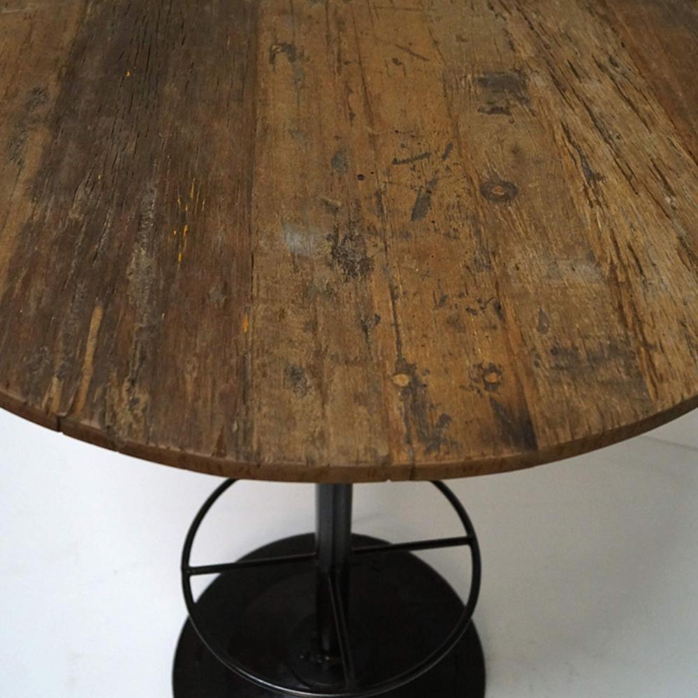 Runder Bistrotisch mit rustikaler Arbeitsplatte aus Altholz und dunklem Eisenfuß mit Fußstütze. Mit diesem hohen Bistrotisch und unserer großen Auswahl an Barhockern können Sie eine super coole und atmosphärische Umgebung schaffen.