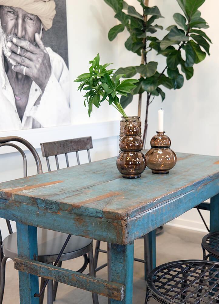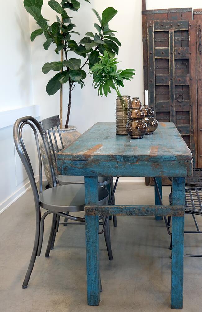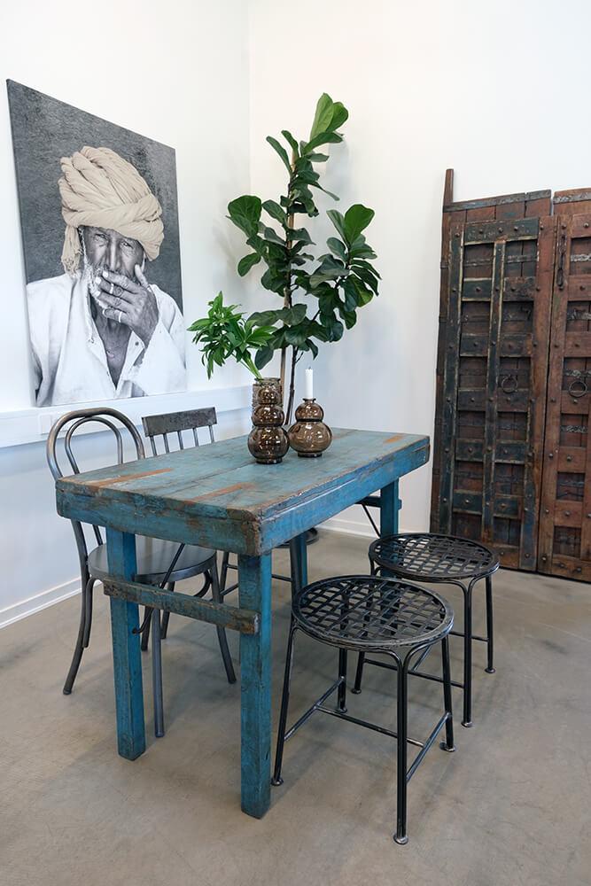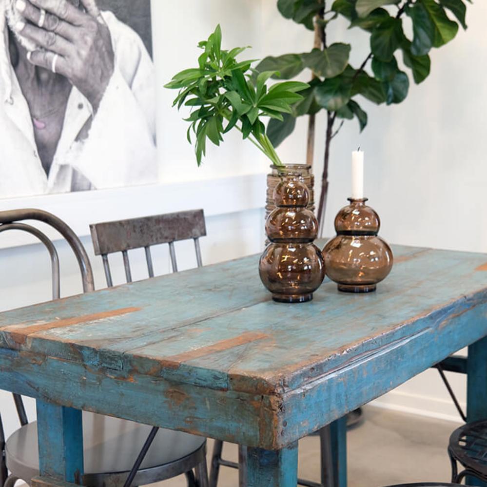 Dieser kleine Esstisch ist ein echtes Juwel für alle, die wiederverwendung und rustikale Handwerkskunst schätzen. Der Tisch ist aus Altholz gefertigt, das seine ganz eigene Geschichte mit sich bringt, und die blaue Farbnuance verleiht ihm einen charakteristischen Ausdruck. Das raue Aussehen des wiederverwendeten Holzes und die robuste Konstruktion machen ihn perfekt für kleinere Essbereiche, in denen der Platz begrenzt ist, aber Persönlichkeit im Mittelpunkt steht. Dieser Tisch passt sowohl in ein modernes Zuhause als auch zu denen, die einen Hauch von rustikalem Charme suchen.