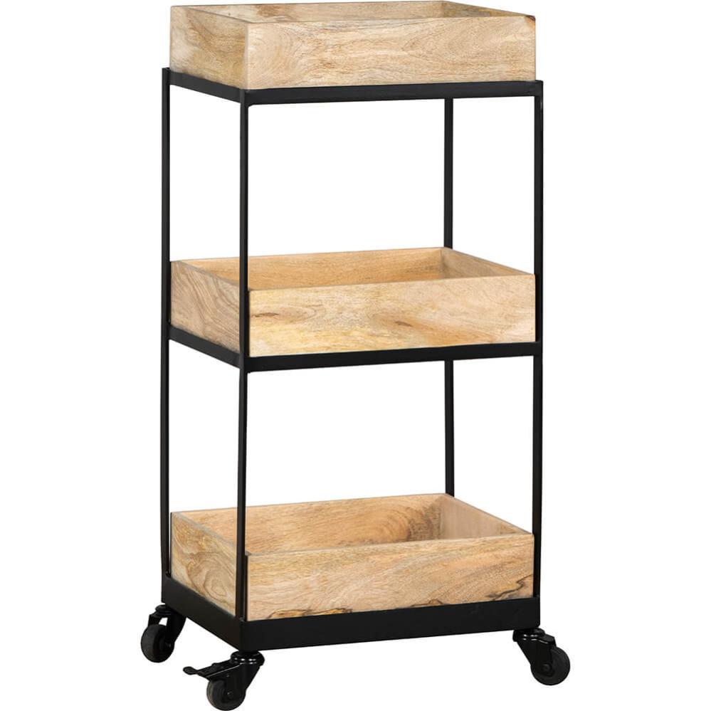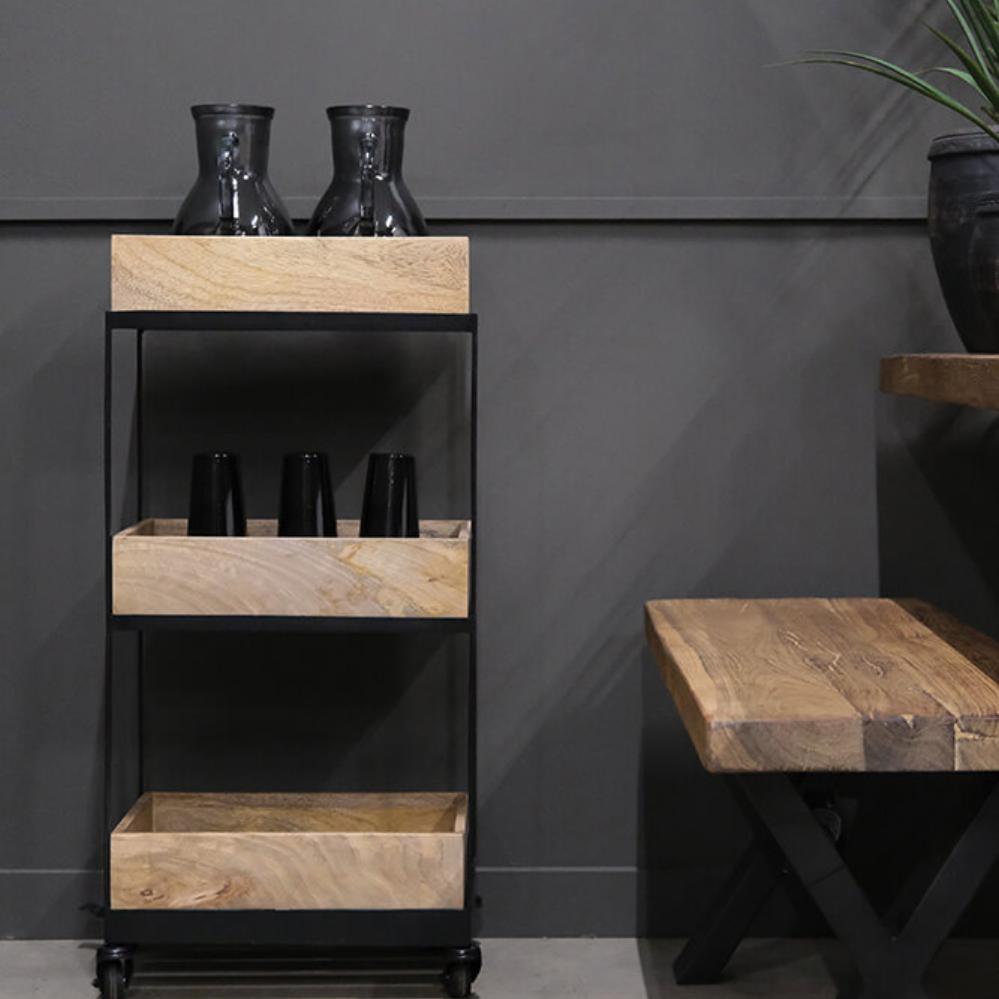 Kombinieren Sie praktische Aufbewahrung mit rustikalem Charme mit unserem rollbaren Eisenwagen, ausgestattet mit drei abnehmbaren Holztabletts. Dieser vielseitige Wagen bietet nicht nur bequeme Aufbewahrungsmöglichkeiten, sondern fügt auch einen Hauch natürlicher Schönheit in jeden Raum ein. Verwenden Sie ihn in der Küche, um Gewürze zu organisieren, im Badezimmer für Toilettenartikel oder im Wohnzimmer, um Ihre Lieblingsdekorationen zu präsentieren. Dank der Rollen können Sie ihn problemlos nach Bedarf bewegen. Unser Eisenwagen mit Holztabletts ist die ideale Lösung für die praktische und stilvolle Einrichtung.