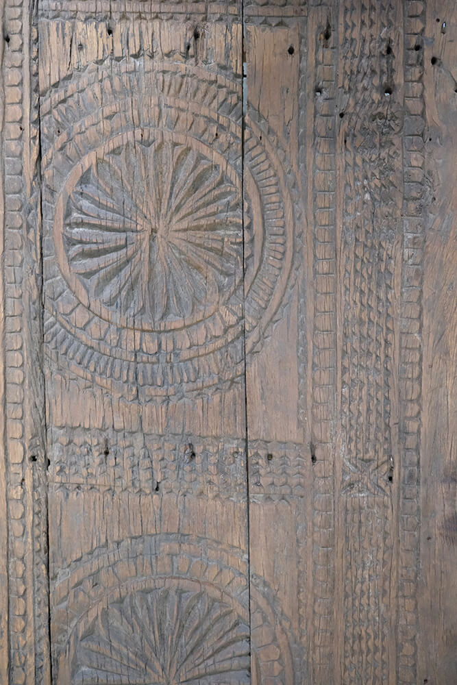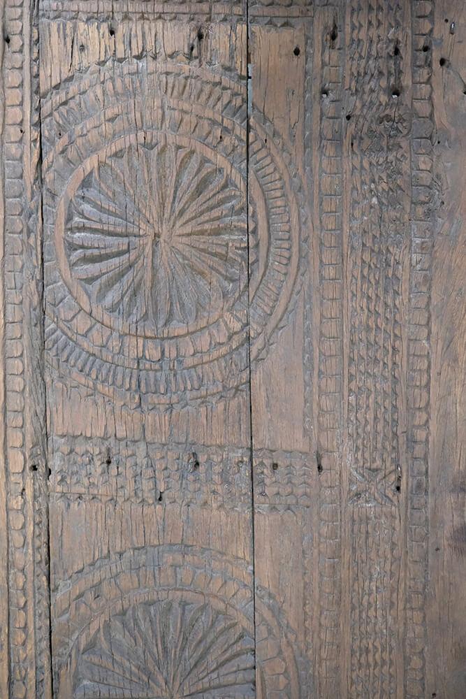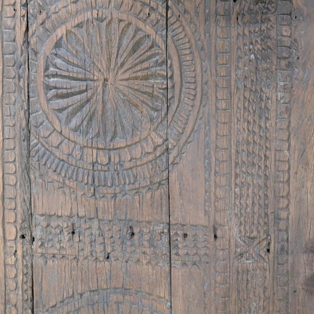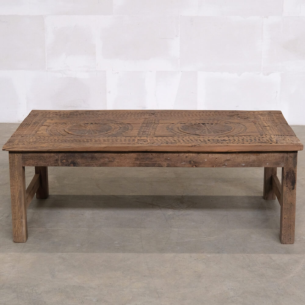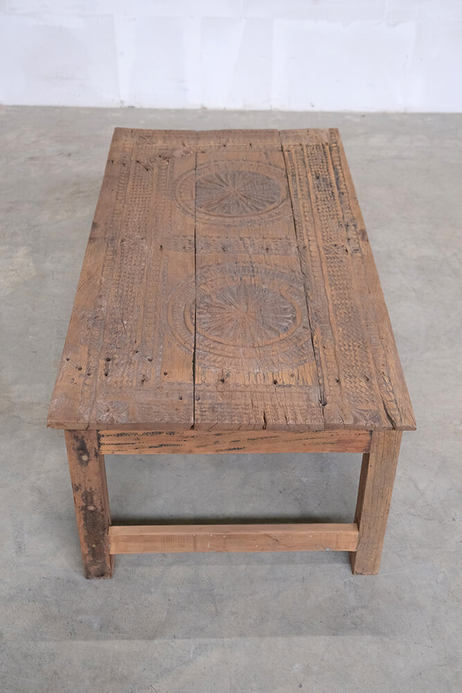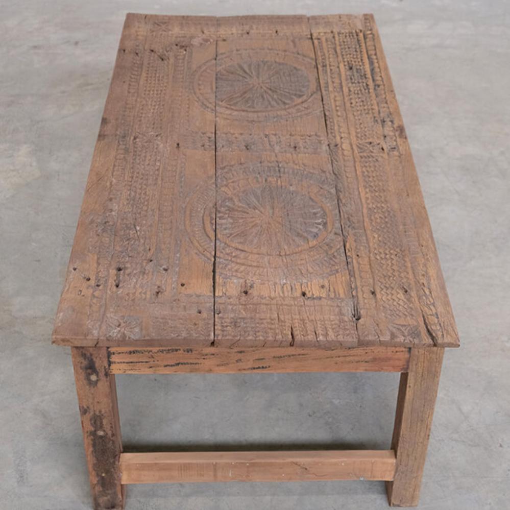 Dieser Couchtisch ist ein einzigartiges Stück Handwerkskunst voller Charme und Geschichte. Die Tischplatte besteht aus einer alten Tür mit kunstvoll geschnitzten Details, die dem Tisch einen unverwechselbaren Charakter verleihen. Jede Schnitzerei trägt die Spuren der Zeit und erzählt ihre eigene Geschichte, wodurch jeder Tisch ein echtes Unikat ist. Das Gestell ist aus wiederverwendetem Holz gefertigt, das den rustikalen Charakter unterstreicht und dem Tisch eine natürliche, warme Ausstrahlung verleiht. Die Kombination aus der detailreichen Tischplatte und dem schlichten Gestell macht den Tisch zu einem markanten Möbelstück im Wohnzimmer – perfekt für alle, die echtes Handwerk und Materialien mit Patina schätzen. Der Tisch passt sowohl in moderne Einrichtungen mit spannenden Kontrasten als auch in bohemehafte oder industrielle Räume, wo er Charakter und Persönlichkeit verleiht.