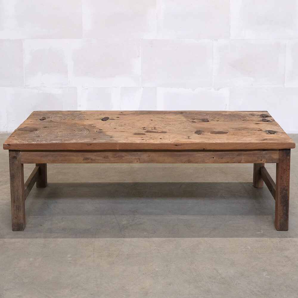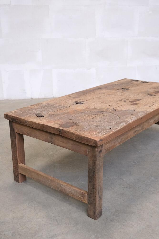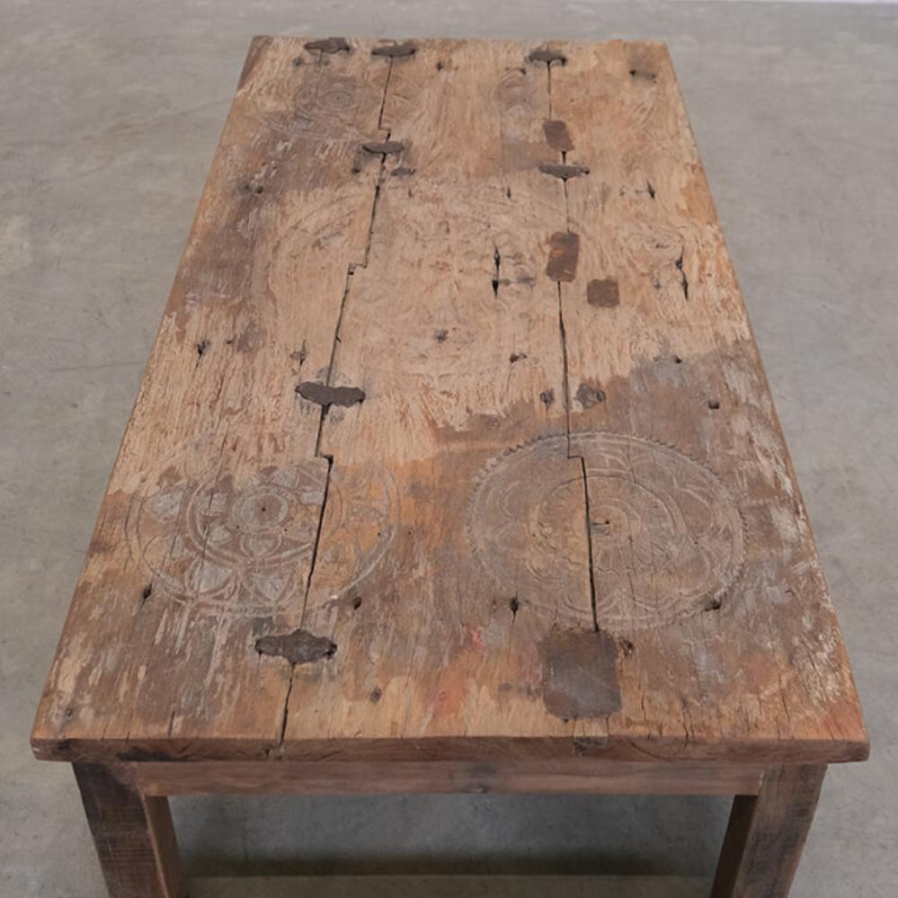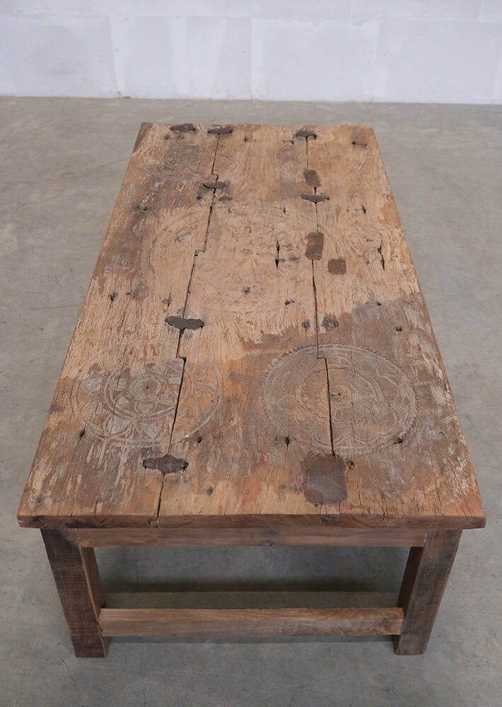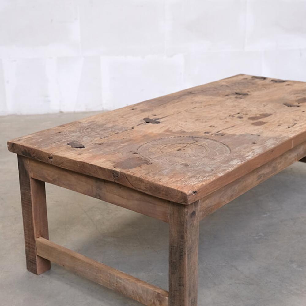 Dieser Couchtisch ist ein charakterstarkes Möbelstück, bei dem die Geschichte in jeder Holzfaser spürbar ist. Die Tischplatte besteht aus einer alten Tür mit wunderschönen, handgeschnitzten Details, die noch in der Struktur des Holzes zu erkennen sind. Natürliche Risse, Fugen und Gebrauchsspuren wurden bewusst beibehalten und verleihen dem Tisch eine authentische und lebendige Ausstrahlung. Das Gestell ist aus massivem Altholz gefertigt, das die rustikale Ausstrahlung der Tischplatte unterstreicht und den einzigartigen Charakter des Tisches betont. Zusammen ergeben die Materialien ein Möbelstück, das zugleich roh, warm und voller Charme ist. Dieser Couchtisch ist ideal für alle, die Möbel mit Persönlichkeit und Geschichte schätzen – ganz gleich, ob als spannender Kontrast in einem modernen Wohnzimmer oder als harmonisches Element in einer natürlichen, rustikalen Einrichtung.