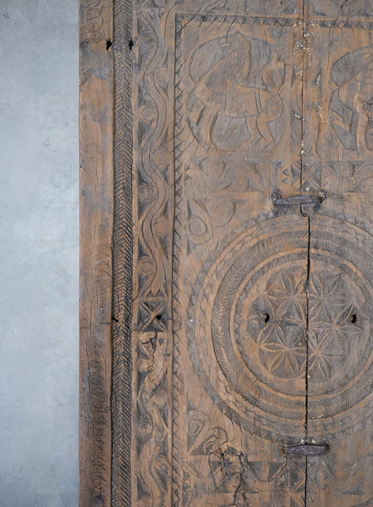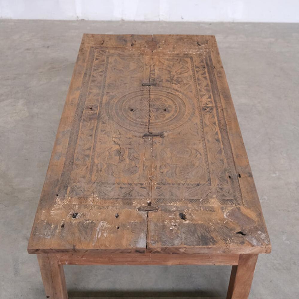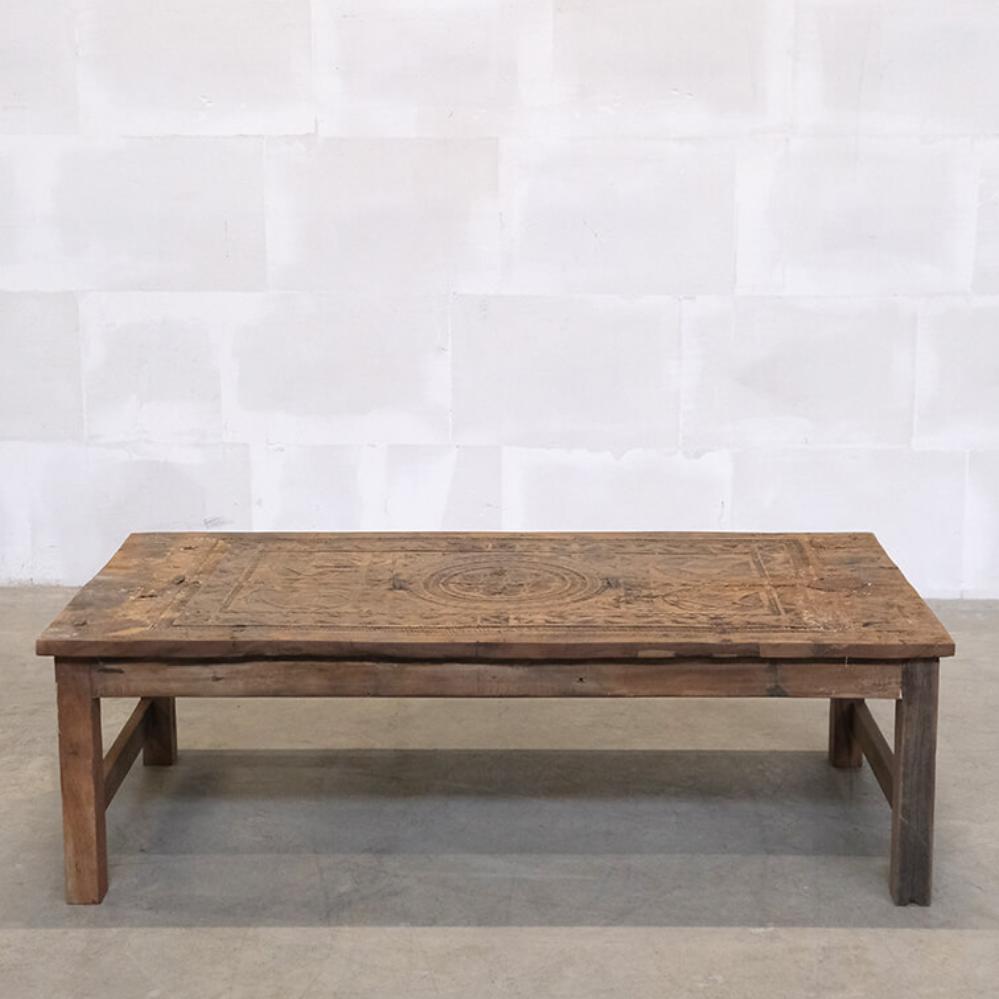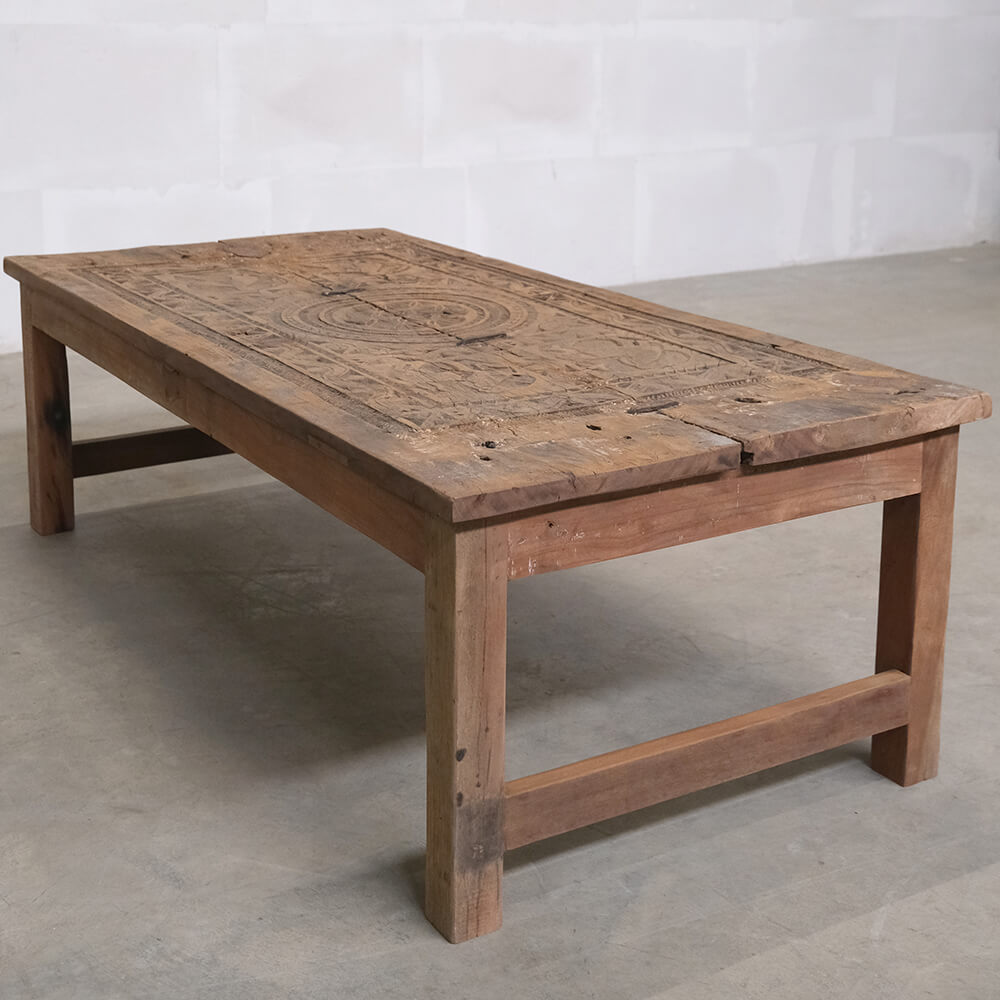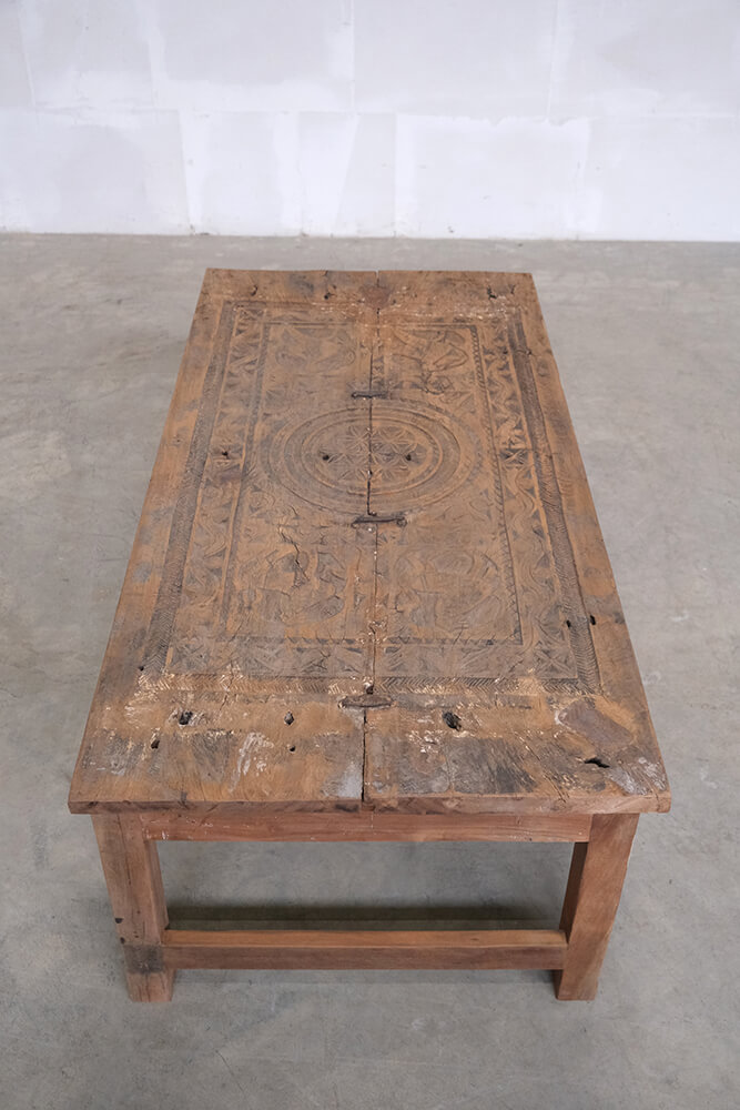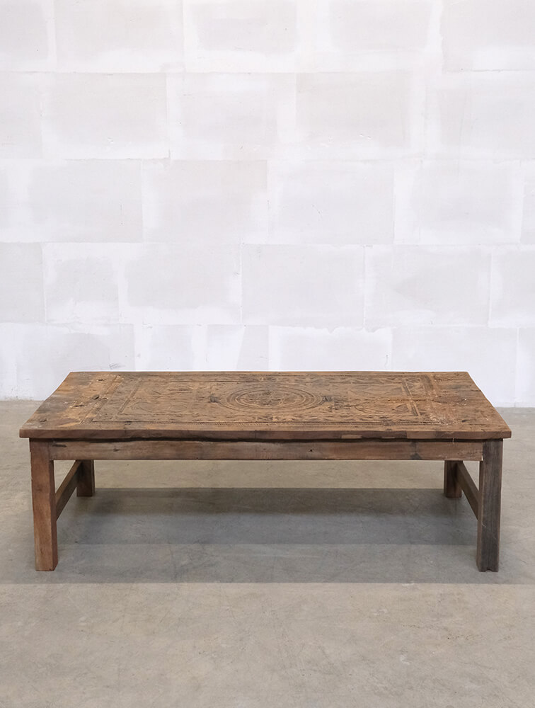 Dieser einzigartige Couchtisch aus Holz hat einen rustikalen und authentischen Charme, unterstrichen durch seine schöne Tischplatte. Das Holz zeigt deutliche Gebrauchsspuren mit einer natürlichen Patina und Abnutzung, die dem Tisch einen ganz besonderen Charakter verleihen. Die feinen Schnitzereien auf der Tischplatte fügen eine zusätzliche Dimension hinzu und machen ihn zu einem künstlerischen und detaillierten Möbelstück. Seine Größe ist ideal für alle, die einen etwas größeren Couchtisch wünschen. Mit seiner robusten Konstruktion und den sichtbaren Gebrauchsspuren ist dieser Tisch perfekt für Einrichtungen, die rustikale Materialien und Vintage-Stil schätzen. Ein einzigartiges Möbelstück, das jedem Raum sowohl Seele als auch Atmosphäre verleiht.