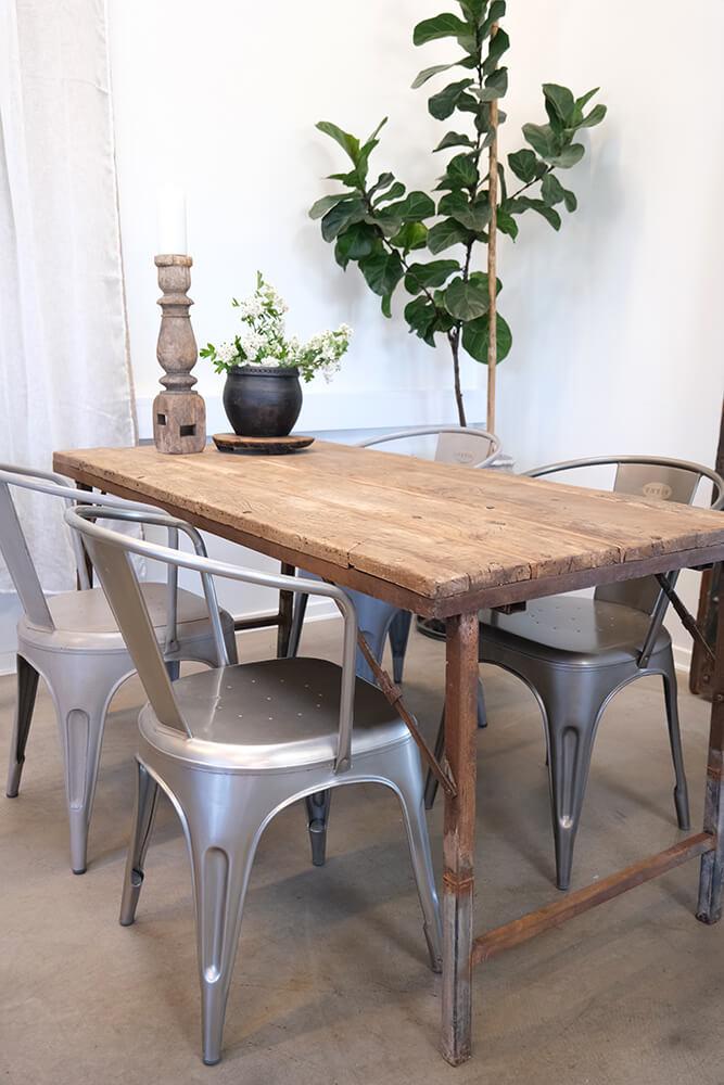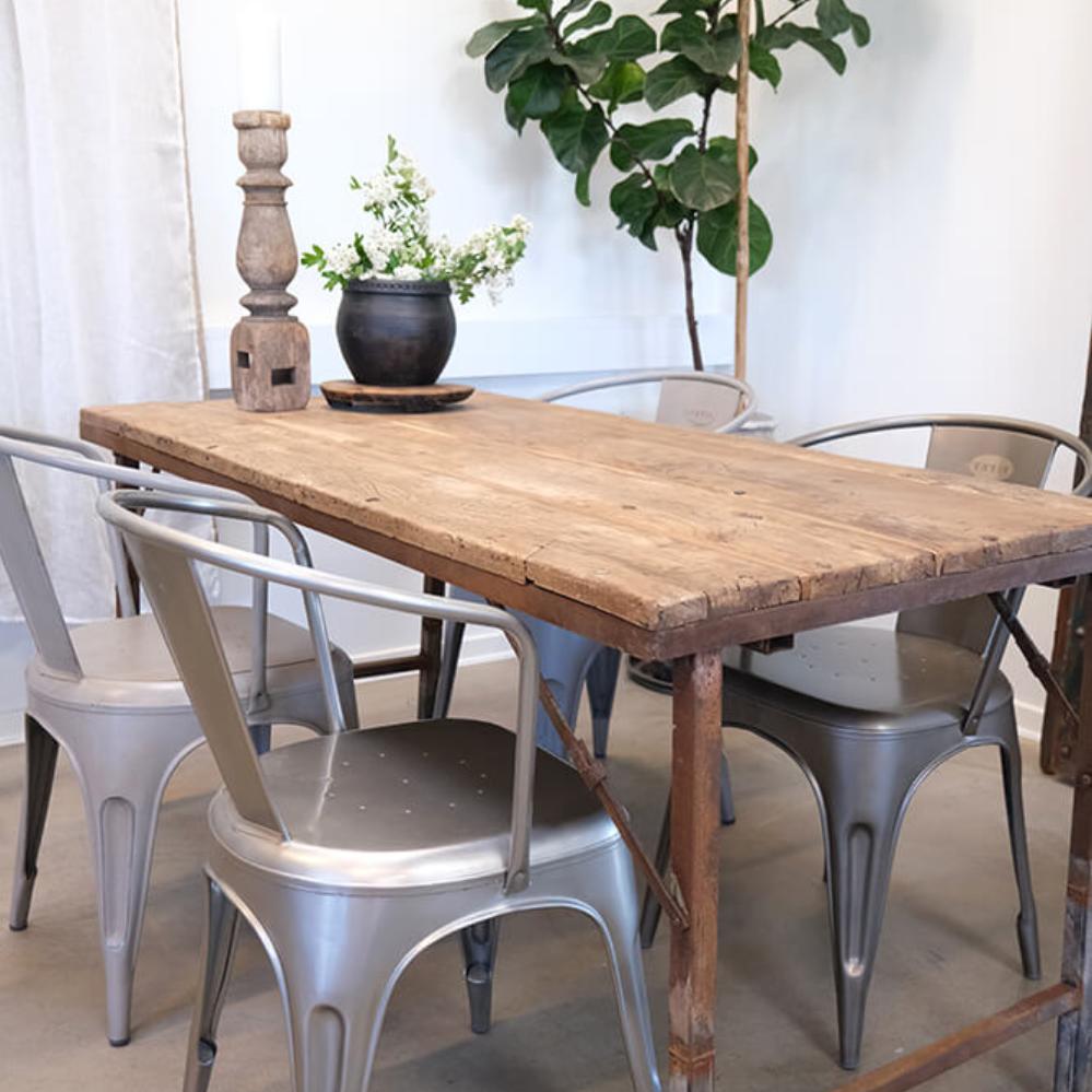 Alter, rustikaler Tisch mit Holzplatte und Eisengestell - Mischfarben. Rustikal aber gleichzeitig stilvoll. Für die fazinierende Einrichtung. Klappbar.