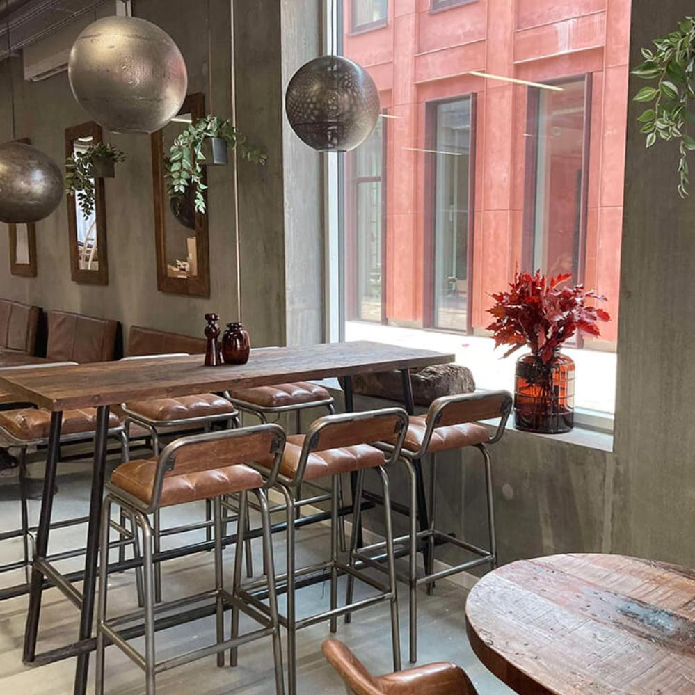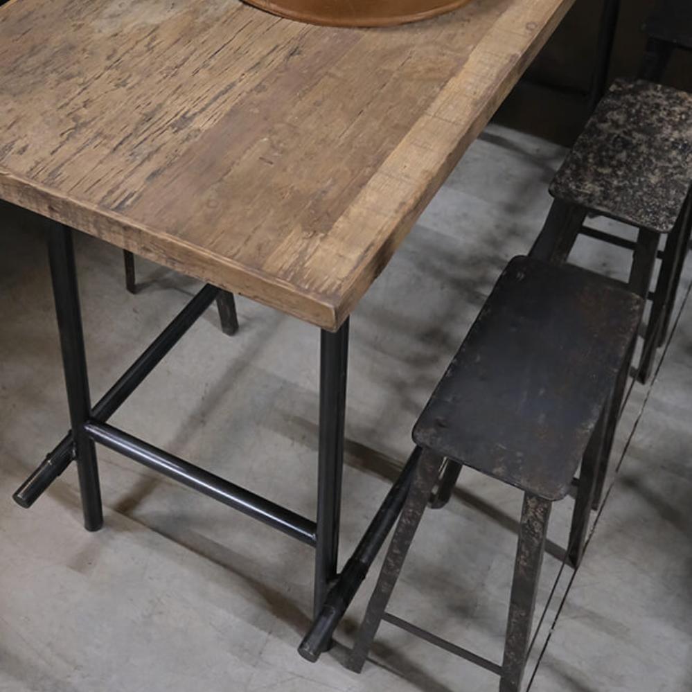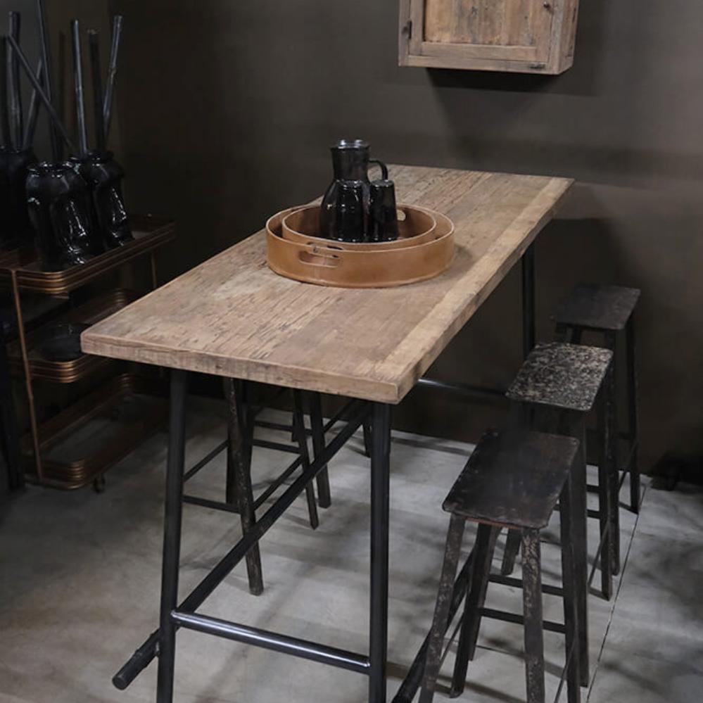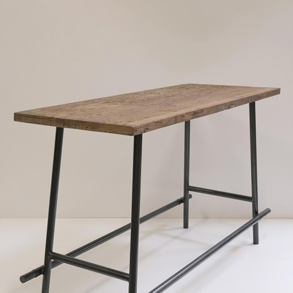Dieser Bartisch kombiniert rohes Holz und Eisen zu einem Design, das so schlicht wie auffällig ist. Das schlanke Gestell trägt eine Tischplatte mit Struktur und warmen Tönen des Holzes. Der klare Ausdruck des Tisches macht ihn perfekt für einen modernen Einrichtungsstil.