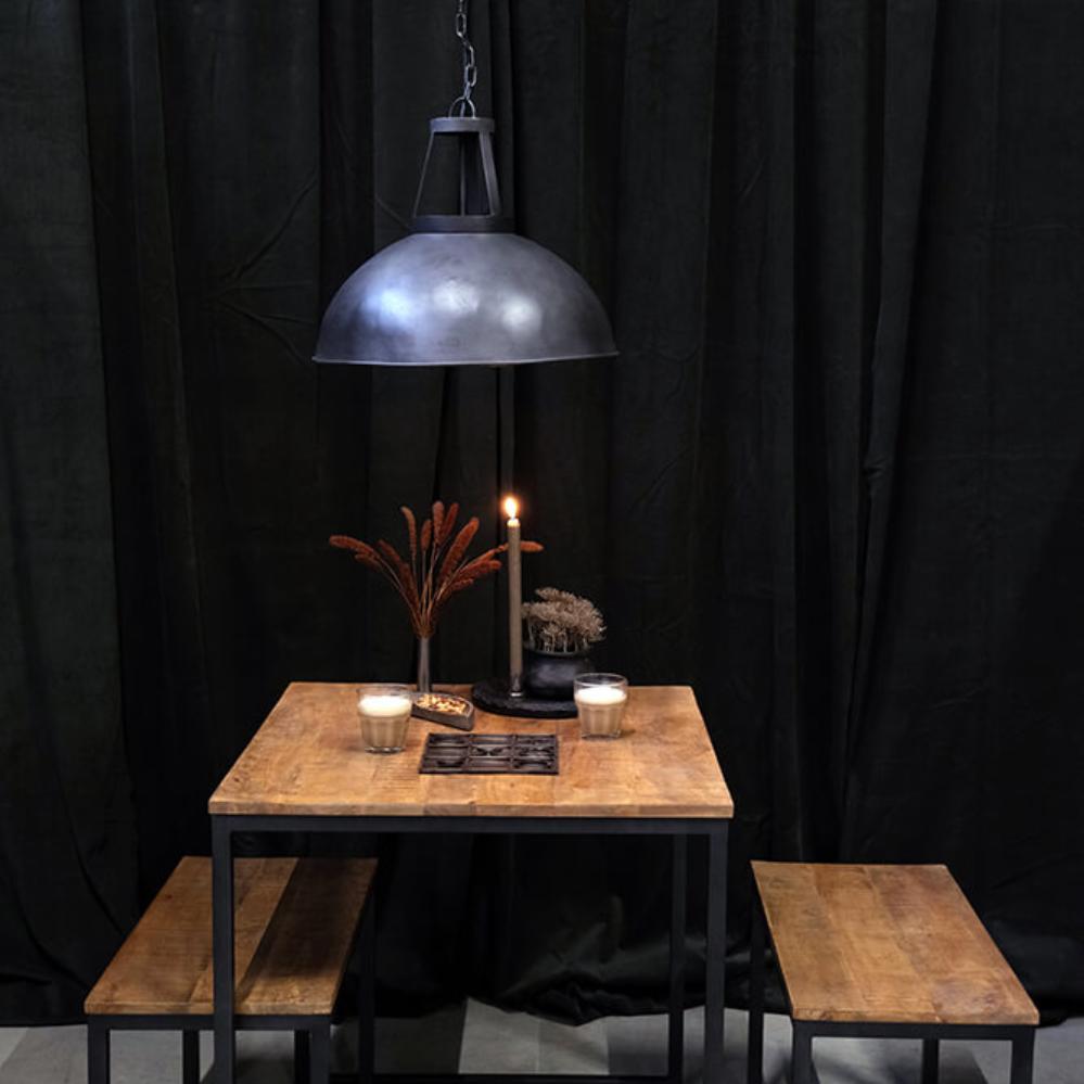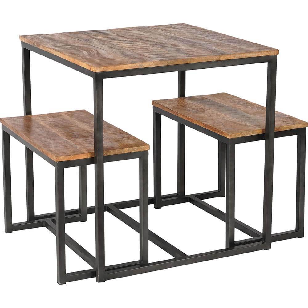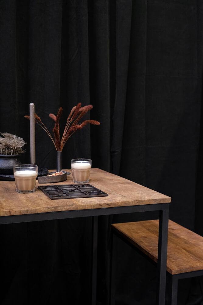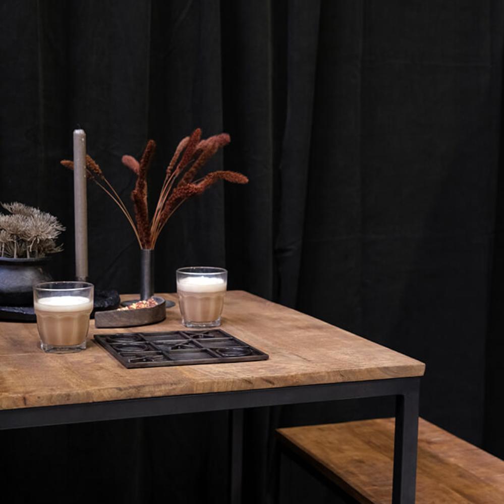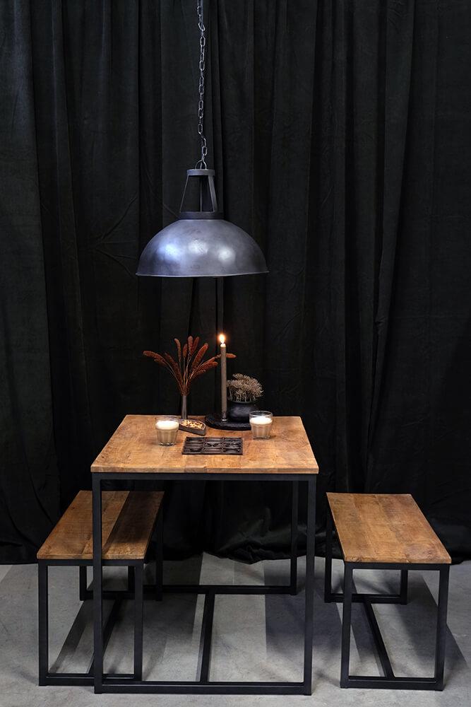 Dieses stilvolle Tisch-Bank-Set aus Eisen und Mangoholz ist sowohl praktisch als auch elegant. Mit seinem minimalistischen Design passt das Set perfekt in moderne und industrielle Einrichtungen. Die Tischplatte und die Bänke bestehen aus langlebigem Mangoholz mit einer schönen, natürlichen Oberfläche, die einen warmen Kontrast zum rauen, dunkelgrauen Eisengestell bildet. Die Bänke lassen sich leicht unter den Tisch schieben, um Platz zu sparen, was das Set ideal für kleinere Küchen, Esszimmer oder als kompakte Sitzgelegenheit in einem Café macht.