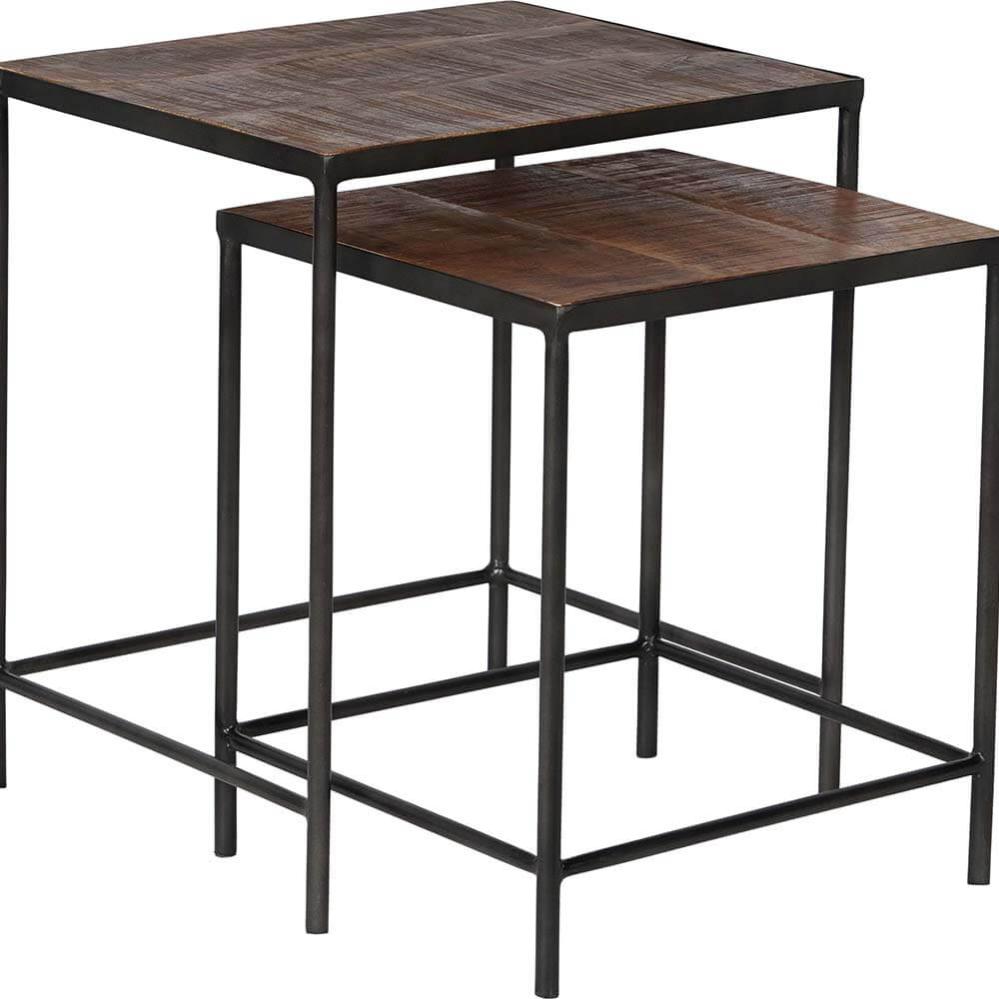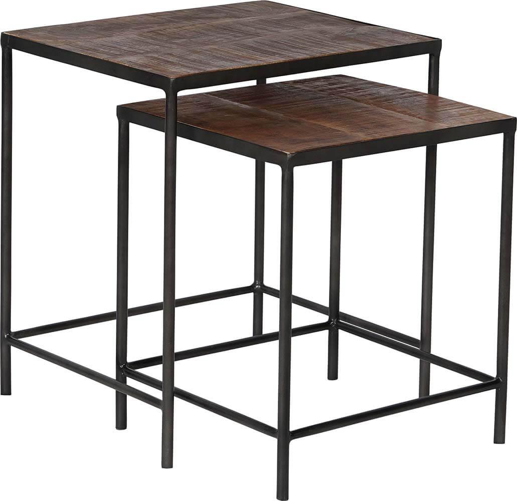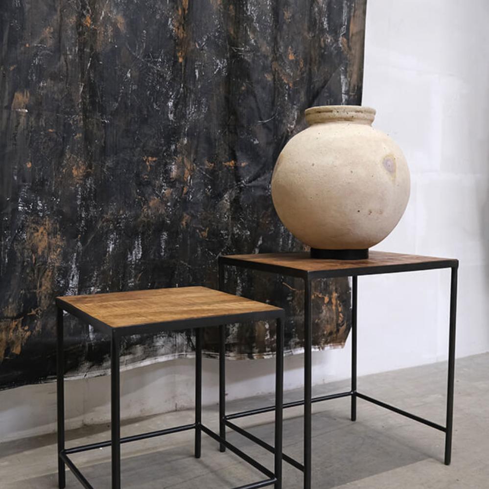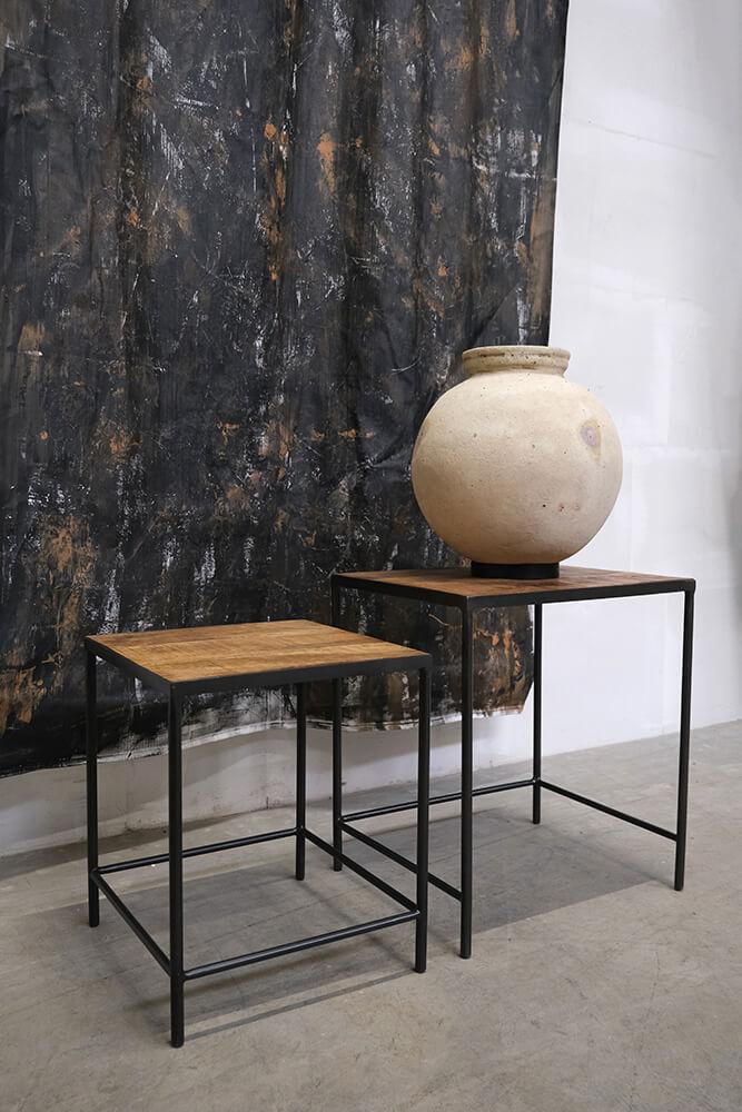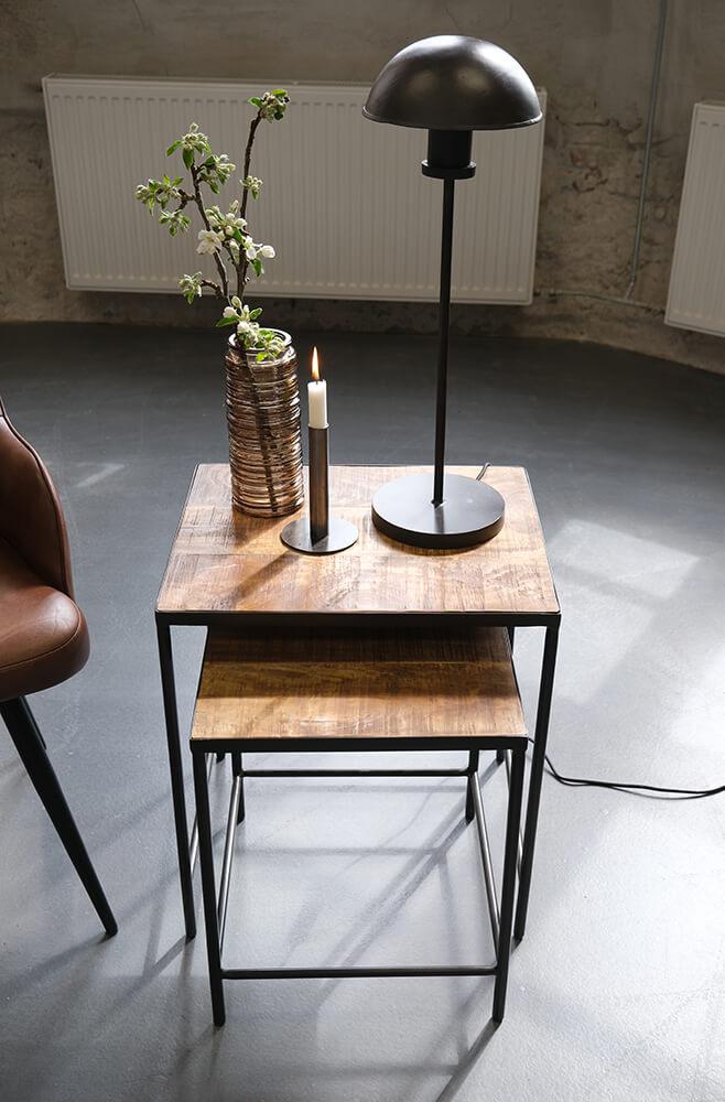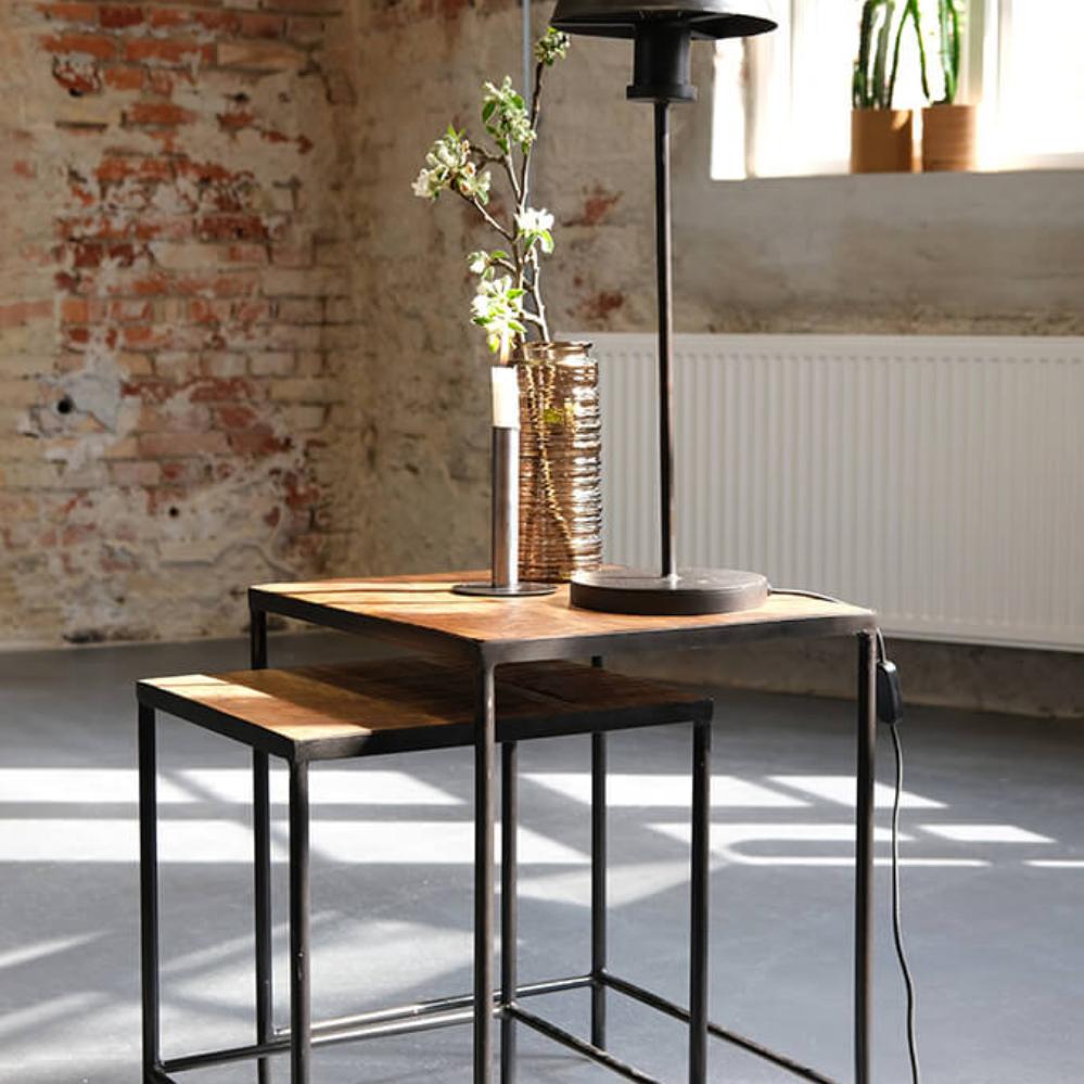 Dieser Satztisch ist ein minimalistisches Duo, das rustikales Holz mit einem schlichten Metallrahmen kombiniert. Der grosse Tisch hat eine einfache, quadratische Form, die vom kleinen Tisch gespiegelt wird, der sich leicht darunter stellen lässt. Die Tischplatten bestehen aus dunklem Holz und schaffen einen schönen Kontrast zu den dünnen Metallbeinen. Perfekt, um Platz zu sparen und gleichzeitig industriellen Charme in den Raum zu bringen. Dieses Set ist nicht nur praktisch, sondern auch unglaublich vielseitig—verwenden Sie es als Couchtische, Beistelltische oder zur Präsentation Ihrer Lieblingsdekorationen. Das Design ist stilvoll und dezent, mit einem Hauch roher Ästhetik, der sowohl zu modernen als auch vintage-inspirierten Einrichtungen passt. Groß: H: 54cm x W: 48cm x D: 40cm Klein: H: 46cm x W: 40cm x D: 38cm