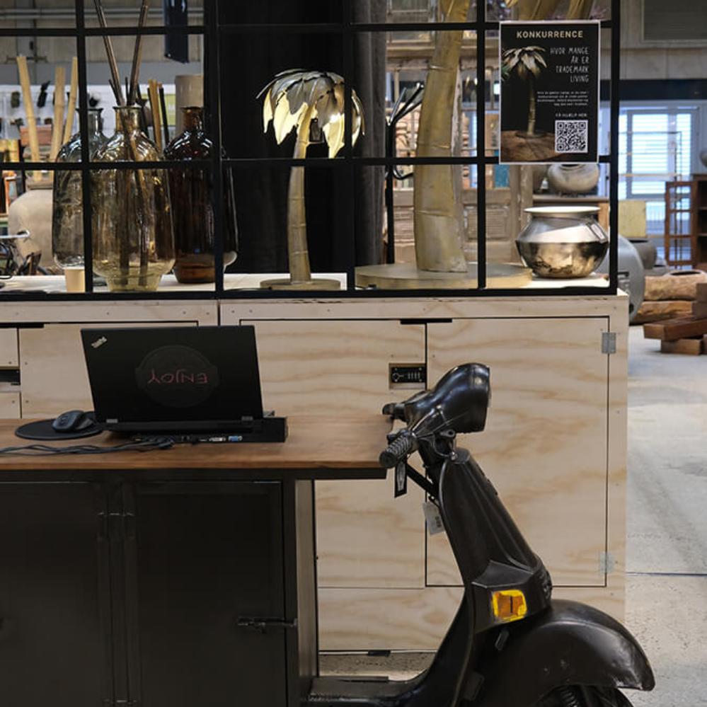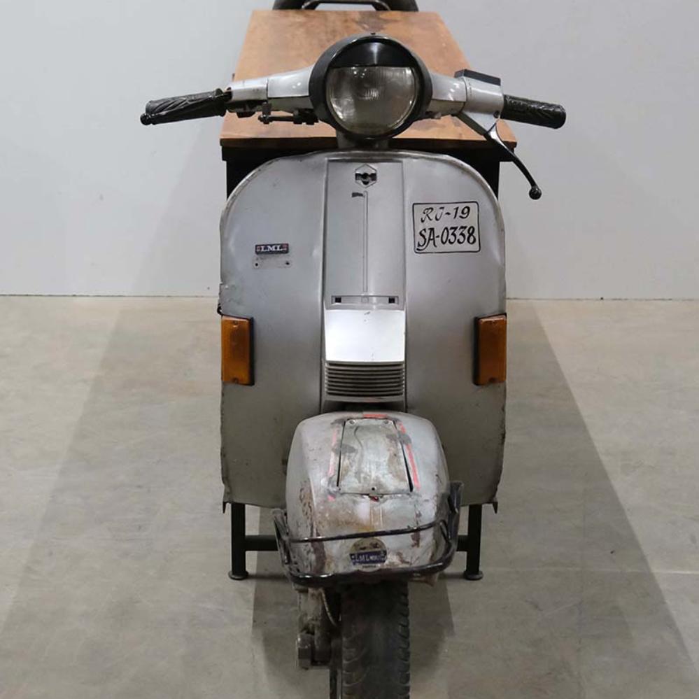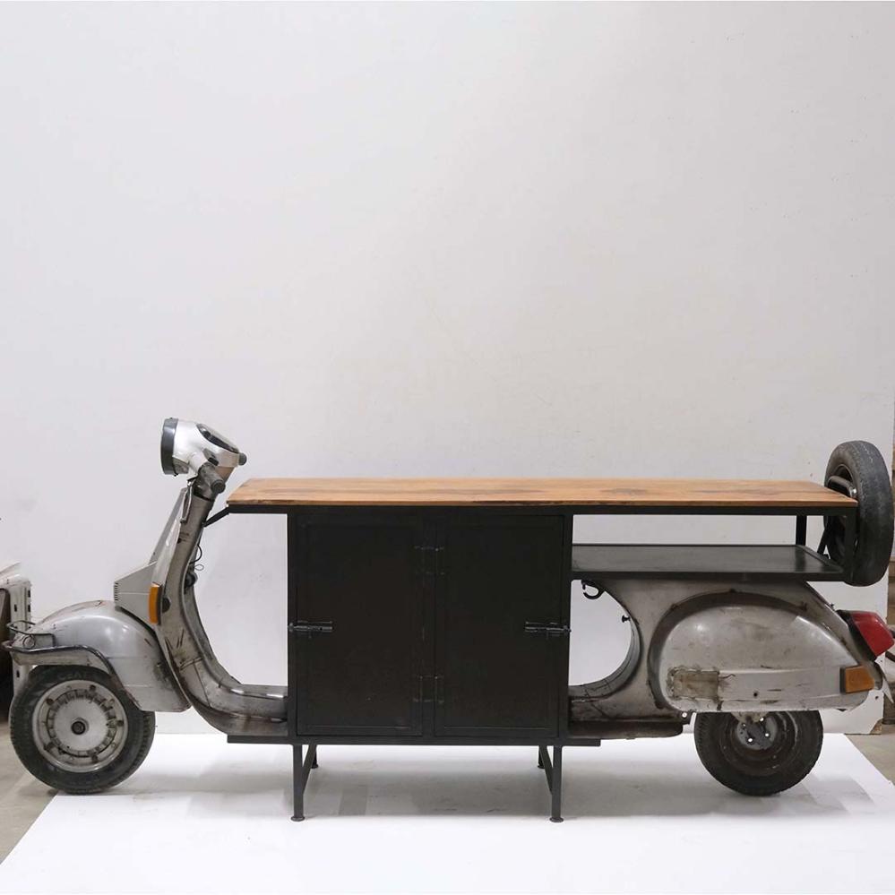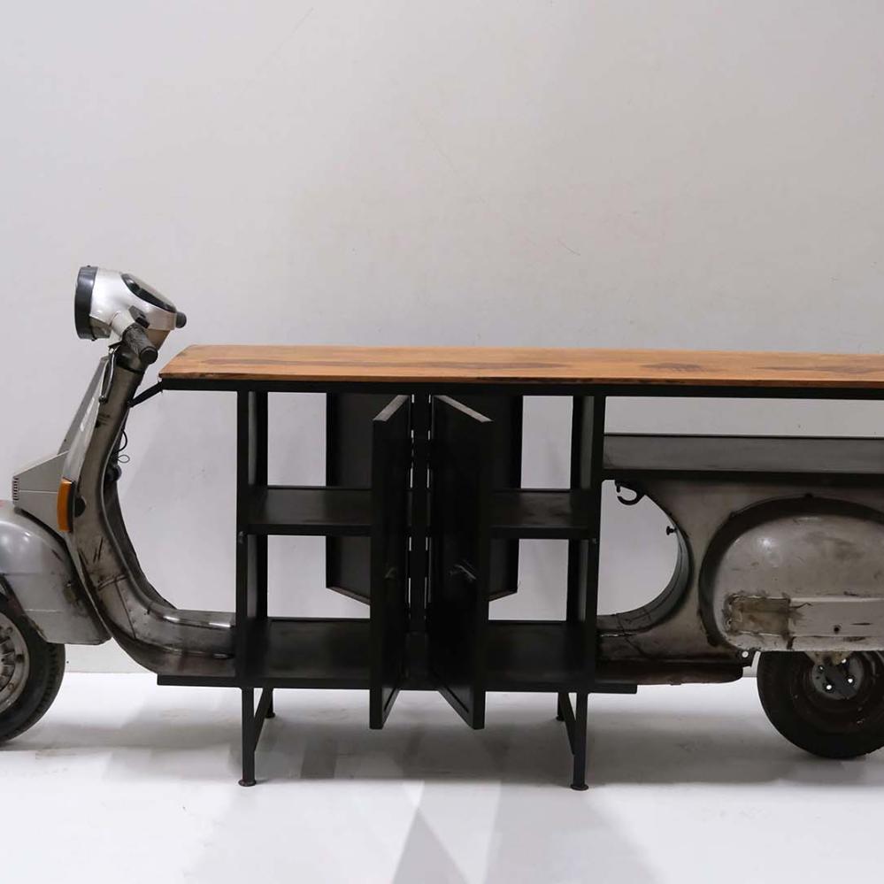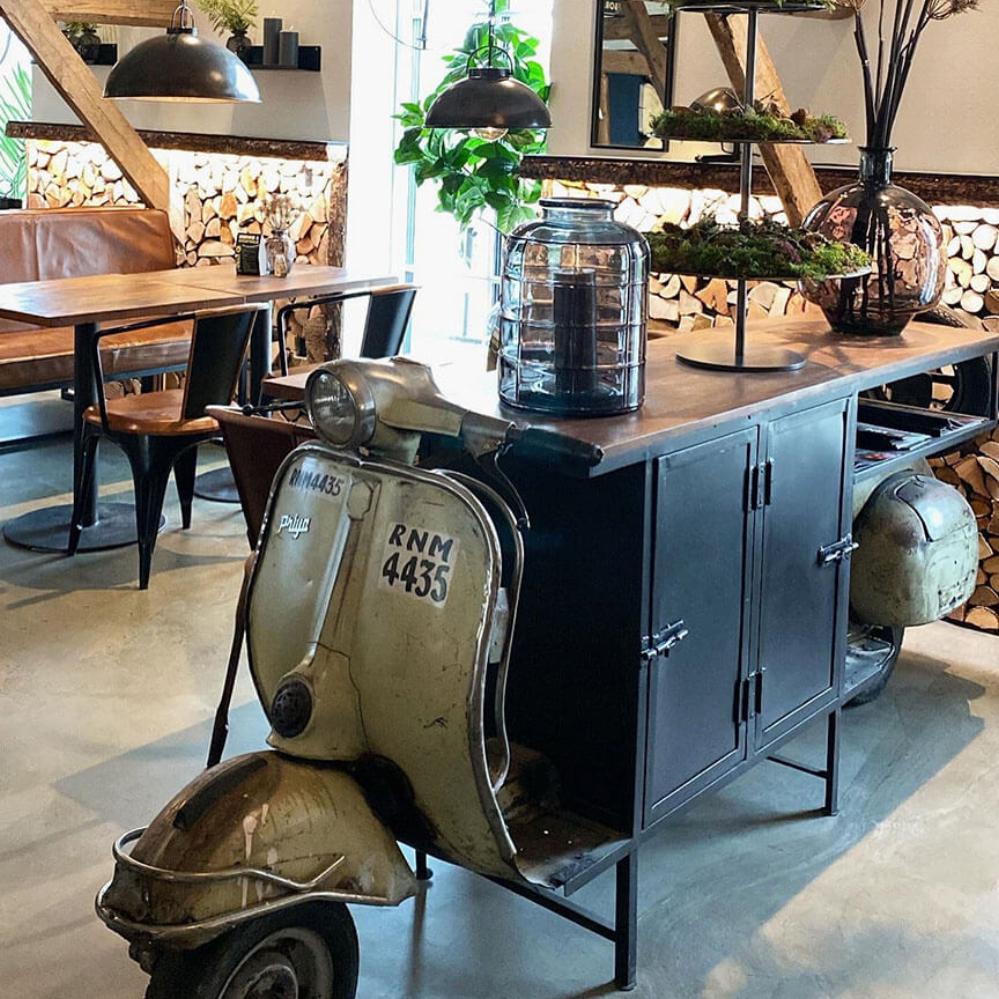 Upcycling auf coole Weise. Hier haben wir einen alten Roller benutzt und daraus einen lustigen und einzigartigen Bartresen gemacht. Ein echter Blickfang, der sowohl praktisch ist als auch Ihrem Dekor eine lustige Geschichte verleiht. Die Bartheke ist ideal in Ihrem Café oder Restaurant und kann auch perfekt in die Firmenkantine gestellt werden. Die Theke hat zwei Eisentüren auf jeder Seite und ein durchgehendes unteres Regal und ein mittleres Regal im Eisenschrank. Die Bilder sprechen für sich. Bitte nehmen Sie zur Kenntnis, dass bei der Bestellung dieser Theke ein großer Unterschied in der Farbe und Ausführung des Rollerteils sowie der oberen Platte aus Altholz vorkommen kann. Maße der Tischplatte: 167 cm lang und 49 cm tief. Plattenhöhe: 89,5 cm.