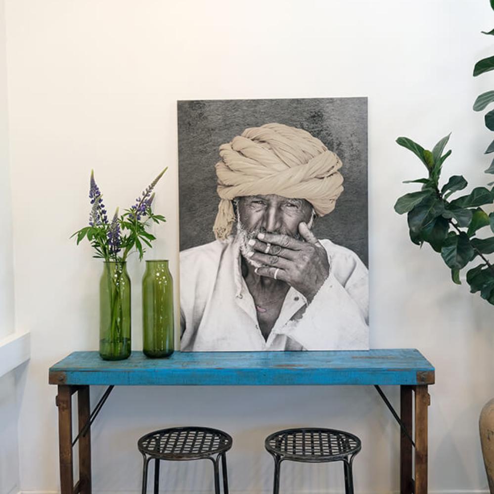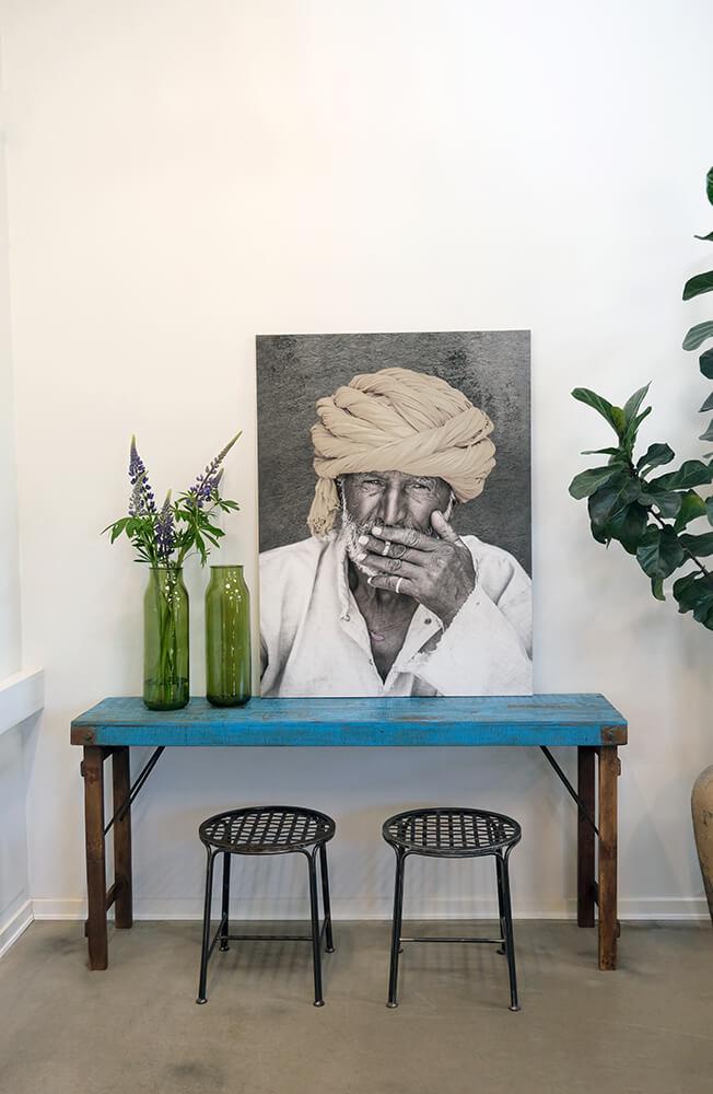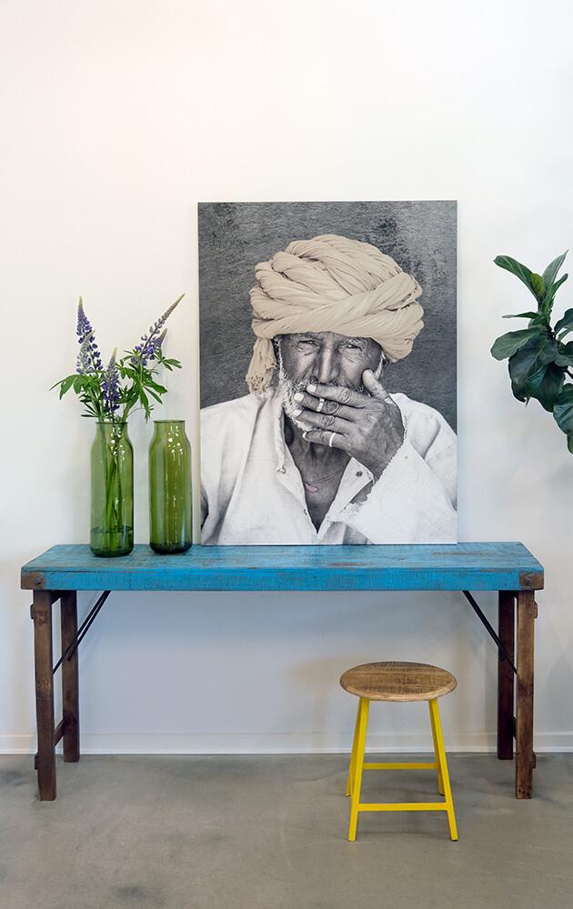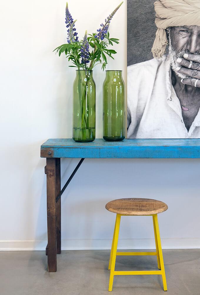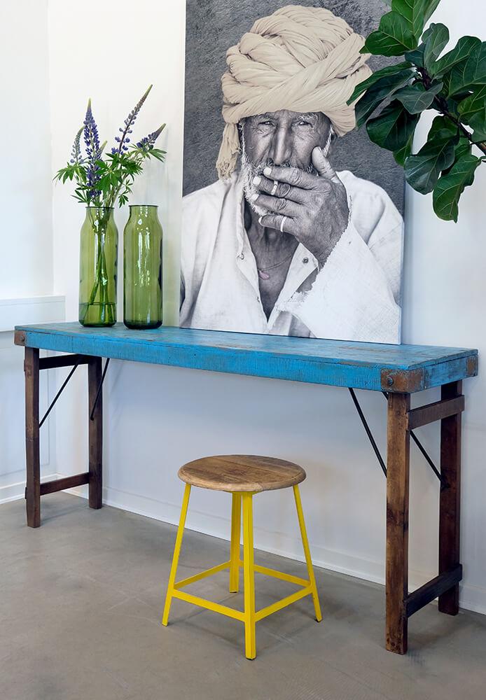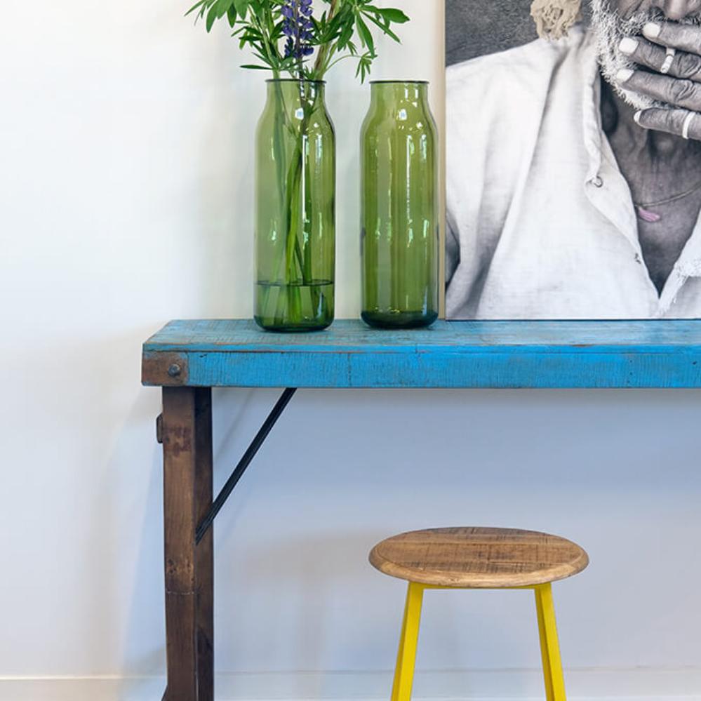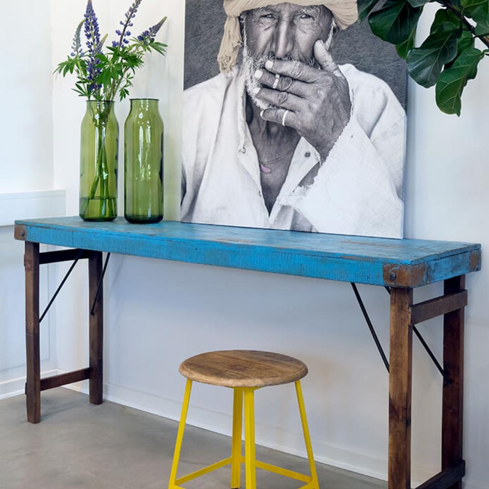 Konsolentisch aus Altholz mit blauer Oberfläche. Dieser rohe und charaktervolle Konsolentisch ist aus Altholz gefertigt und verleiht ihm ein einzigartiges und authentisches Aussehen. Die Patina des Holzes verleiht dem Tisch einen ganz besonderen Charme. Die klappbaren Beine und die Konstruktion zeugen von einem noch immer originellen Designansatz, der den wechselnden Trends der Zeit standgehalten hat. Der Konsolentisch eignet sich ideal, um in Ihrem Restaurant eine raue und coole Atmosphäre zu schaffen, sei es als Teil eines Servierbereichs oder als stilvolles Podium in einem Geschäft zur Präsentation von Waren. Im Zuhause kann der Tisch im Eingangsbereich oder Wohnzimmer verwendet werden und verleiht dem Raum eine rustikale Note mit viel Persönlichkeit. Bitte beachten Sie, dass einige Tische farbige Beine haben, während andere nicht.
