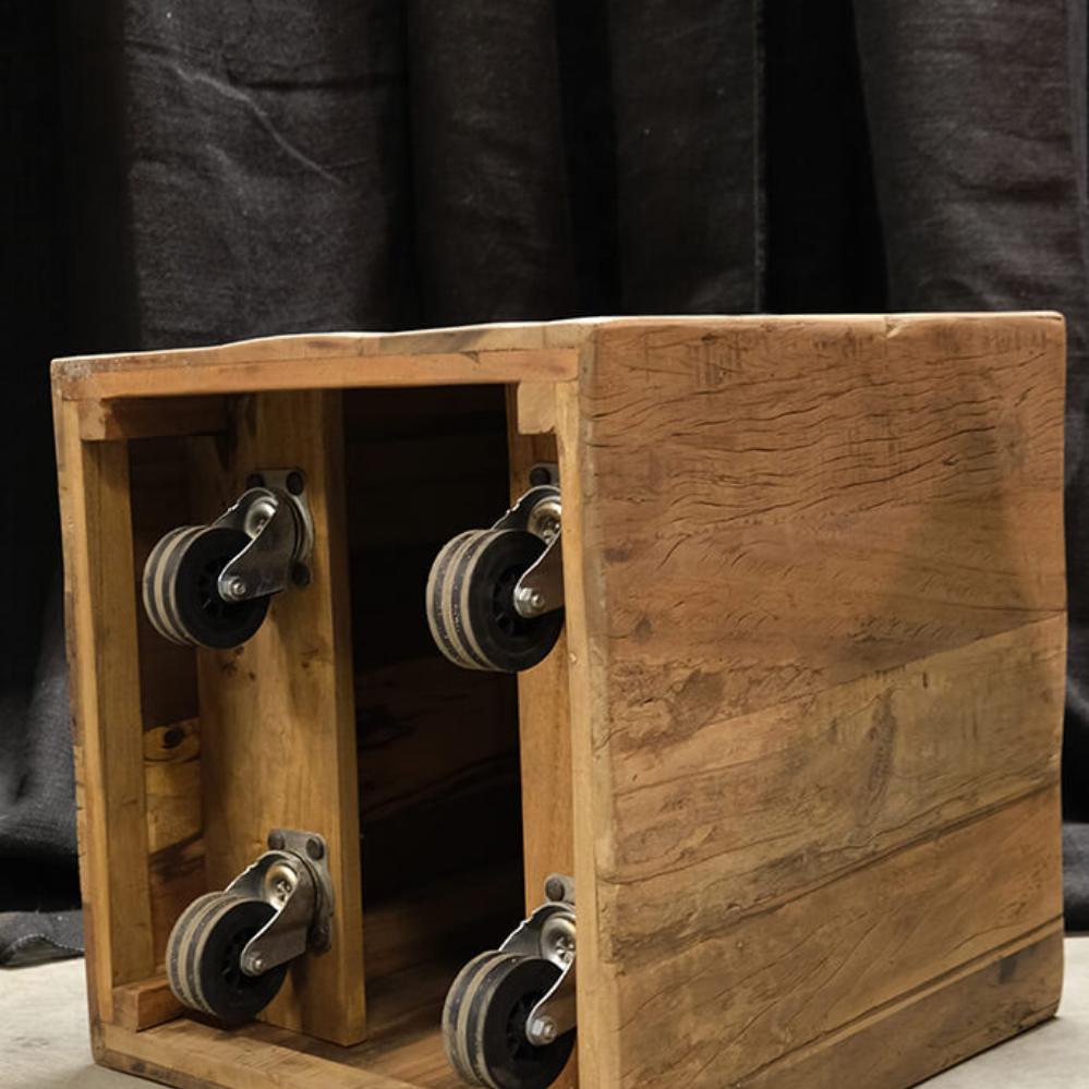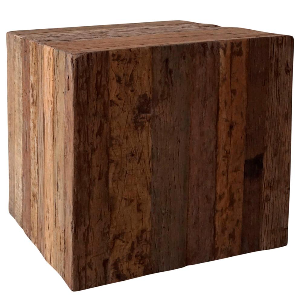 Dieses kubistische skulpturenartige Möbelstück aus Altholz ist eine Augenweide und kann sowohl als Hocker als auch als Tische verwendet werden. Es gibt 3 versteckte Rollen unten, die das Möbel flexibel und leicht beweglich machen. Passt gut in jeder Art von rustikalem Dekor.