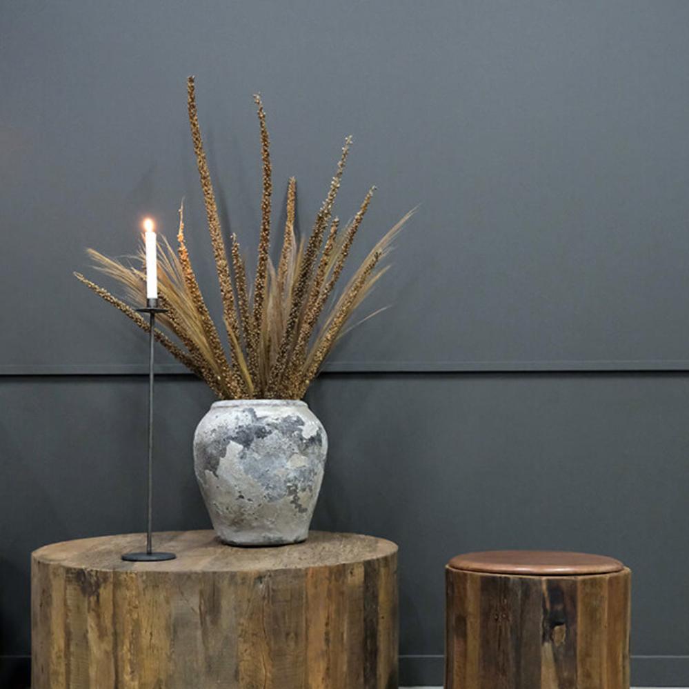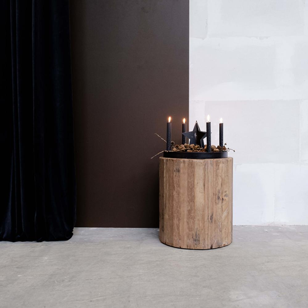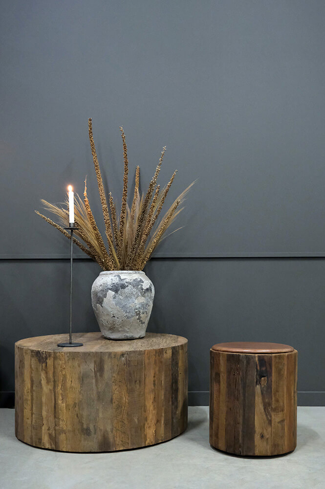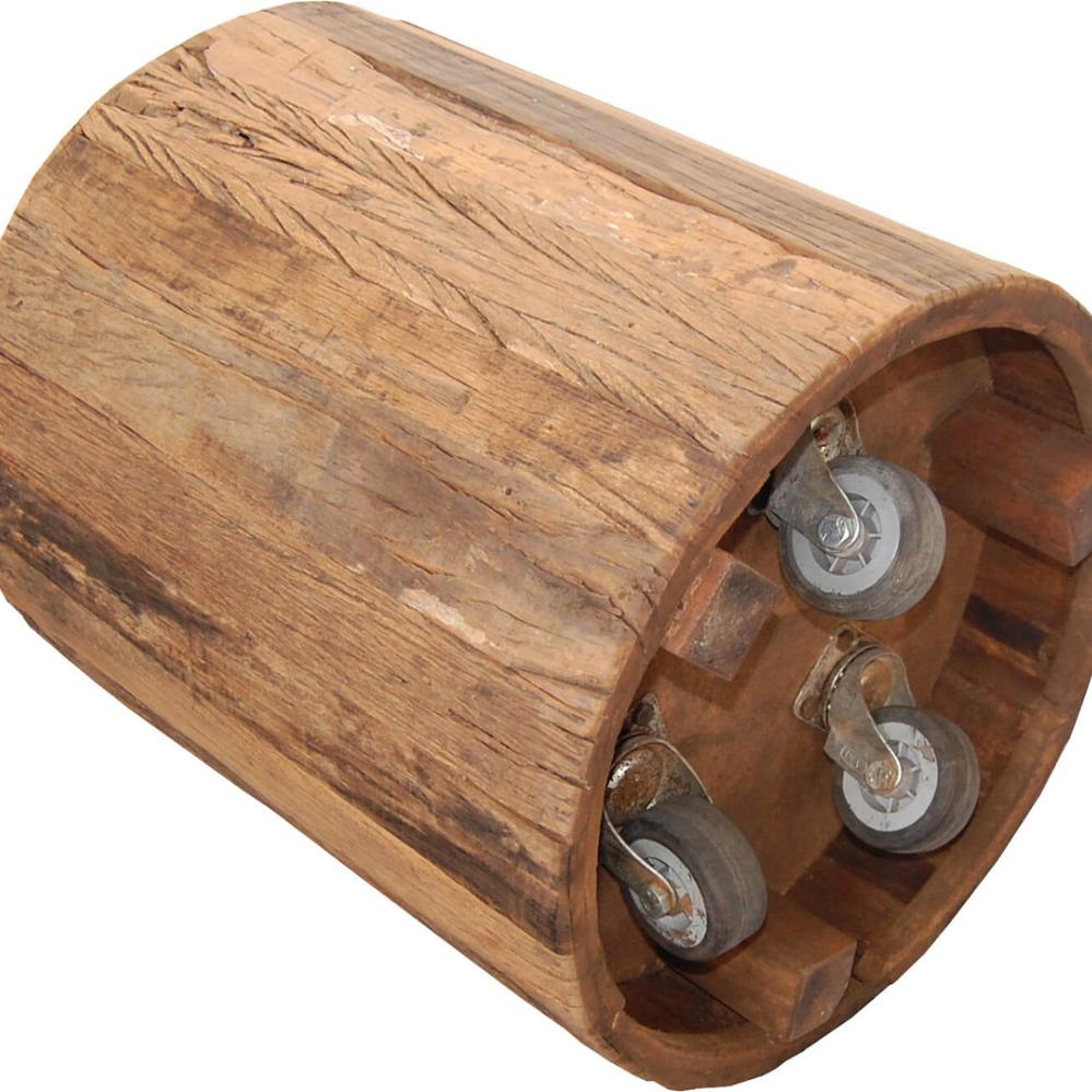 Diese zylindrische Schönheit ist eine Skulptur für sich. Sie ist aus Altholz hergestellt, und 3 Räder sind unten montiert. Die Skulptur hat mehrere Funktionsmöglichkeiten. Verwenden Sie sie als Hocker, Lampentisch, Nachttisch oder Couchtisch. Sie können ein rundes Sitzkissen bestellen, das perfekt mit den Maßen passt, wenn Sie sie als Hocker verwenden möchten. Suchen Sie im Shop nach Artikel-Nr. M1407.