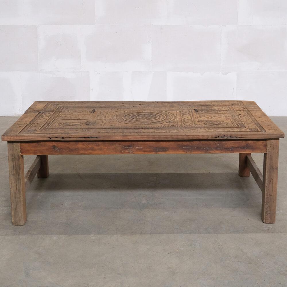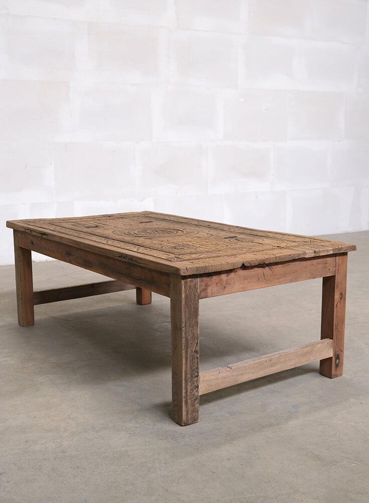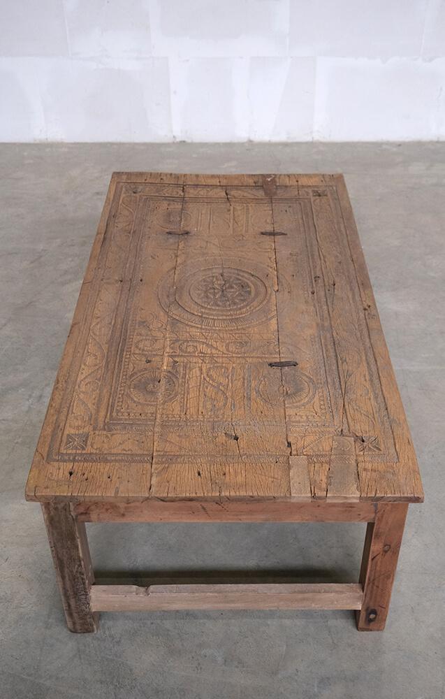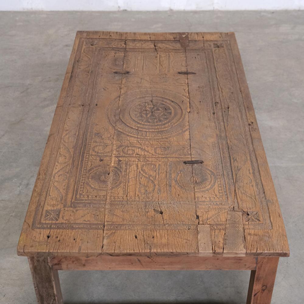 Dieser einzigartige Couchtisch ist ein Stück rustikaler und authentischer Handwerkskunst. Die Tischplatte ist mit wunderschönen Schnitzereien verziert, die dem Möbelstück eine markante und charaktervolle Ausstrahlung verleihen. Das Holz zeigt eine bezaubernde natürliche Patina und Gebrauchsspuren, die Geschichten aus seinem früheren Leben erzählen. Sein robustes Design und die handwerklichen Details machen den Tisch ideal für Einrichtungen, die Charme und Authentizität suchen. Perfekt als Mittelpunkt im Wohnzimmer oder als dekoratives Element in einem Ambiente, das Vintage und einzigartige Charakter schätzt.
