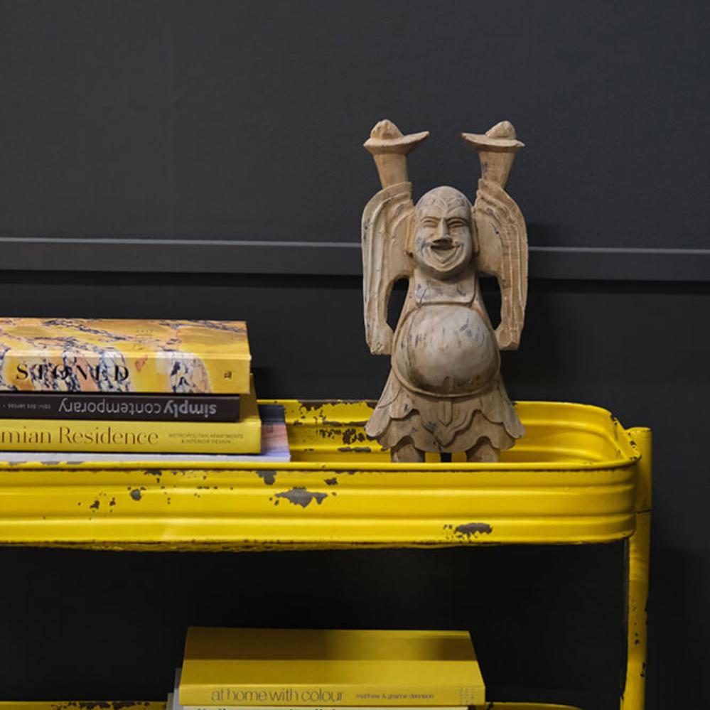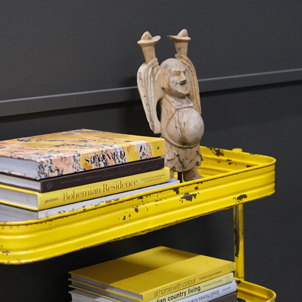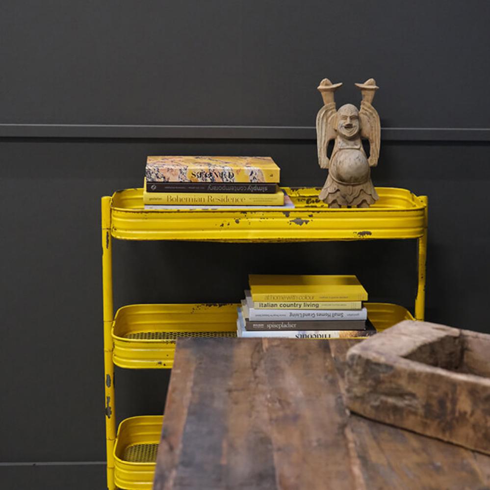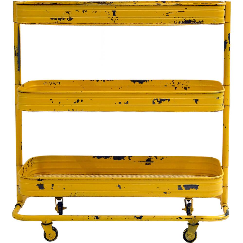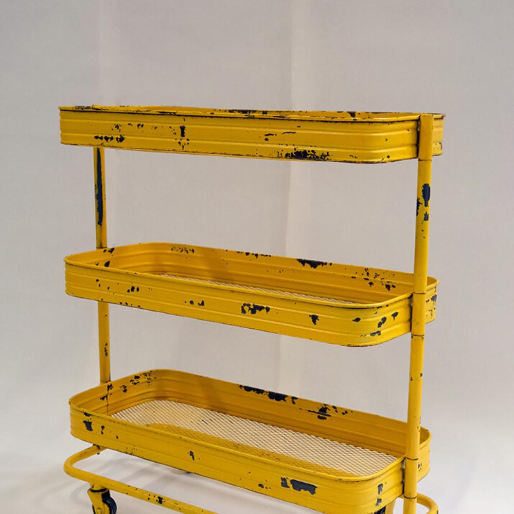 Dieser rohe und industrielle Rolltisch in auffälligem Gelb mit patinierten Details ist sowohl praktisch als auch dekorativ. Die drei geräumigen Ablagen haben einen Boden aus Drahtgitter, das für eine leichte Optik sorgt und gleichzeitig eine gute Übersicht über den Inhalt ermöglicht. Der Abstand zwischen der obersten und mittleren Ablage beträgt ca. 35 cm, zwischen der mittleren und unteren Ablage ca. 29 cm, was viel Stauraum bietet. Der Rollwagen ist mit vier Dekorollen ausgestattet. Perfekt für Cafés, Restaurants oder als cooler Hingucker in Ihrer Einrichtung. Wird unmontiert geliefert.