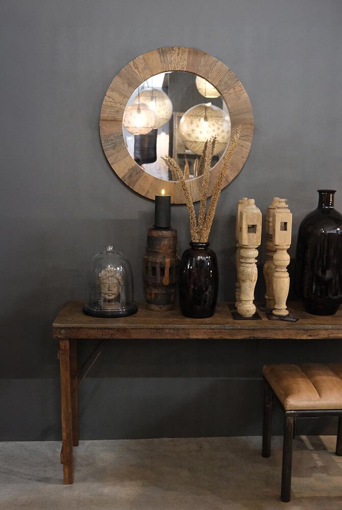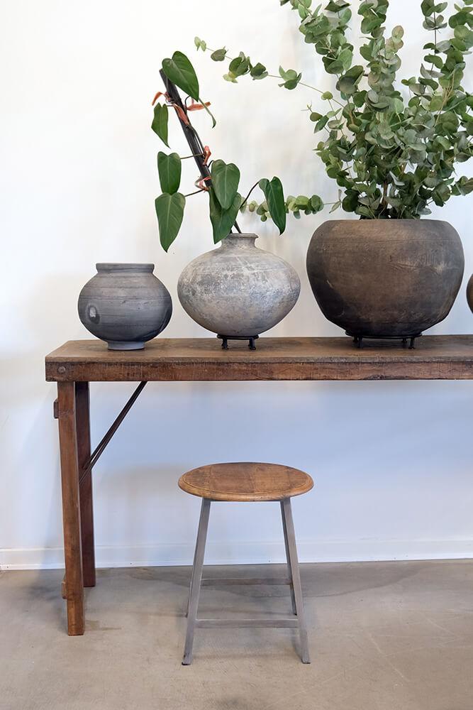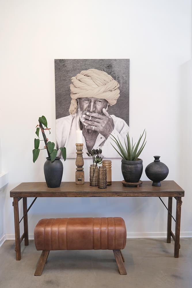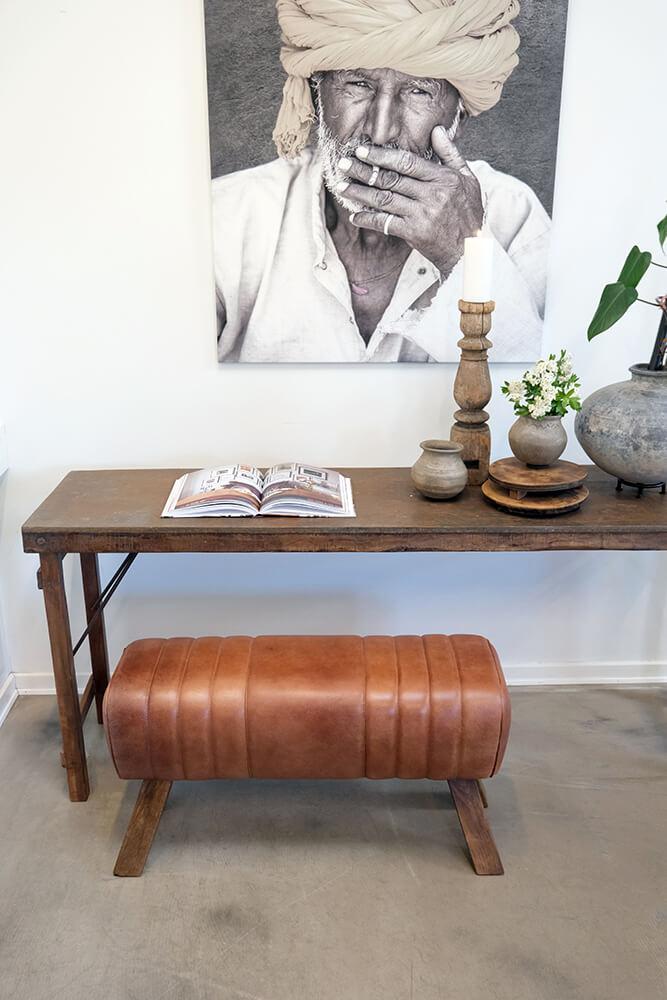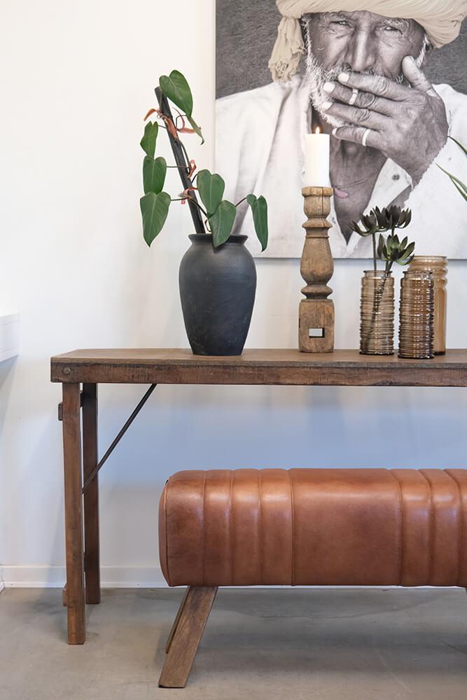 Dieser alte Konsolentisch zeigt stolz, woher er kommt – und was er erlebt hat. Die Metallplatte ist mit Würde abgenutzt, und das stabile Holzgestell trägt deutliche Gebrauchsspuren. Die Patina ist echt, ungleichmäßig und einfach unwiderstehlich – genau das macht diesen Tisch so besonders. Der Tisch ist klappbar und damit praktisch und flexibel – ideal für alle, die ihre Einrichtung häufiger wechseln als ihre Socken. Nutzen Sie ihn als Ablagetisch im Restaurant, als Präsentationstisch für Vasen und Skulpturen im Laden oder als spannenden Kontrast in einem ansonsten schlichten Zuhause. Ein Konsolentisch wie dieser verlangt keine Aufmerksamkeit. Er bekommt sie – egal, wo er steht.