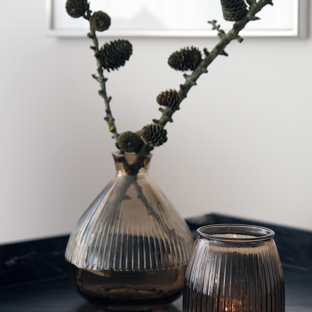 Eine kleine Vase mit großer Vielseitigkeit. Diese Aniston Vase aus mokkafarbenem, recyceltem Glas hat einen weichen Braunton und eine geriffelte Oberfläche, die Tiefe und Charakter verleiht. Verwenden Sie sie für einen kleinen Blumenstrauß, einen einzelnen Zweig oder ein Teelicht. Die Form und Größe passen perfekt zur Keaton Vase und dem passenden Glasweihnachtsbaum, und die Farbe harmoniert wunderbar mit natürlichen Tönen und dezenten Dekorationen.