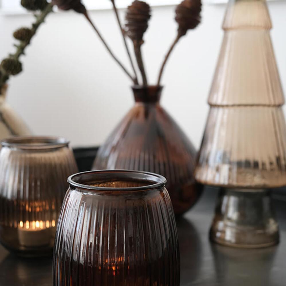 Mit ihrer tiefbraunen Farbe und weichen Form bringt diese Aniston Vase aus recyceltem Glas einen warmen Kontrast in helle wie dunkle Räume. Die geriffelte Oberfläche fängt das Licht auf schöne Weise ein, und wenn gerade kein Strauß zur Hand ist, eignet sie sich auch wunderbar als Teelichthalter. Kombinieren Sie sie mit der Keaton Vase und dem passenden Weihnachtsbaum für einen stimmigen Look mit Wärme und Charakter.