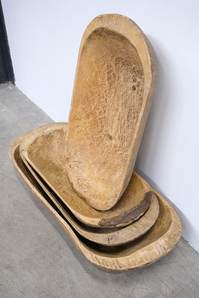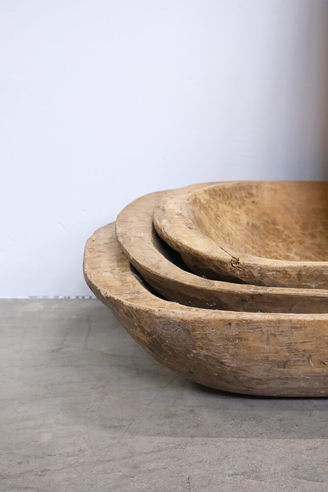 Schöne antike Teigschalen aus massivem Holz. Keine ist wie die andere. Jedes Stück trägt die Spuren von Handarbeit und Zeit, mit Patina und Variationen, die es zu etwas ganz Besonderem machen. Sie sind dekorativ einzeln, übereinandergestapelt oder gefüllt mit grünen Pflanzen, Zapfen oder Kerzen. Verwenden Sie die Schale als Dekoration auf einem Tisch, zur Aufbewahrung oder als natürliches Element in Ihrer Einrichtung.