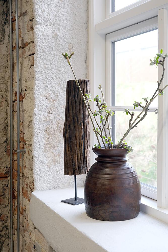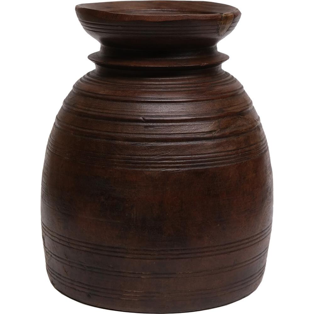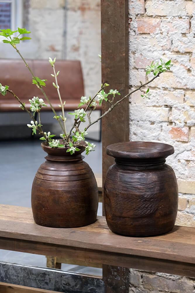 Dieser alte Holztopf ist alles andere als perfekt. Und genau das macht ihn so schön. Handgefertigt in Indien und aus massivem Holz geformt, das mit der Zeit eine wunderbare Patina entwickelt hat. Kratzer, Unebenheiten und Farbunterschiede sind keine Mängel. Sie sind Ausdruck von Charakter. Jeder Holztopf ist ein Unikat. Vielleicht wurde er früher zur Aufbewahrung genutzt, vielleicht für etwas ganz anderes. Das werden wir nie erfahren – und das ist auch egal. Denn es ist die Geschichte, die sich in der Oberfläche zeigt und dem Topf seine authentische Kante verleiht. Verwende ihn als Dekoration in deinem Laden oder Restaurant, wo er Wärme und Tiefe in die Einrichtung bringt. Oder stelle ihn in deinem Zuhause auf – mit Trockenblumen oder Zweigen. Er funktioniert solo genauso gut wie im Zusammenspiel mit anderen alten Fundstücken. Ein klassischer und zeitloser Topf mit viel Charakter und Ecken und Kanten.