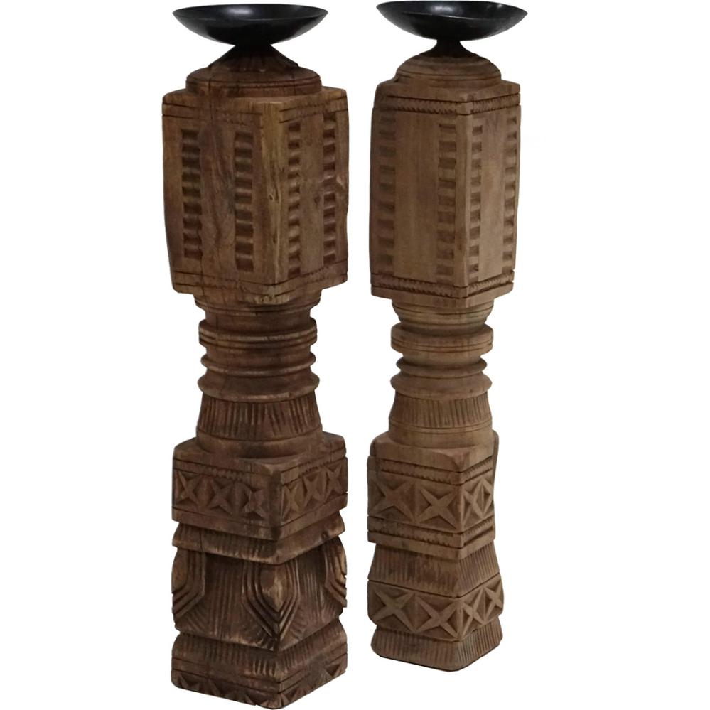 Sie sehen vielleicht aus wie etwas aus dem Eingangsbereich eines alten indischen Palasts, aber die Bastian Kerzenhalter sind mitten im modernen, rauen Interior-Universum gelandet. Sie sind aus Altholz handgefertigt und mit wunderschönen Schnitzereien versehen, die von Stück zu Stück variieren. Das massive Holz zeigt stolz Spuren seines früheren Lebens – genau das verleiht ihnen ihren authentischen Charakter. Kein Stück gleicht dem anderen, und genau das macht ihren Reiz aus. Die Schnitzereien erzählen von Handwerkskunst und Geschichte, während die dunkle Eisenschale oben einen spannenden Kontrast zum warmen Holz bildet. Platzieren Sie sie auf einem langen Restauranttisch, auf der Fensterbank im Wohnzimmer oder als skulpturales Element im Eingangsbereich. Sie wirken sowohl im Duo als auch aleinestehend und schaffen eine gemütliche Atmosphäre mit Charakter – ganz gleich, ob die Kerzen brennen oder nicht.