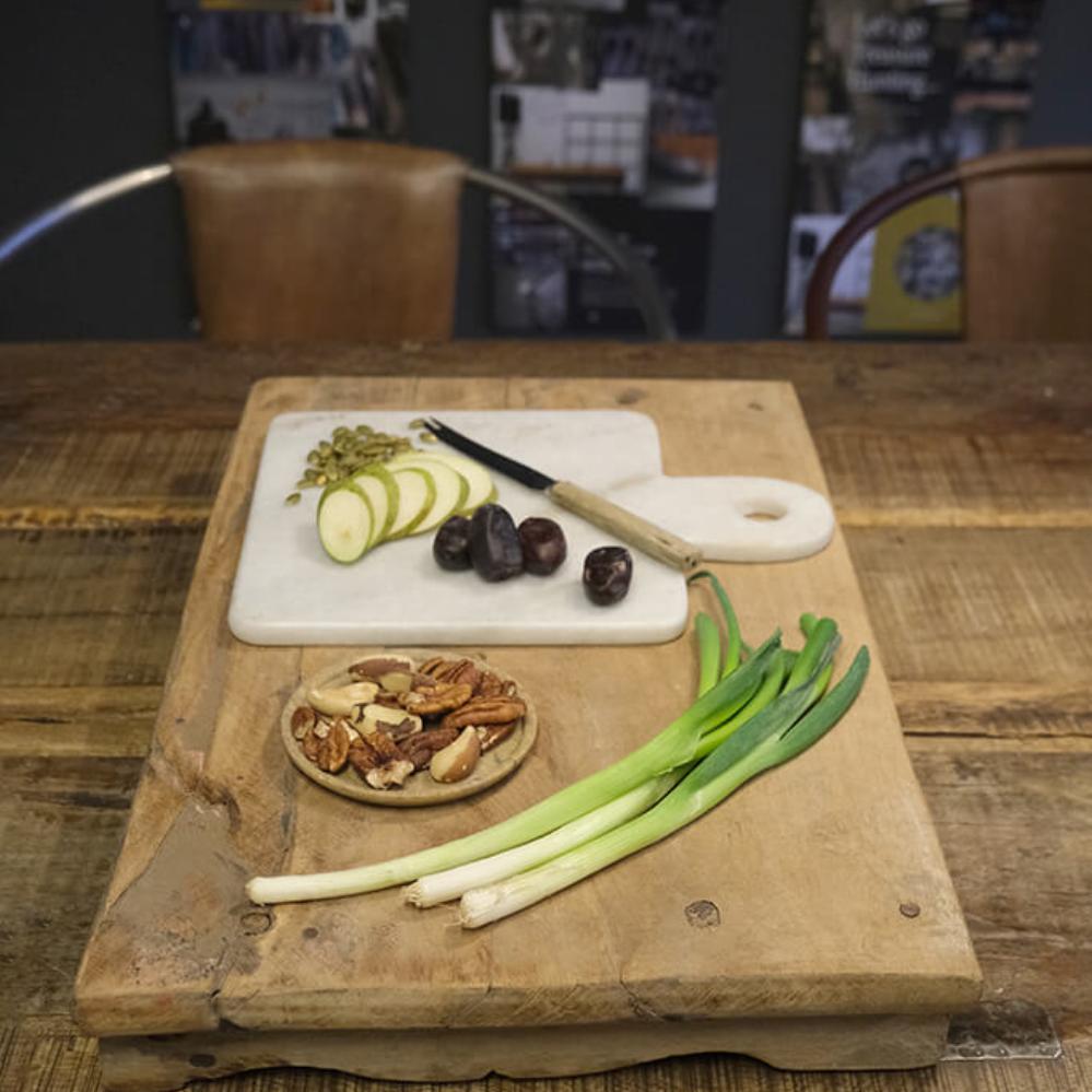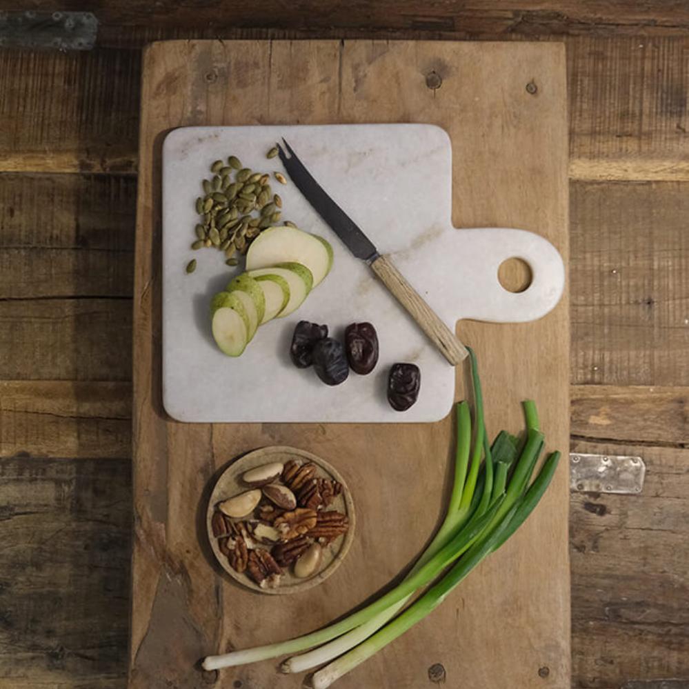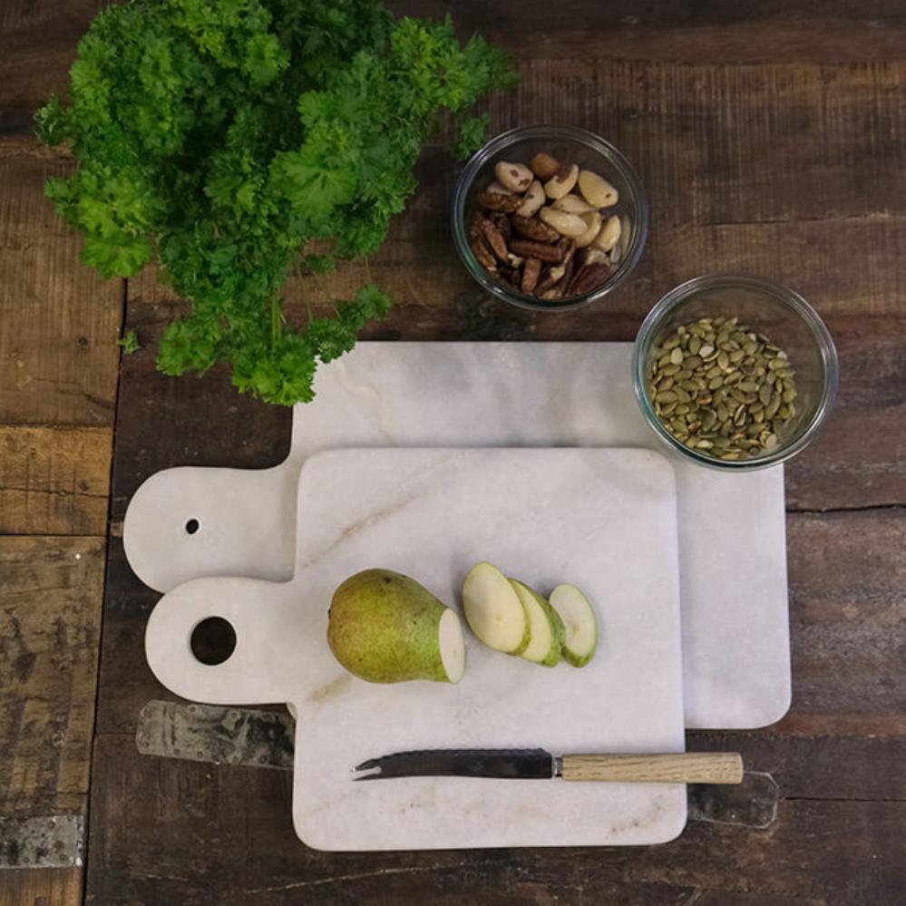 Sie können beide Seiten eines Schneidbretts aus Marmor zum Schneiden oder Servieren von zB Käse und Tapas verwenden. Das Schneidebrett aus hellem Marmor ist an sich schon dekorativ und wird in Ihrer Küche als Präsentationsplatte für Ihre Öle, Salze und Kräuter großartig aussehen. In puncto Hygiene ist Marmor das ideale Material für Schneidbretter oder Serviergeschirr, da es nicht porös ist und somit keine Flüssigkeiten aufnimmt. Verwenden Sie zur Reinigung des Schneidbretts aus Marmor einfach Wasser und Seife. Spülmaschine nicht zu empfehlen.