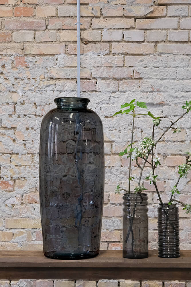 Schöne Bodenvase aus recyceltem Glas. Die hohe, schlanke Form macht sie ideal für Zweige der Saison oder dekorative Blumen. Die Vase ist in mehreren Farben erhältlich, damit Sie die Variante finden können, die perfekt zu Ihrem Zuhause oder Geschäft passt. Kleine Blasen und Unregelmäßigkeiten im Glas unterstreichen den natürlichen und einzigartigen Ausdruck der Vase, da sie aus Recyclingglas gefertigt ist.
