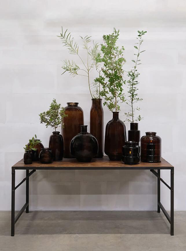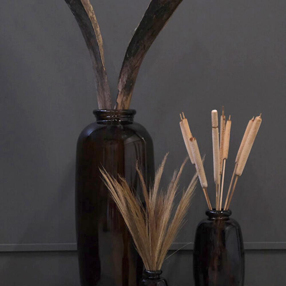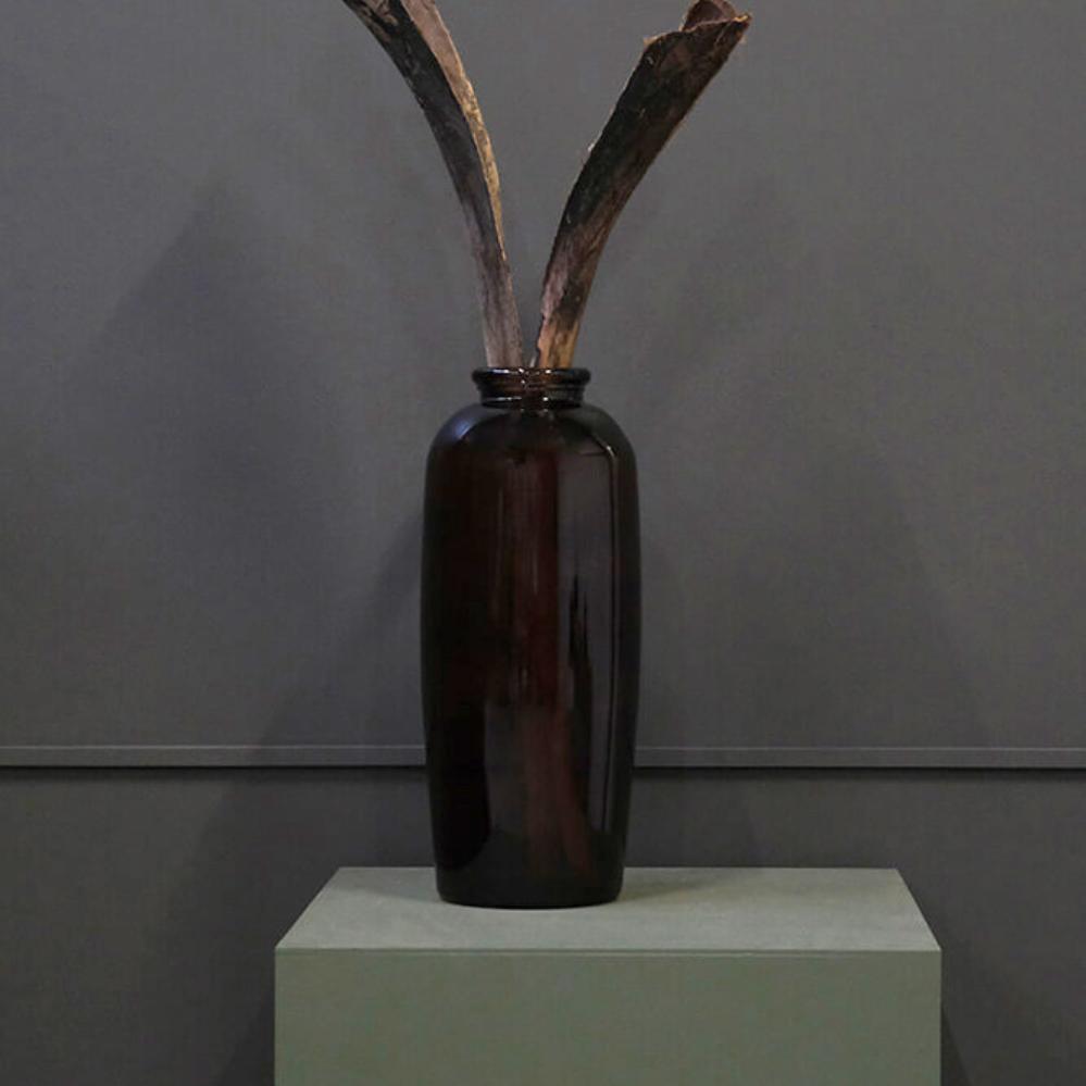 Große dekorative Vase in einer schönen Schokoladefarbe. Mit dieser großen Glasvase aus recyceltem Glas können Sie Ihrem Dekor einen schönen Blickfang verleihen. Dekorieren Sie die Vase mit tollen Sachen aus der Natur - großen Zweigen oder Blumen. Die Vase ist auch eine schöne Skulptur an sich. Sie können die Vase sowohl für die Einrichtung Ihres Hauses verwenden, aber sie eignet sich auch hervorragend für Ihr Unternehmen. Stellen Sie eine oder mehrere im Foyer eines Theaters, Hotels oder Kinos zusammen. Es wird eine großartige erste Begegnung sein, wenn Leute in Ihr Universum eintreten. Wenn Sie mit den Zweigen der Saison dekorieren, ist es auch schön, die Zweige mit den Weihnachts-/Osterndekorationen zu dekorieren. Nur einige Vorschläge für die vielen Verwendungsmöglichkeiten, die mit einer so großen, schönen Vase aus recyceltem Glas verfügbar sind.
