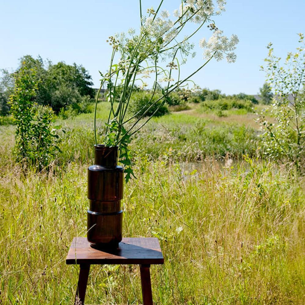 Diese stilvolle, schöne Schokoladefarbene Glasvase ist eine Skulptur und passt perfekt in das moderne Dekor. Die Vase hat eine Höhe, die es ermöglicht, sie auch als Bodenvase zu verwenden. Die Glasvase kann auch mit anderen Dekorationsgegenständen in verschiedenen Größen, Formen und Farben in einem Stilleben auf den Tisch gestellt werden, wodurch ein persönlicher und lebendiger Look entsteht. Die Vase ist aus recyceltem Glas.