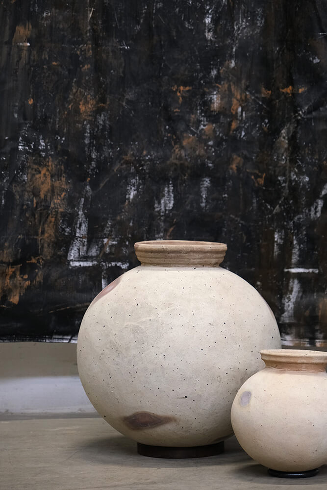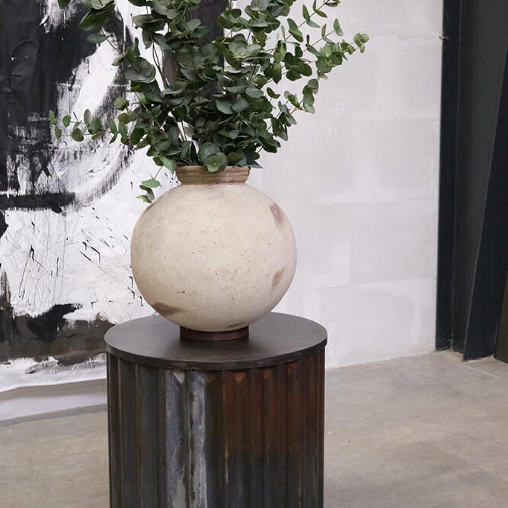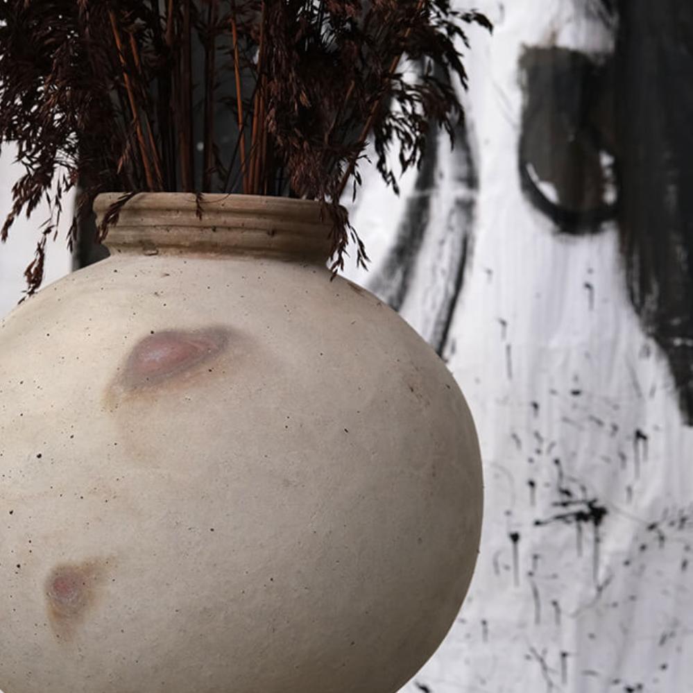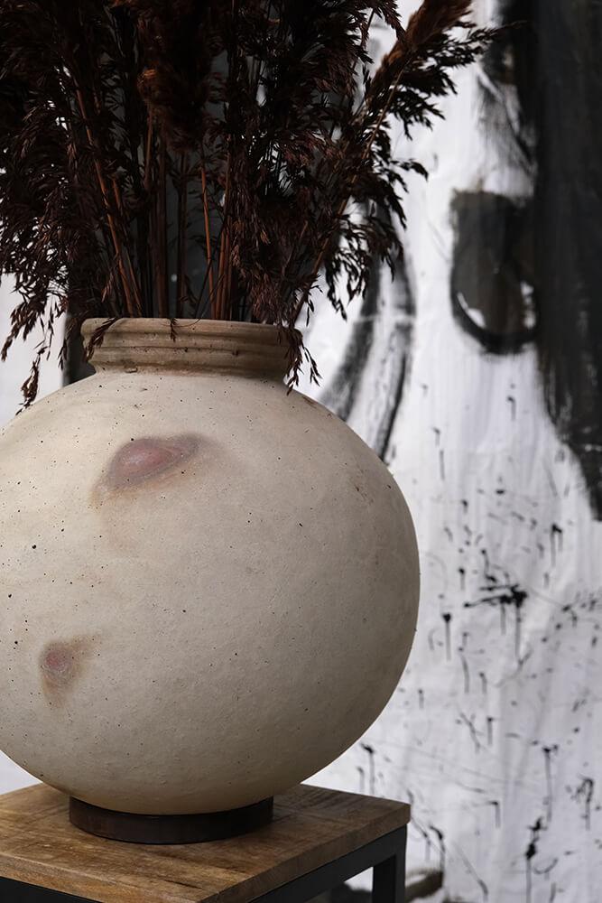 Dies ist der größte Dali-Tontopf mit einer Höhe von 44 cm. Die raue, helle Oberfläche und die schlichte Form verleihen ihm einen organischen Ausdruck, während der Eisenring am Boden für Stabilität sorgt. Verwenden Sie ihn als dekoratives Element, zum Beispiel mit getrockneten Blumen. Der Tontopf ist in zwei kleineren Größen erhältlich – bitte beachten Sie, dass er nicht wasserdicht ist.