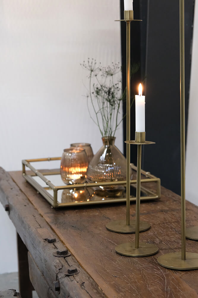 Dieser 30 cm hohe Kerzenständer ist der kleinste in der Dean-Serie, doch an Charakter mangelt es ihm keineswegs. Er ist aus Eisen gefertigt und in einer warmen Messingfarbe lackiert, die ihm einen ruhigen und zeitlosen Ausdruck verleiht. Durch seine kompakte Höhe lässt er sich leicht platzieren, ideal auf dem Esstisch, einem Regal, einer Anrichte oder als Teil einer dekorativen Anordnung. Der Kerzenständer wirkt schön für sich allein, entfaltet aber seine volle Wirkung besonders in Kombination mit den höheren Kerzenständern der Serie. So können Sie Variation und Tiefe in der Einrichtung schaffen, ohne dass es zu schwer wirkt.