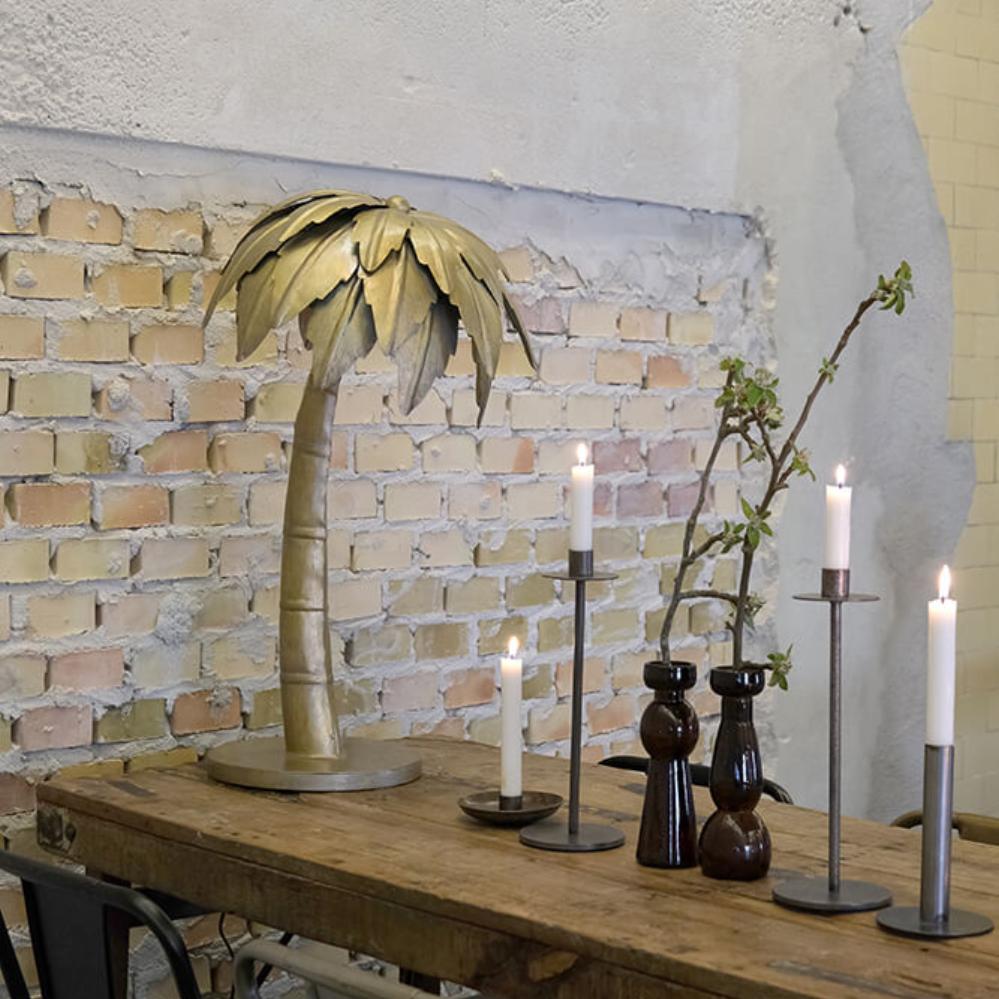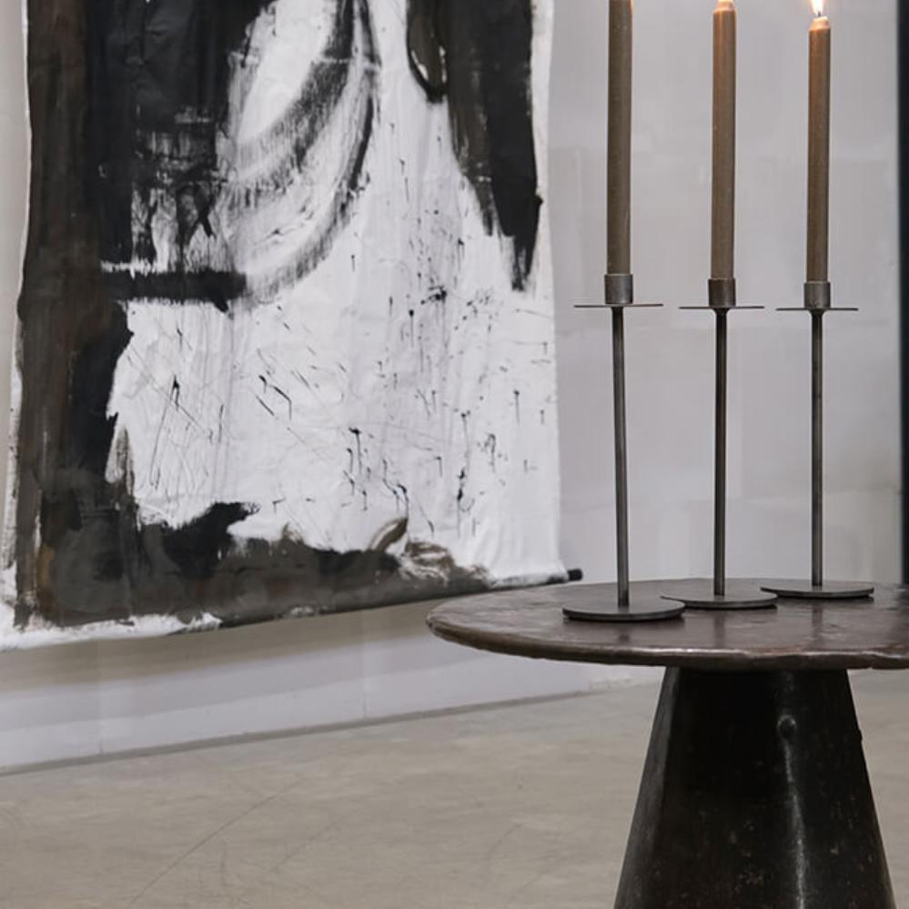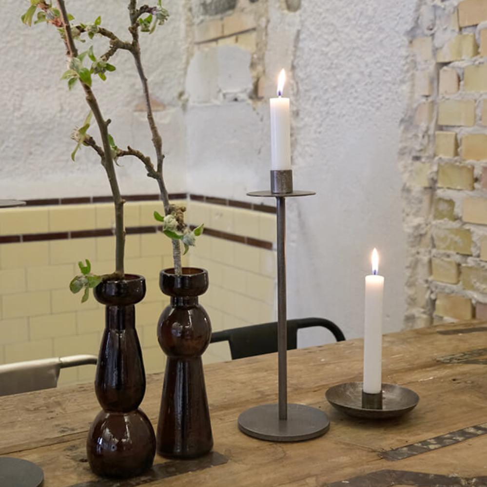 Dieser Kerzenhalter aus Eisen ist schlicht und zeitlos im Design. Er hat eine schlanke Form und steht auf einem runden Fuß, der für Stabilität sorgt. Oben befindet sich ein dezenter Halter für eine Kerze, der sicherstellt, dass die Kerze sicher steht und ohne zu tropfen brennt. Der minimalistische Ausdruck und das rohe, industrielle Aussehen machen diesen Kerzenhalter zur idealen Wahl für alle, die ihrer Einrichtung einen maskulinen Touch verleihen möchten. Perfekt, um in modernen und rustikalen Räumen Gemütlichkeit und Atmosphäre zu schaffen. Stellen Sie ihn auf den Boden zusammen mit den drei anderen passenden Größen der Dean-Serie oder verwenden Sie ihn allein in Ihrer Tischdekoration oder als Teil eines Stilllebens.