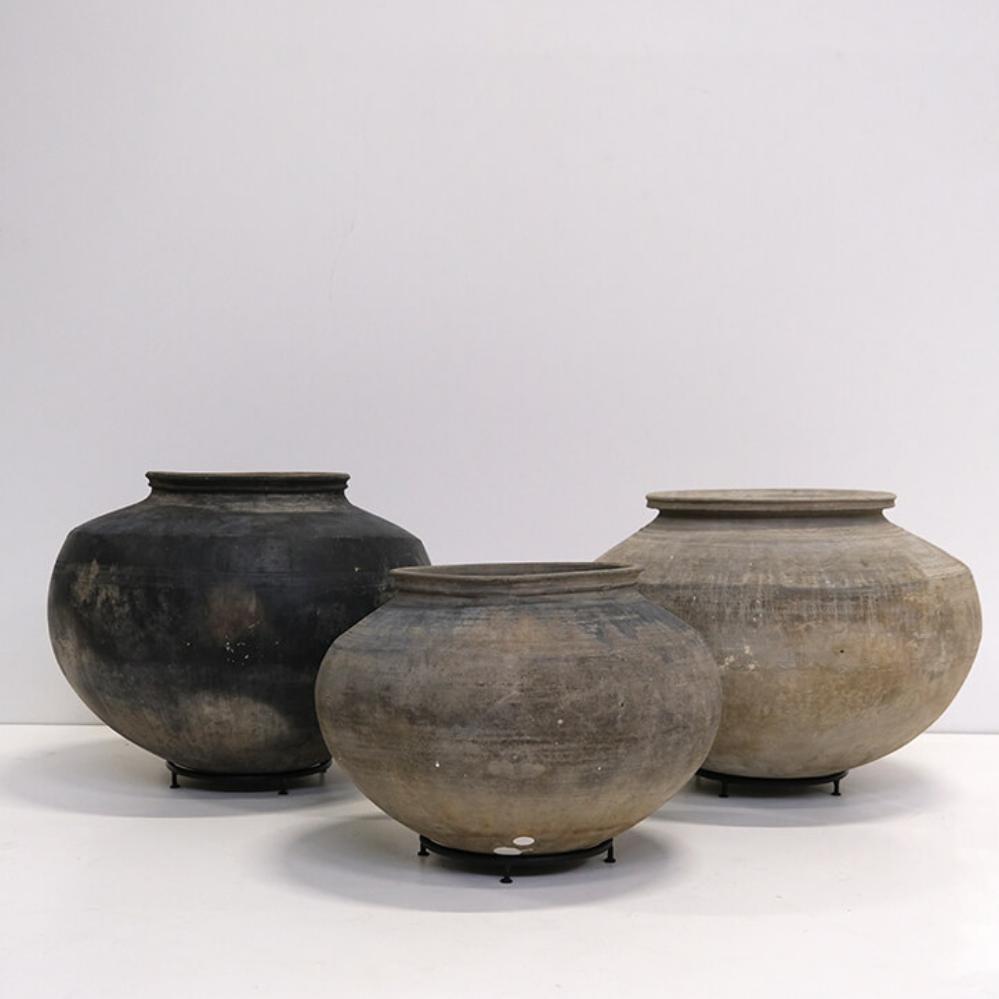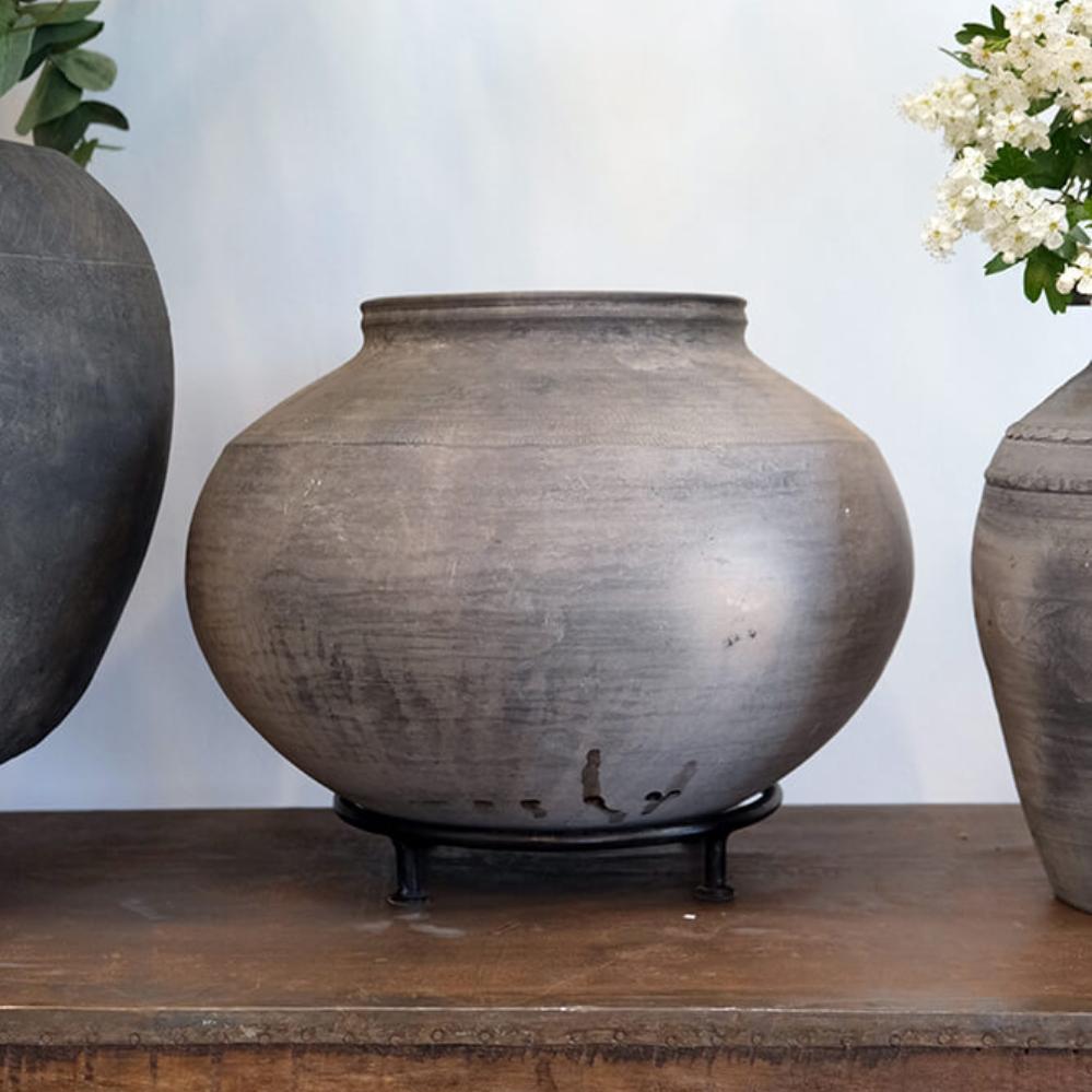 Dieses einzigartige Tongefäß auf losem Eisengestell ist absolut fantastisch. Der Topf hat eine schöne, schlichte Form und ist ein wunderbarer Blikfang für Ihr Haus oder Geschäft. Alle Gefäße unterscheiden sich stark in Größe, Farbe und Ausführung und können kleine Risse und Scherben aufweisen. Der Topf ist alt und handgemacht. Der Topf ist nicht wasserdicht, kann aber mit einem Glas-/Kunststoffeinsatz für Pflanzen verwendet werden.