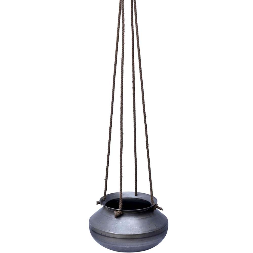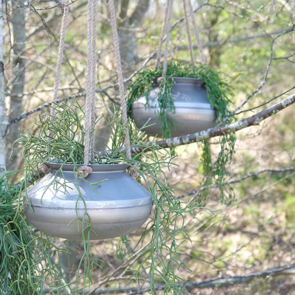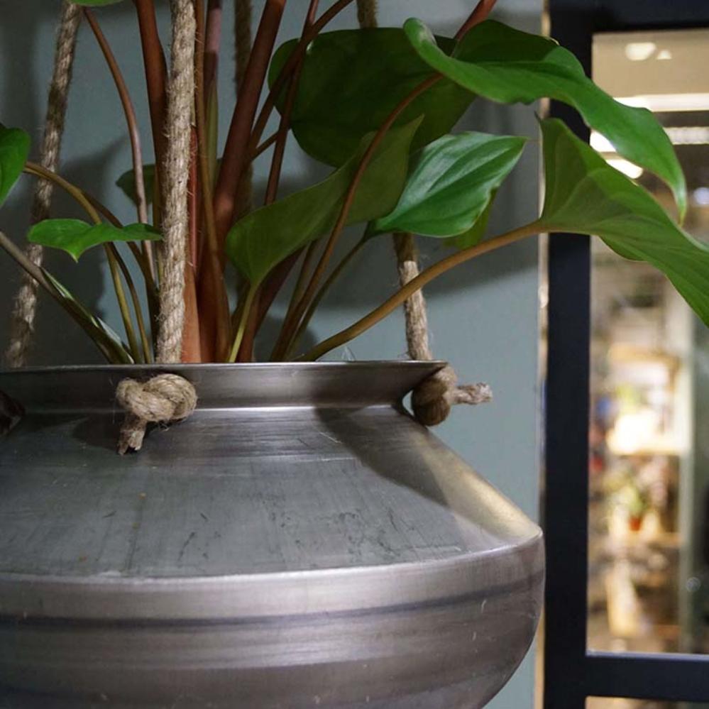Hängetopf aus Metall mit geflochtenem Naturseil. Hängende Pflanzen in Ihrem Dekor sind modern wie nie zuvor. Für eine einzigartige und botanische Atmosphäre im Innenbereich.