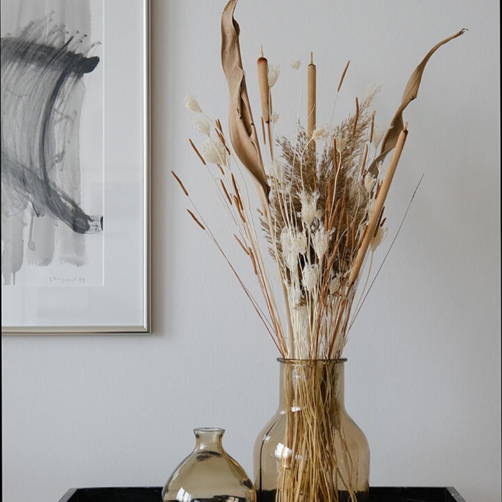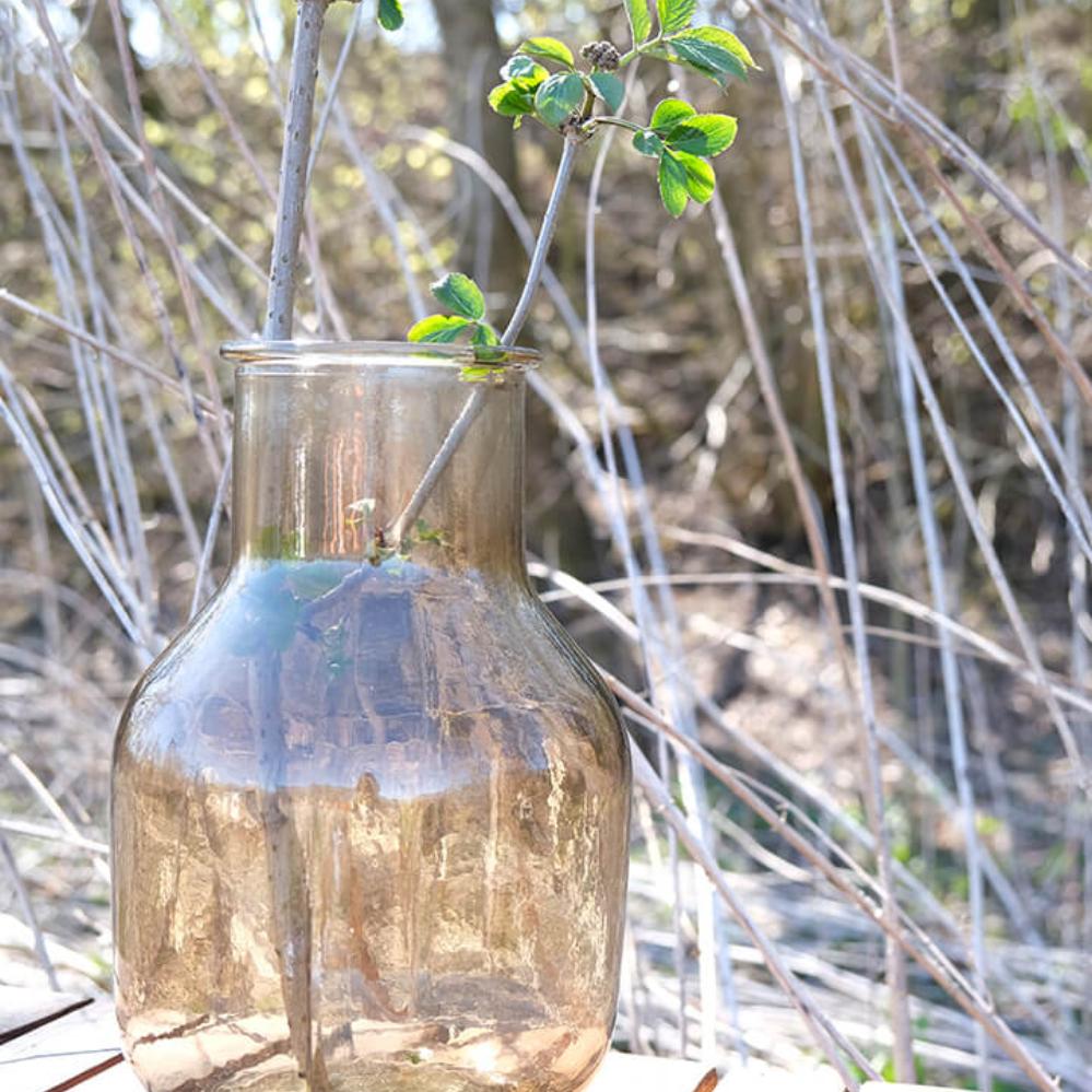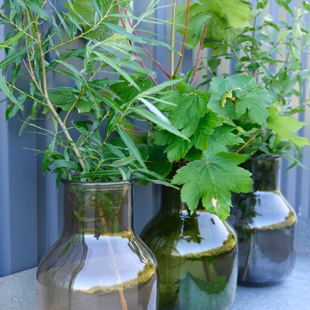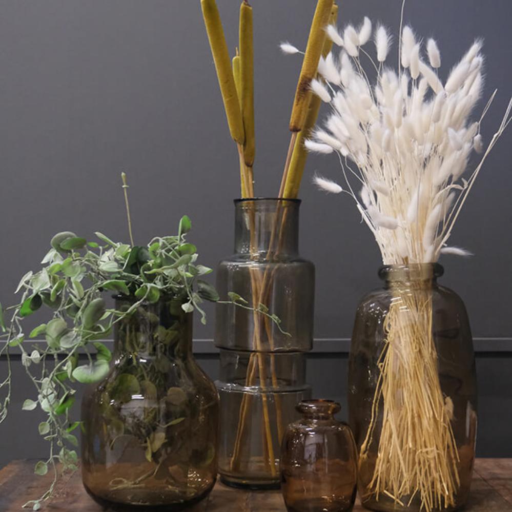 Einfache und schöne Flora Glasvase aus Recyclingglas. Die rauchfarbene Flora Vase ist für sich genommen dekorativ, kann aber auch vorteilhaft mit lebenden oder getrockneten Blumen geschmückt werden. Mit einer LED-Leuchte kann die Vase auch verwendet werden, um eine gemütliche Beleuchtung im Zuhause zu schaffen.