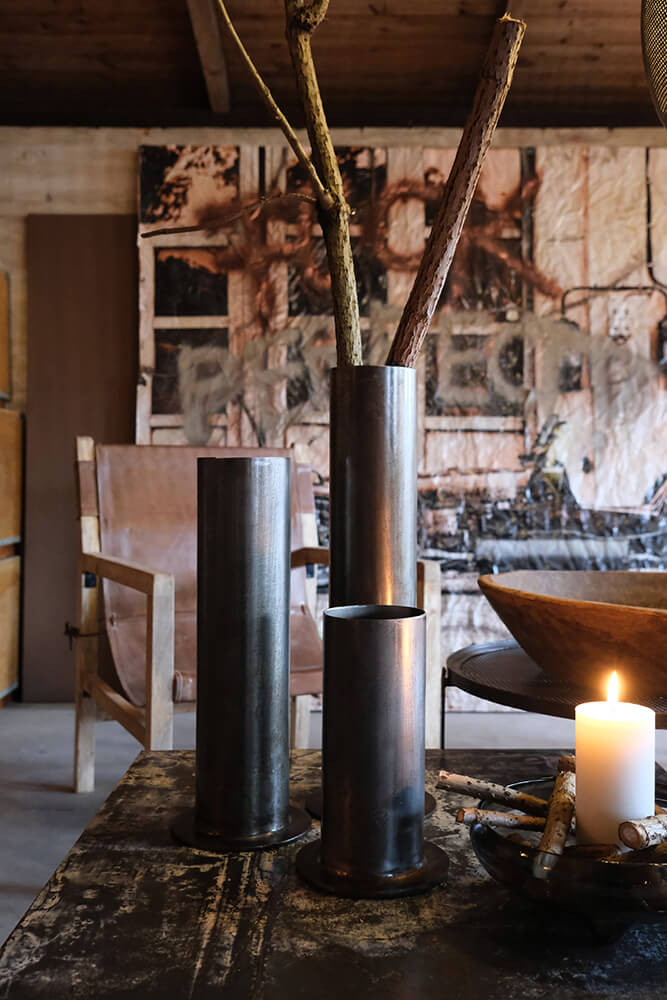 Mittelhohe rustikale Vase aus pulverbeschichtetem Eisen. Die Roheisen-Optik und das minimalistische Design sind zeitlos und fallen auf. Die Vase ist perfekt für Zweige oder geschnittene Pflanzen und Blumen und verleiht Ihrem Esstisch oder wo immer Sie sonst eine Vase platzieren, eine raue Atmosphäre. Wir empfehlen die Verwendung eines Einsatzes, da die Vase sonst rostet, und wir nicht garantieren können, dass sie 100 % wasserdicht ist.