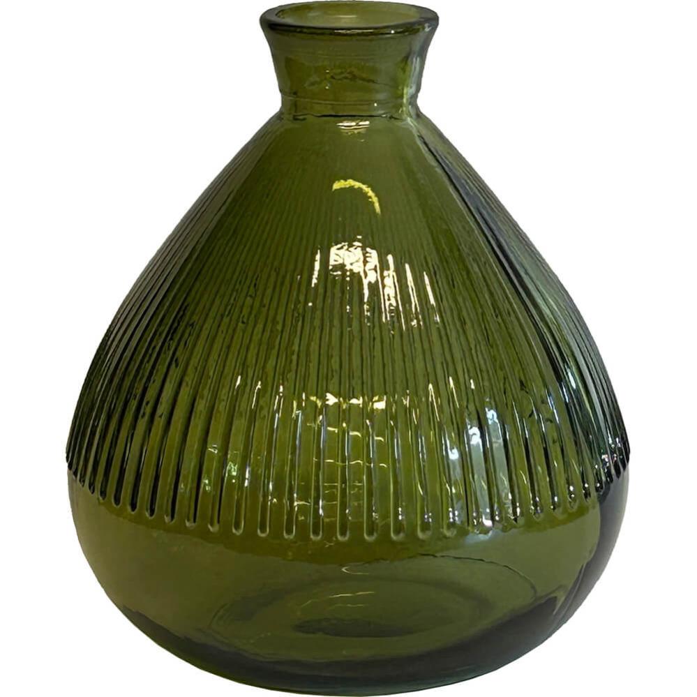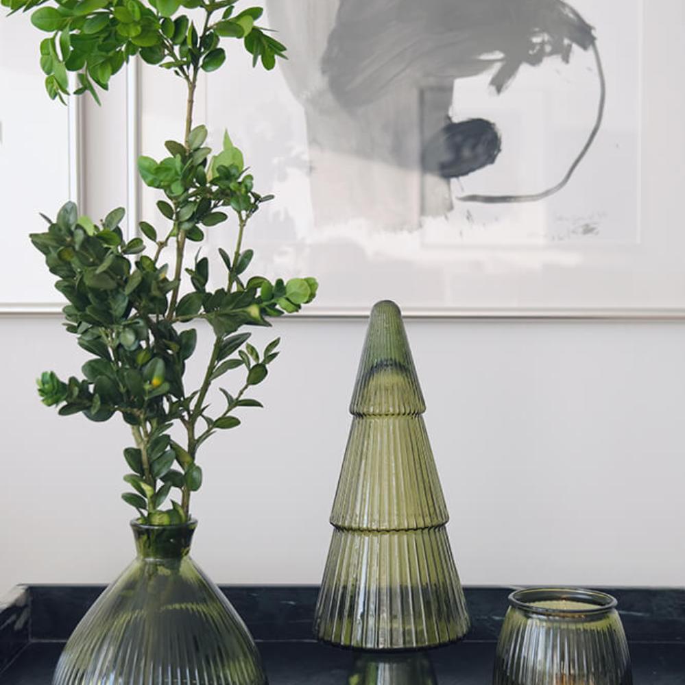 Diese Vase verbindet Natürlichkeit mit dekorativer Eleganz. Die olivgrüne Keaton Vase aus recyceltem Glas hat eine weiche Rundung und feine Rillen, die der Oberfläche Leben einhauchen. Die Farbe harmoniert mit allem von Kiefernzweigen bis Frühlingsgrün und passt perfekt zur Aniston Vase und dem charakteristischen Weihnachtsbaum im selben Grünton. Verwenden Sie sie einzeln oder als Teil eines Arrangements und lassen Sie sie für sich selbst sprechen.