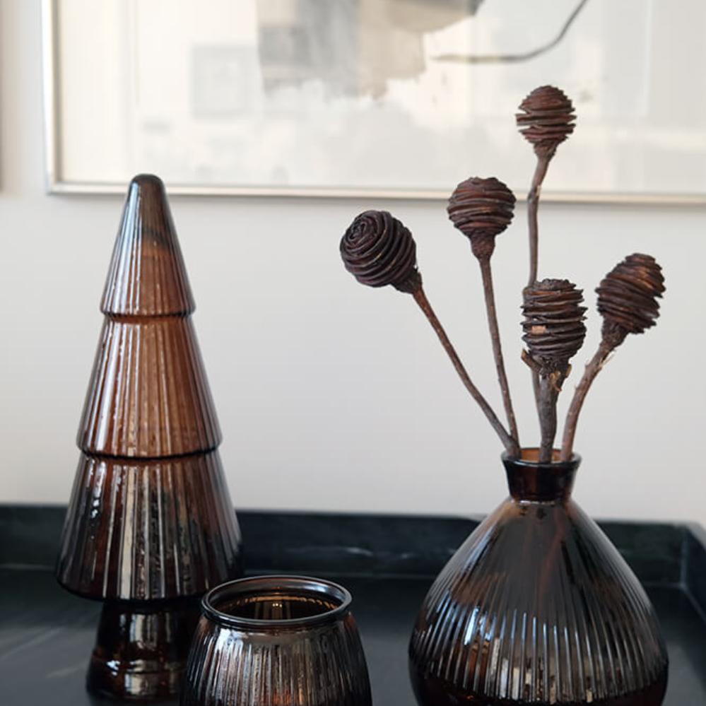 Die tief schokoladenbraune Farbe dieser Keaton Vase bildet einen schönen Kontrast zu helleren Umgebungen. Ihre runde Form und geriffelte Oberfläche in Kombination mit recyceltem Glas verleihen ihr Charakter und Präsenz. Befüllen Sie sie mit Trockenblumen oder lassen Sie sie leer stehen. Die Farbe lässt sich ideal mit der Aniston Vase und dem passenden Weihnachtsbaum kombinieren, wenn Sie ein stimmiges Arrangement mit Wärme und Tiefe wünschen.