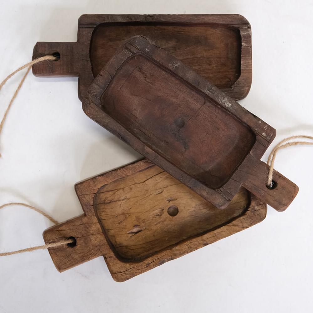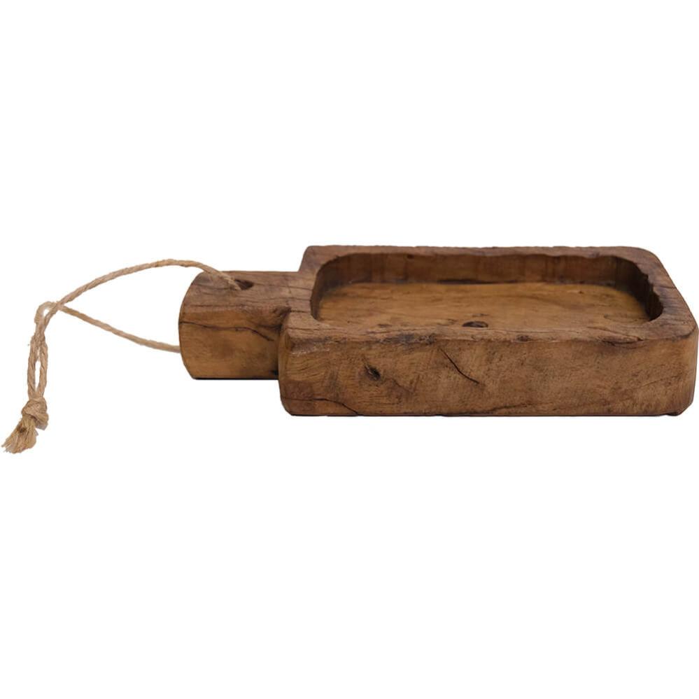 Kleines Tablett mit Griff aus Altholz. Das Holztablett ist handgefertigt und zusammen mit den kleinen Variationen des Altholzes bedeutet dies, dass jedes seine eigenen kleinen Unterschiede hat. Die Holztabletts haben eine Schnur am Griff und können daher zusammen mit Ihren Schneidebrettern an die Wand gehängt werden. Verwenden Sie diese kleinen, rustikalen Tabletts, um Ihre Einrichtung besonders rustikal zu gestalten.