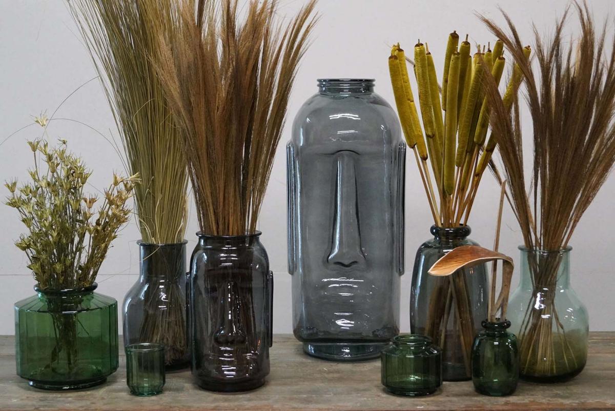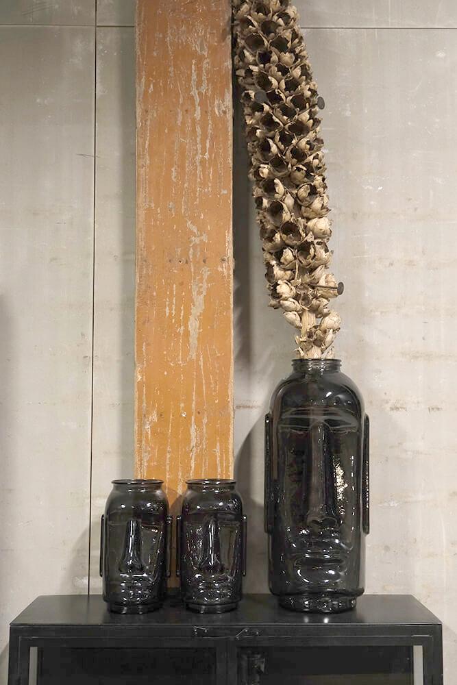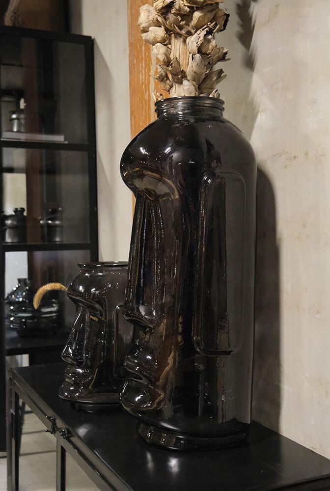 Wunderschöne Glasvase mit einem anderen und aufregenden Design in Form eines Gesichts. Die Glasvase ist unglaublich schön, sowohl wenn frische Blumen / Zweige oder ein großes Blocklicht drin sind, aber sie schmückt auch in sich. Die Glasvase verleiht Ihrer Einrichtung definitiv das gewisse Etwas. Die Vase besteht aus recyceltem Glas, daher können kleine Blasen und Unregelmäßigkeiten im Glas vorhanden sein.