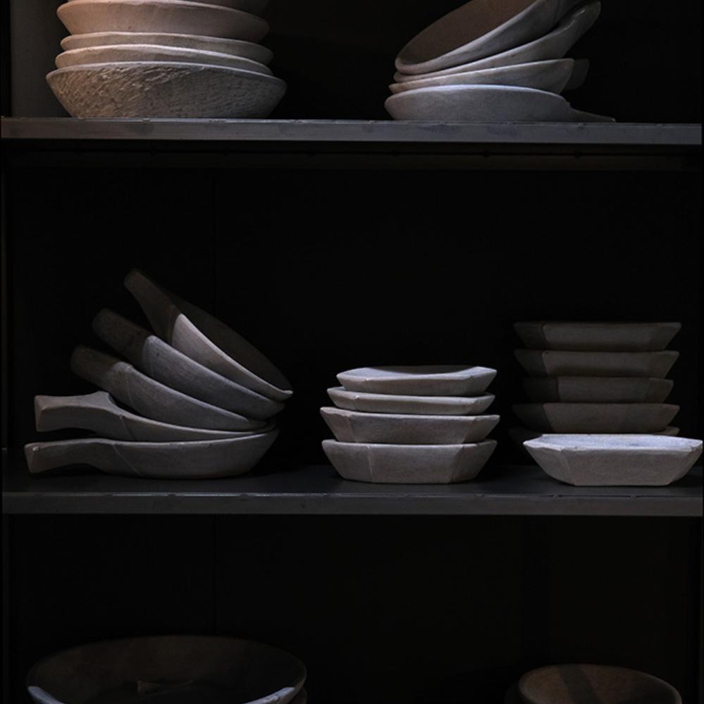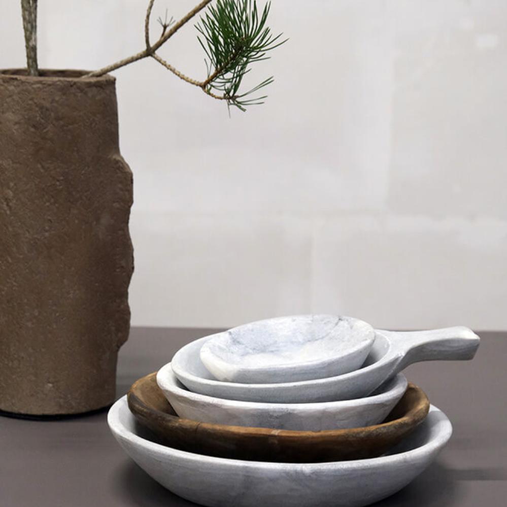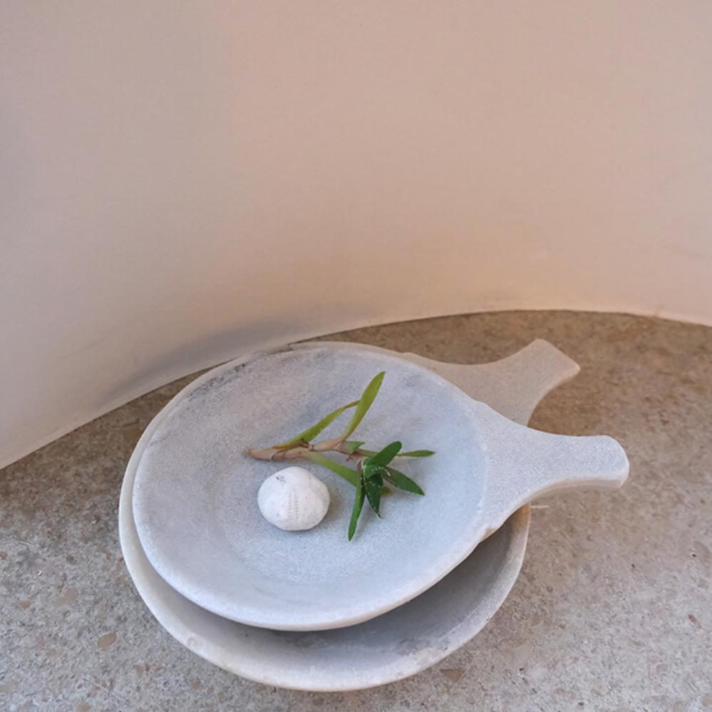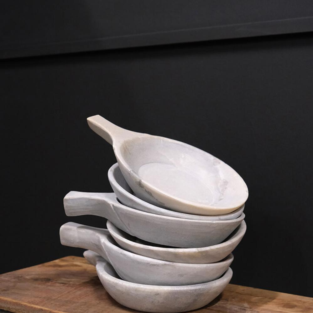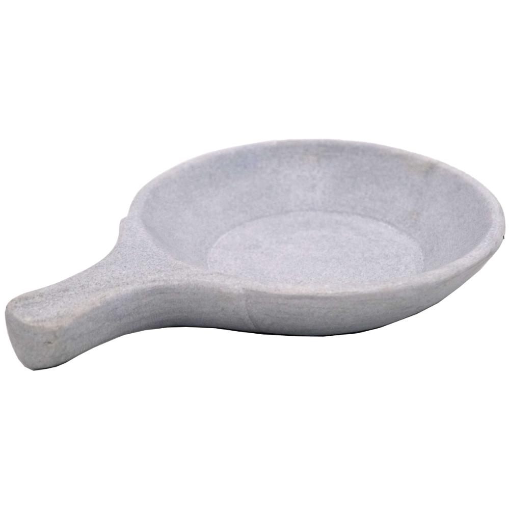 Schlichte, große Marmorschale mit Henkel aus hellem Marmor mit Marmorierung. Die Schale ist sowohl dekorativ als auch praktisch für z.B. Aufbewahrung von Schmuckstücken, Schlüsseln und anderen Kleinigkeiten oder um ein leckeres Gericht zu präsentieren.