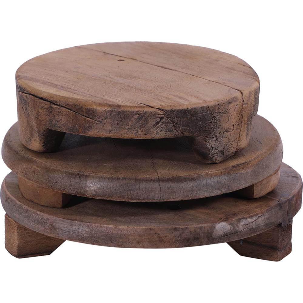 Alte Chapati-Platten aus Holz, die authentischen Charme und Geschichte ausstrahlen. Diese runden Bretter, ursprünglich in indischen Küchen verwendet, stehen auf kleinen Füßen. Sie variieren in Form und Patina, was von ihrem früheren Leben zeugt. Ideal für dekorative Zwecke, können sie als Basis zur Präsentation Ihrer Lieblingsgegenstände oder als kleine Podeste in Ihrer Einrichtung verwendet werden. Mit ihrem rohen und rustikalen Aussehen verleihen sie jedem Raum Funktionalität und Charakter.