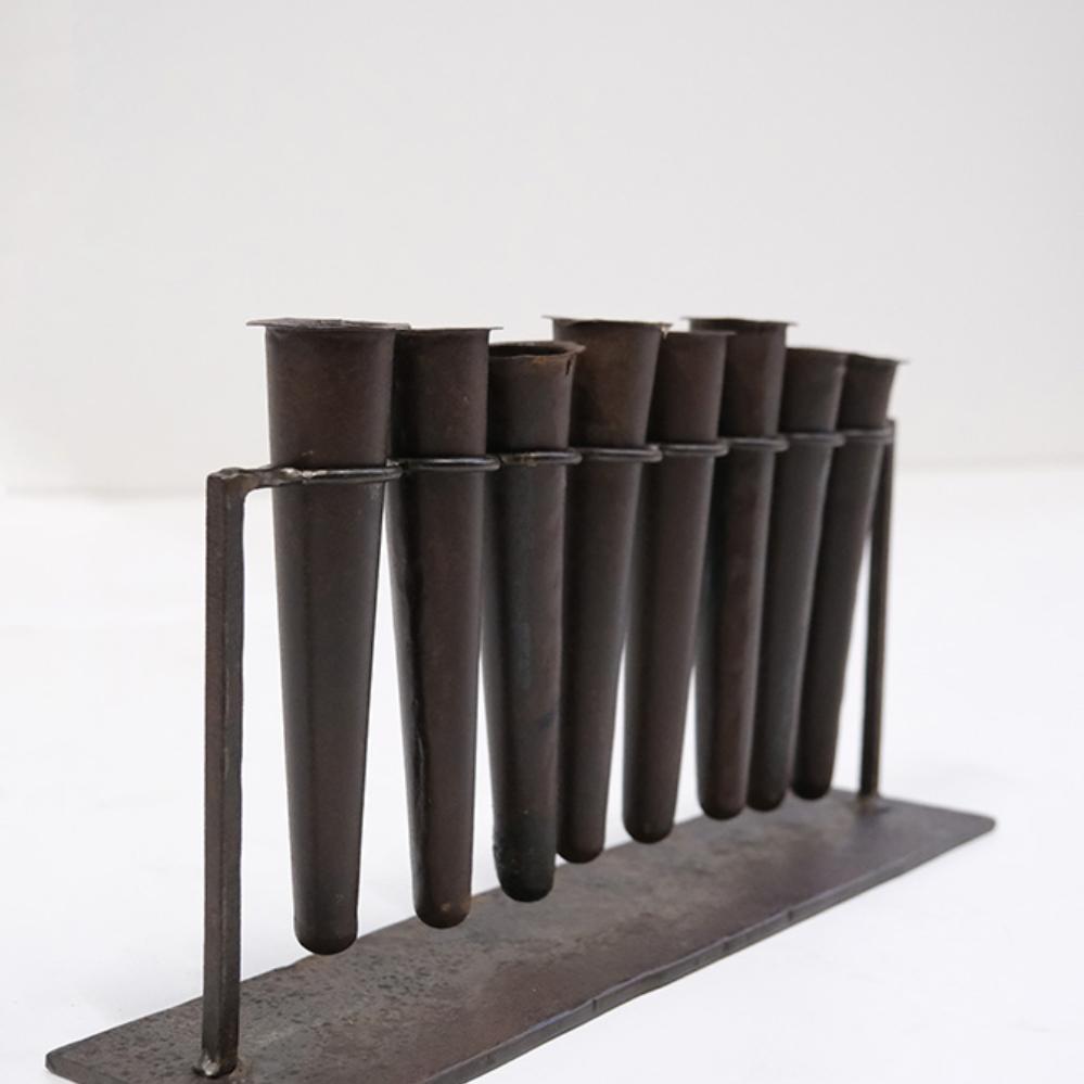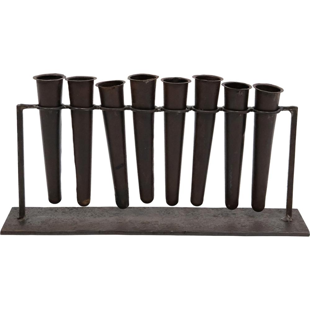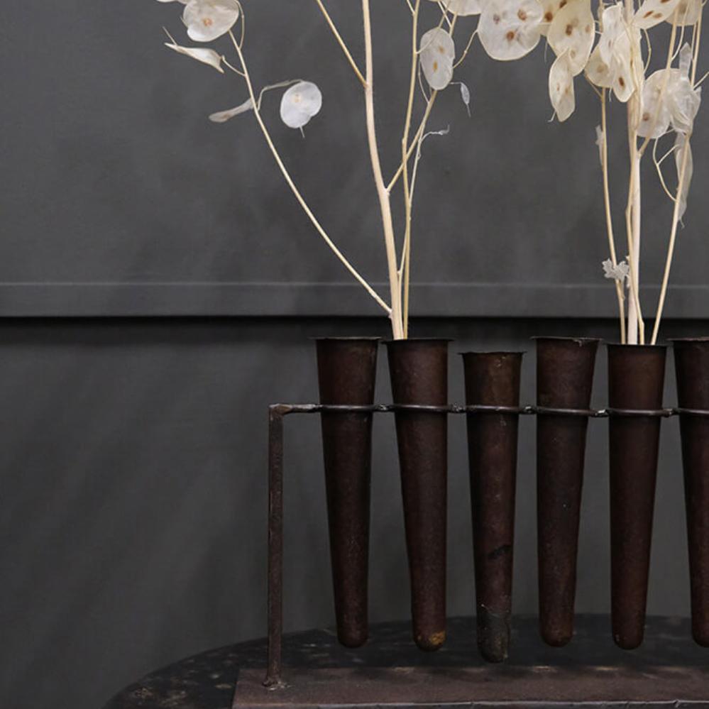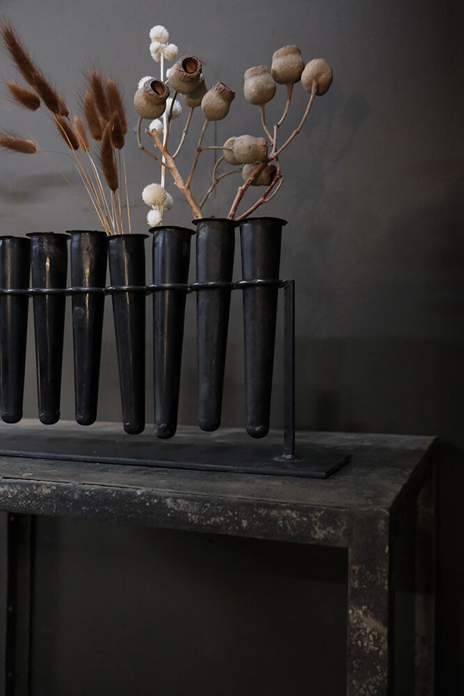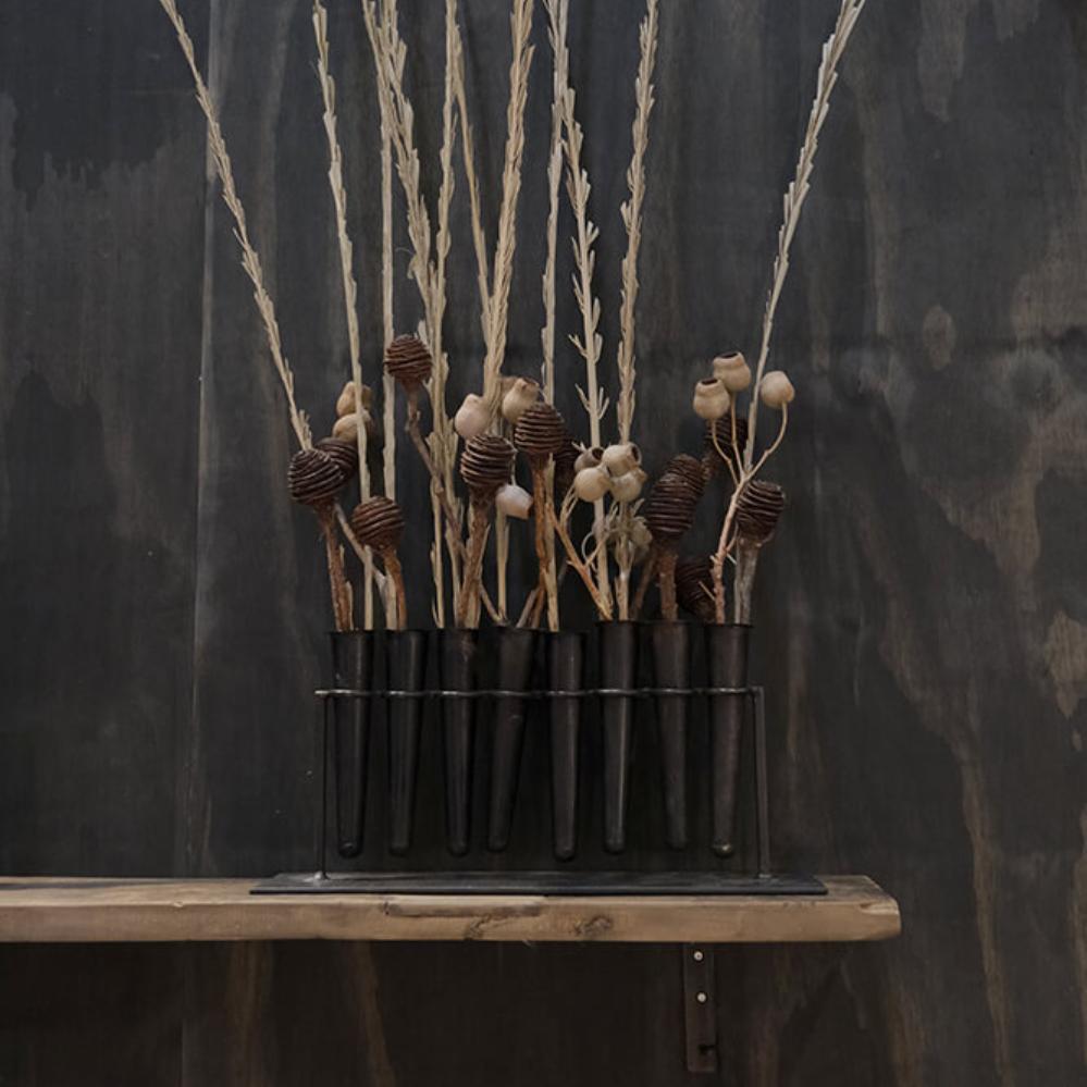 Robbie Ständer mit acht kleinen Metallvasen - eine unterhaltsame und vielseitige Möglichkeit, die Schönheit der Natur in Ihr Zuhause zu bringen. Die 8 kleinen Vasen wurden ursprünglich als Eisformen verwendet, sind aber jetzt upgecycelt, um Ihre feinen Blumenkreationen aufzubewahren. Der Ständer ist rustikal und industriell, und die acht kleinen Metallvasen bieten einen rustikalen Rahmen für Ihre Lieblingsblumen oder grünen Zweige.